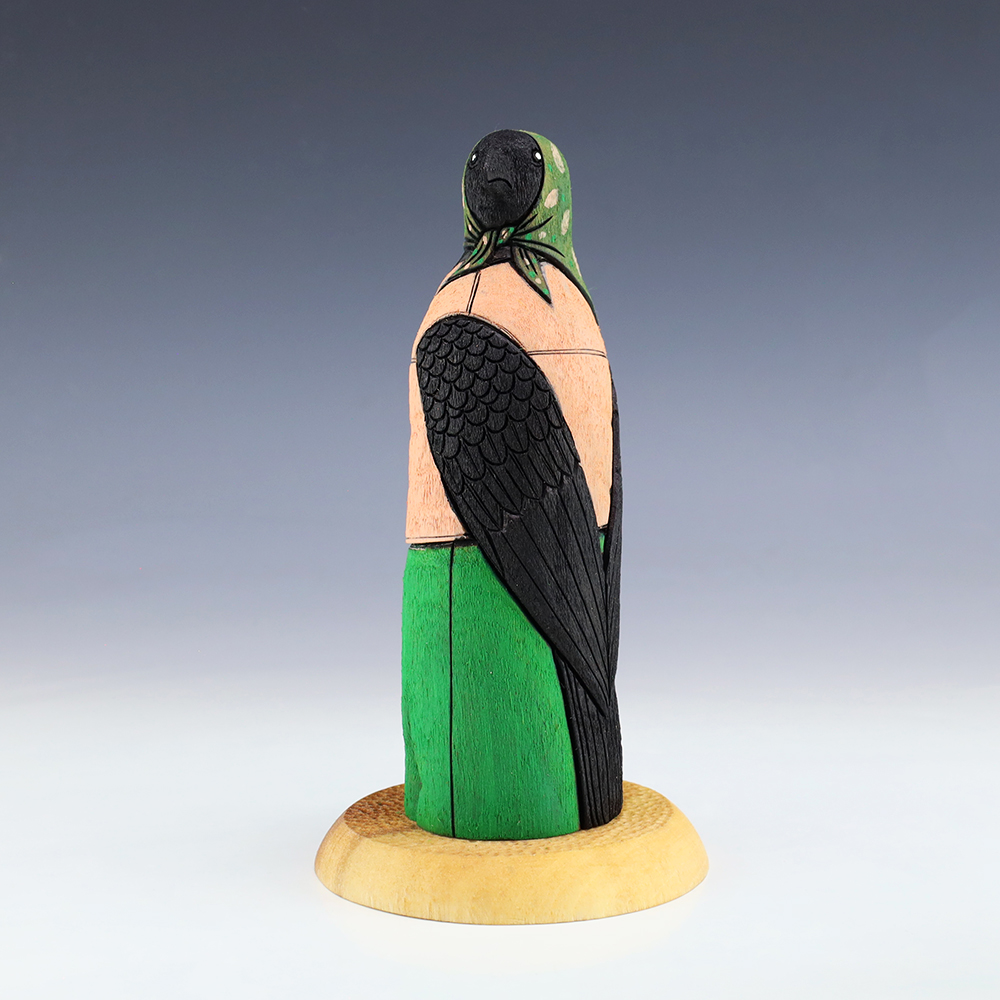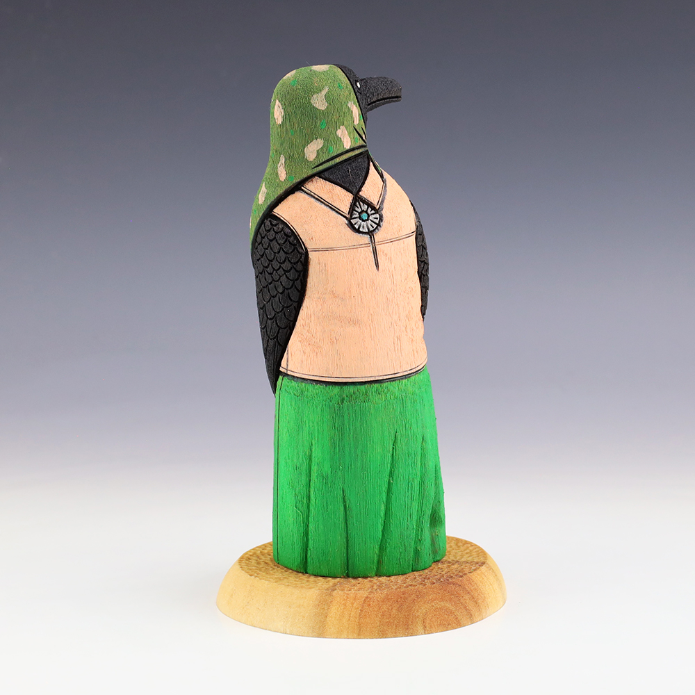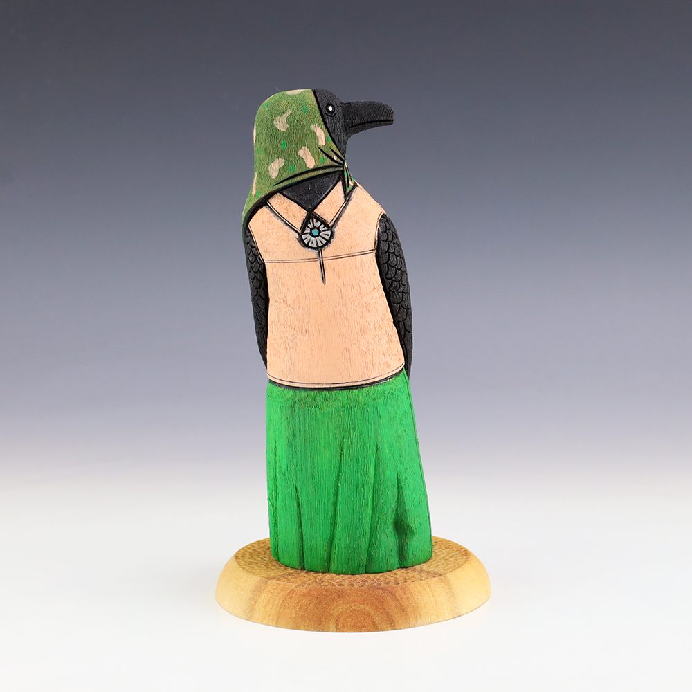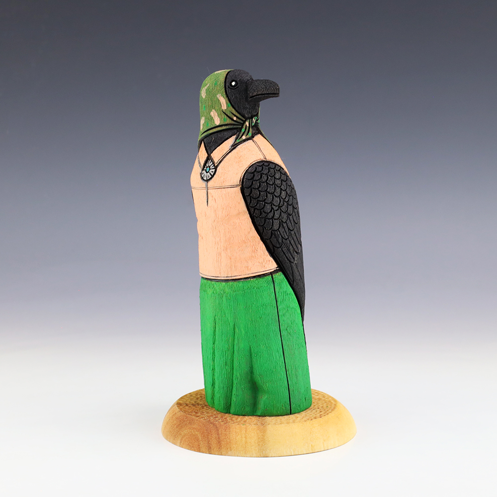 This stylish lady is hand crafted by Navajo folk art artists, Ray and Orleen Lansing. Carved out of cottonwood with an amazing amount of detail. This crow carving would make a wonderful addition to your Native American or Navajo Folk art collection. Signed 10 5/8” tall x 4 3/8” long...