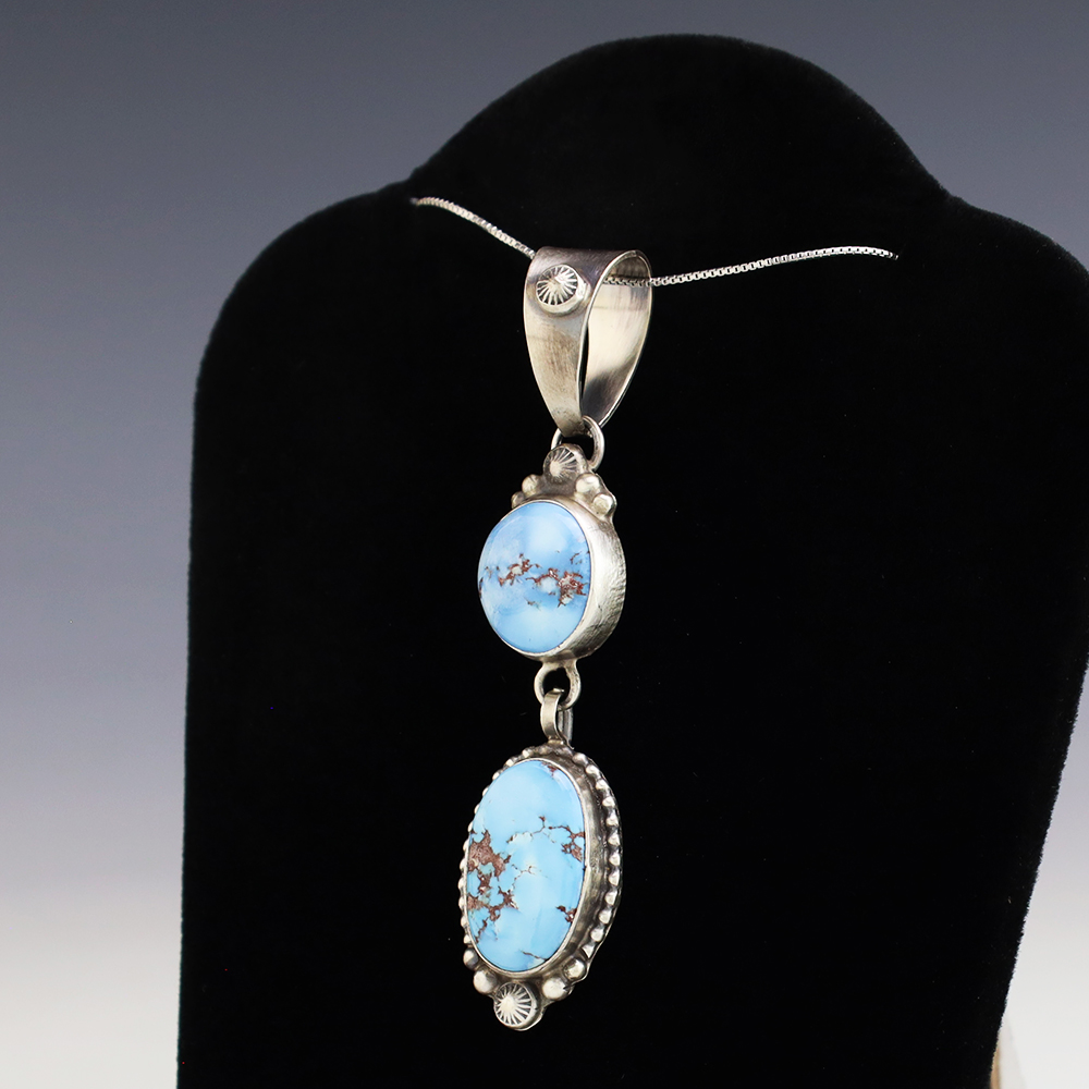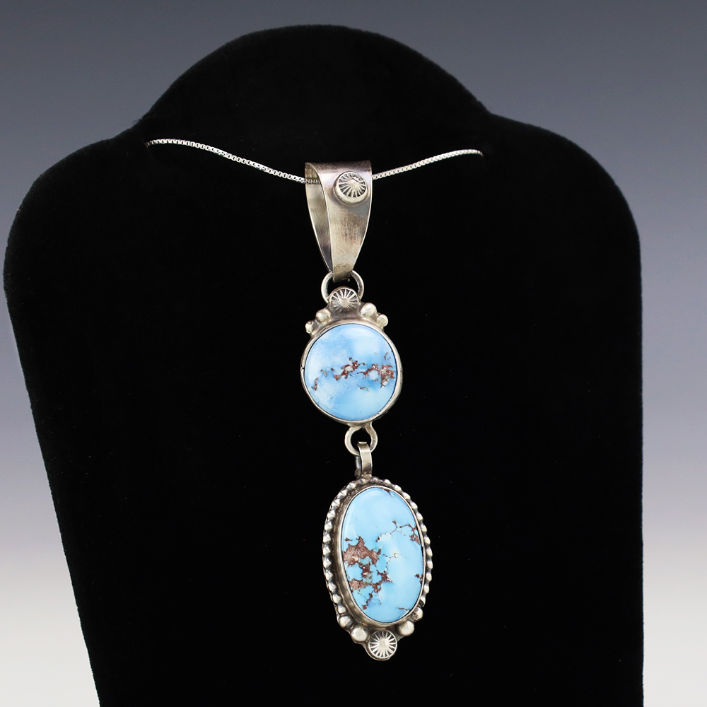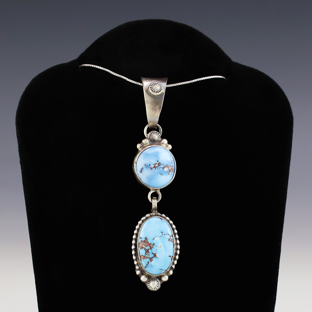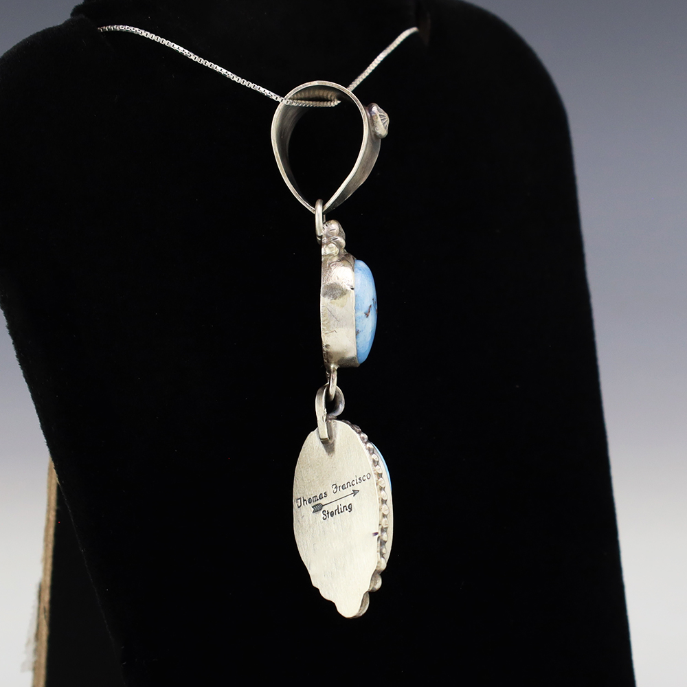 Great design! Navajo silversmith Thomas Francisco made this beautiful sterling silver and Golden Hills Turquoise pendant. A timeless beauty that you will enjoy for years to come. (Chain not included) Weighs 12 grams. Signed
