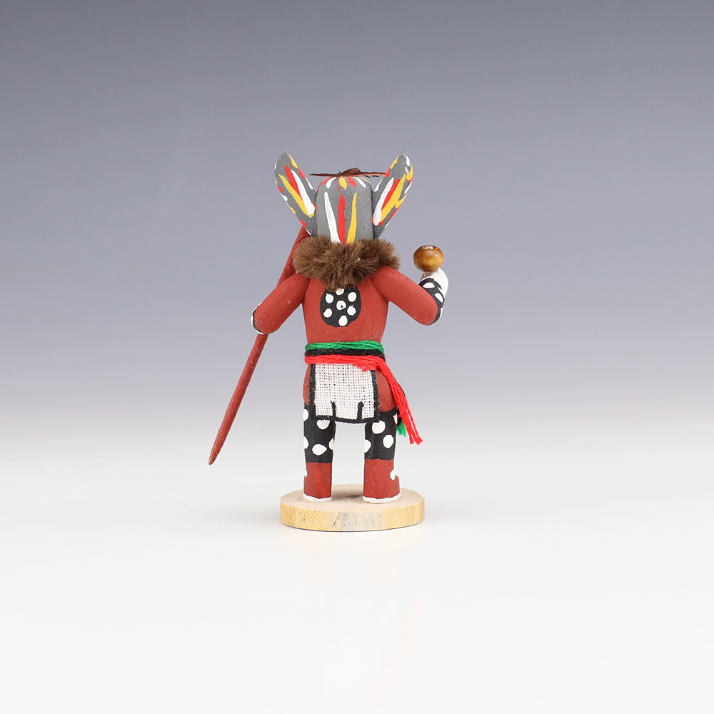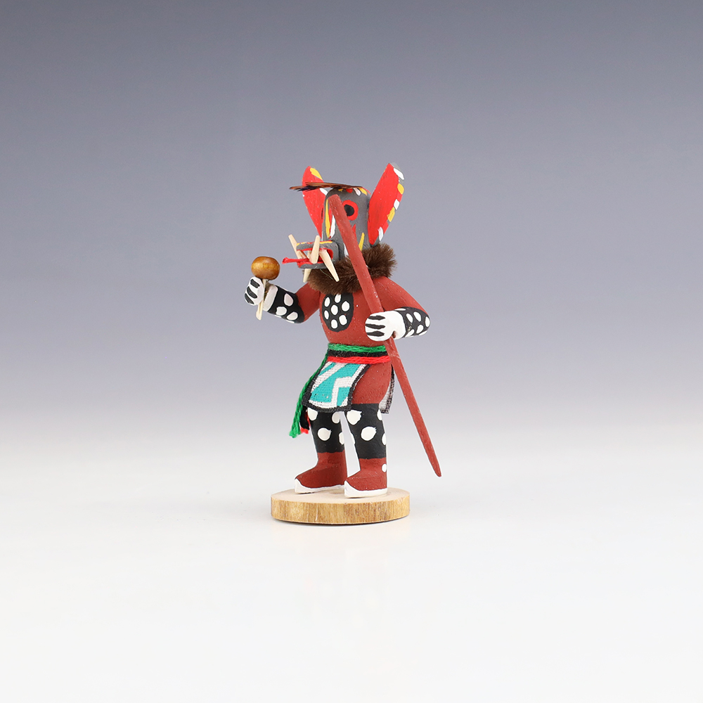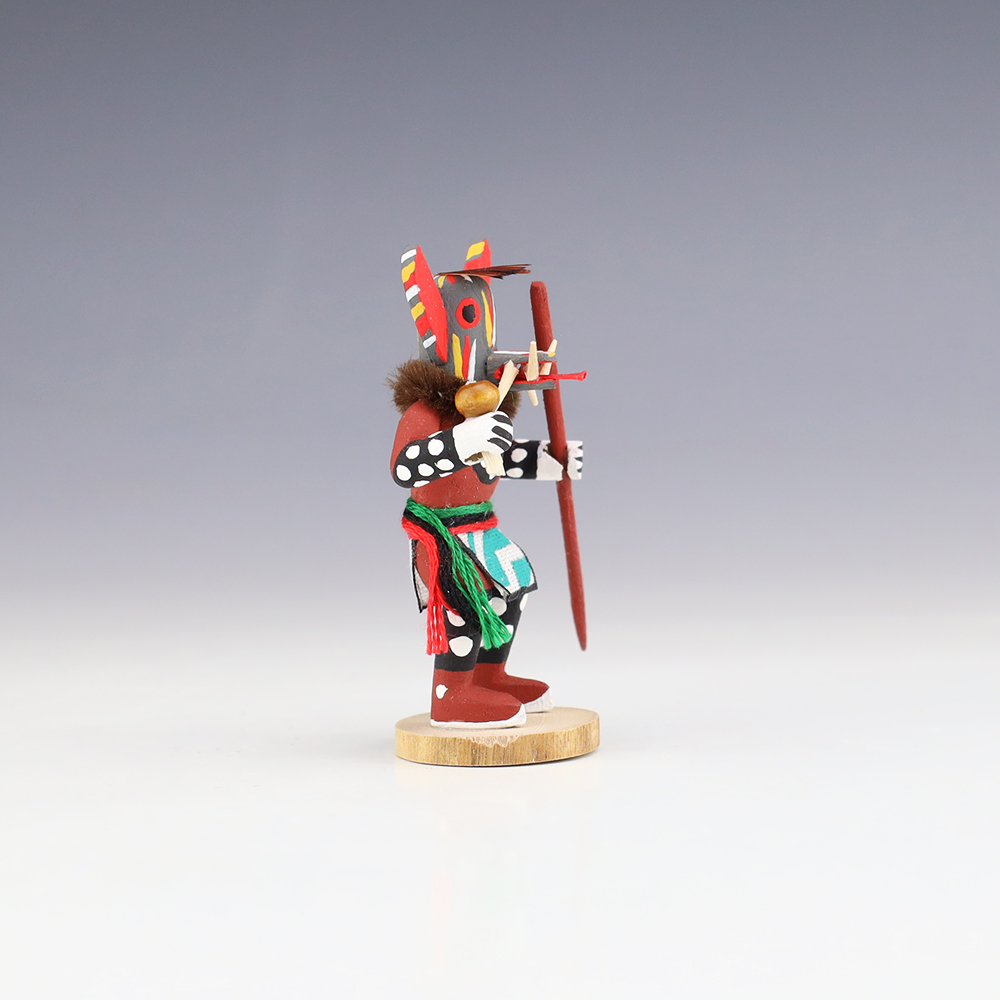 This Owl Kachina is wonderfully carved out of cotton wood. Hand made by Navajo artist Alfred Benally. A great addition to your Native American art or kachina collection. Signed 7″ tall x 4 3/8” long x 4” wide Artist card included The Owl Kachina is the leader of the warrior...