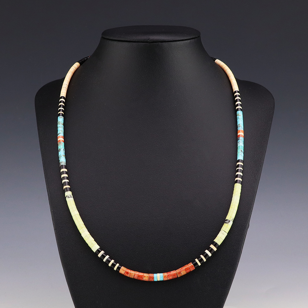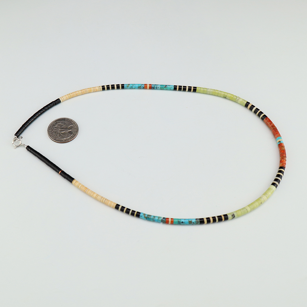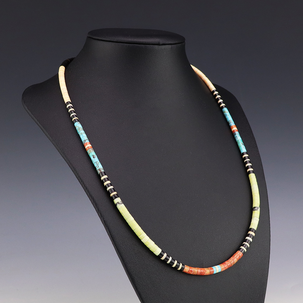 Kewa (Santo Domingo) artists are known for their heishi. The word “heishi“ means “shell” in the Keresan language. Traditionally Santo Domingo jewelry makers created their heishi jewelry out of shell. The shell is hand cut into a flat disc. Today, other stones that Santo Domingo artists cut in this manner, are also referred to as heishi. With modern tools and innovations, artists can create different styles of beads and use different gemstones like turquoise, coral, jet, serpentine, and spiny oyster.