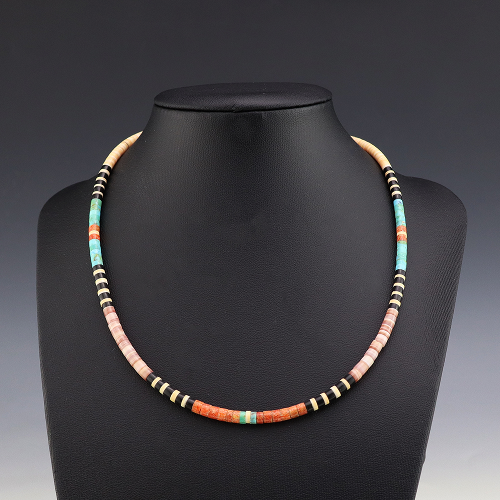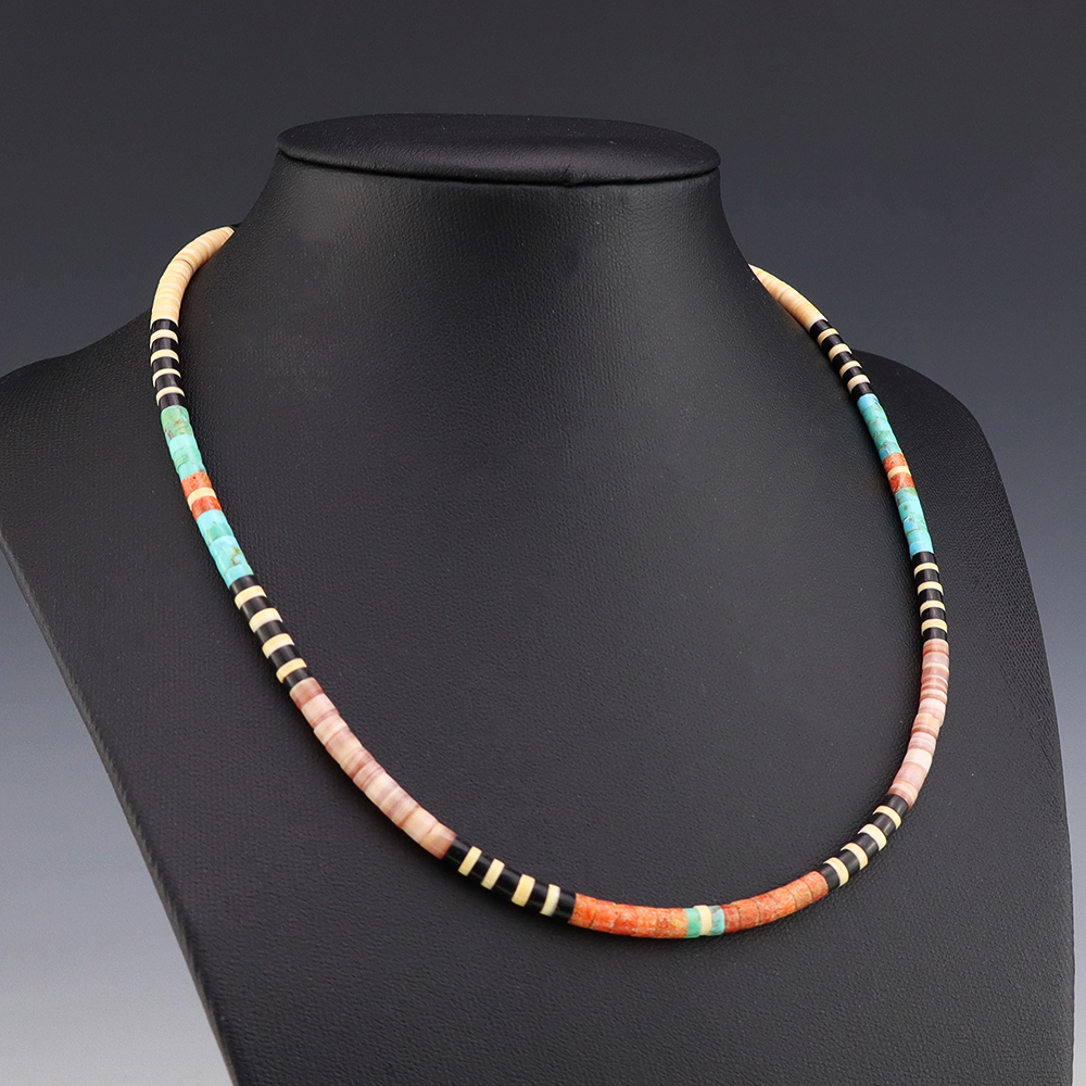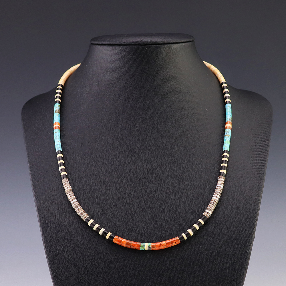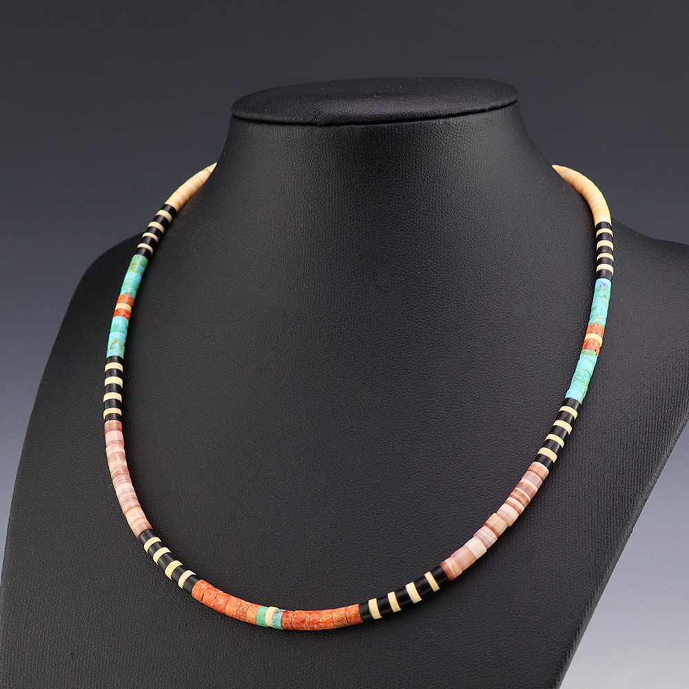 Kewa (Santo Domingo) artists are known for their heishi. The word “heishi“ means “shell” in the Keresan language. Traditionally Santo Domingo jewelry makers created their heishi jewelry out of shell. The shell is hand cut into a flat disc. Today, other stones that Santo Domingo artists cut in this manner, are also referred to as heishi. With modern tools and innovations, artists can create different styles of beads and use different gemstones like turquoise, coral, jet, serpentine, and spiny oyster.