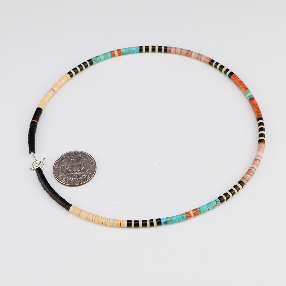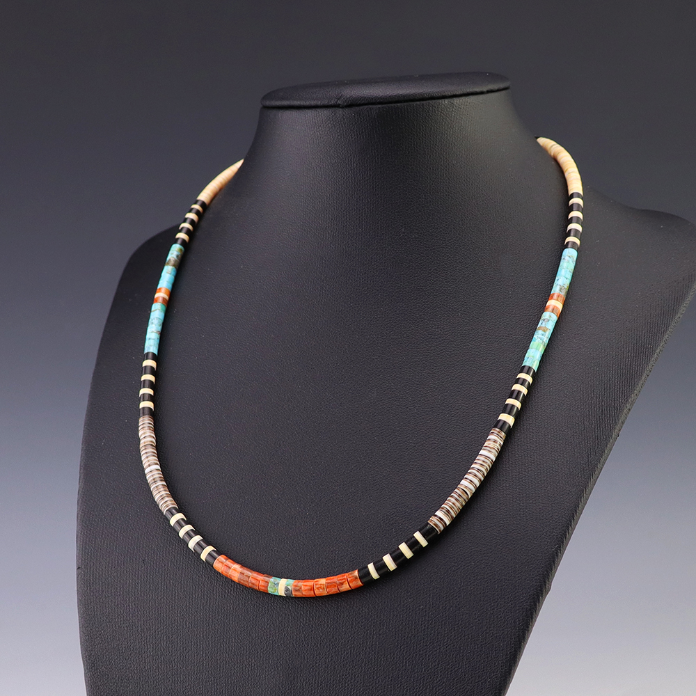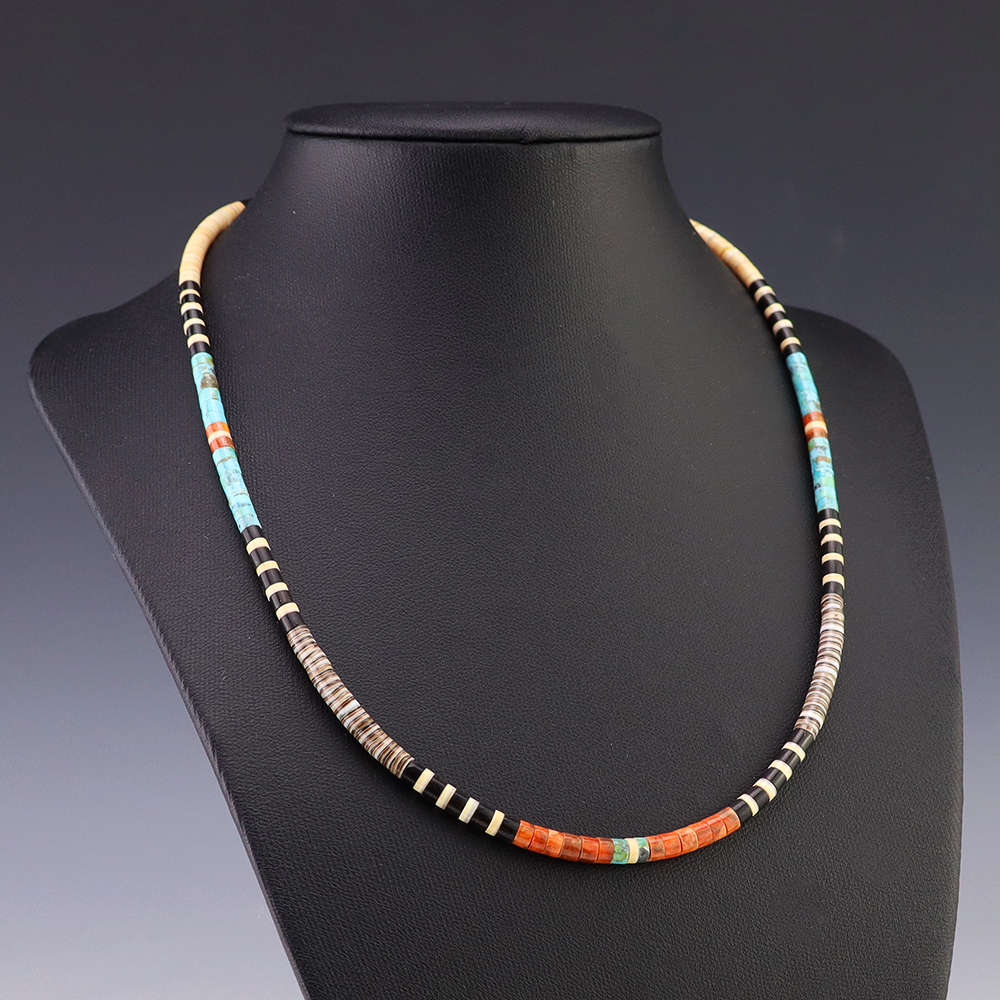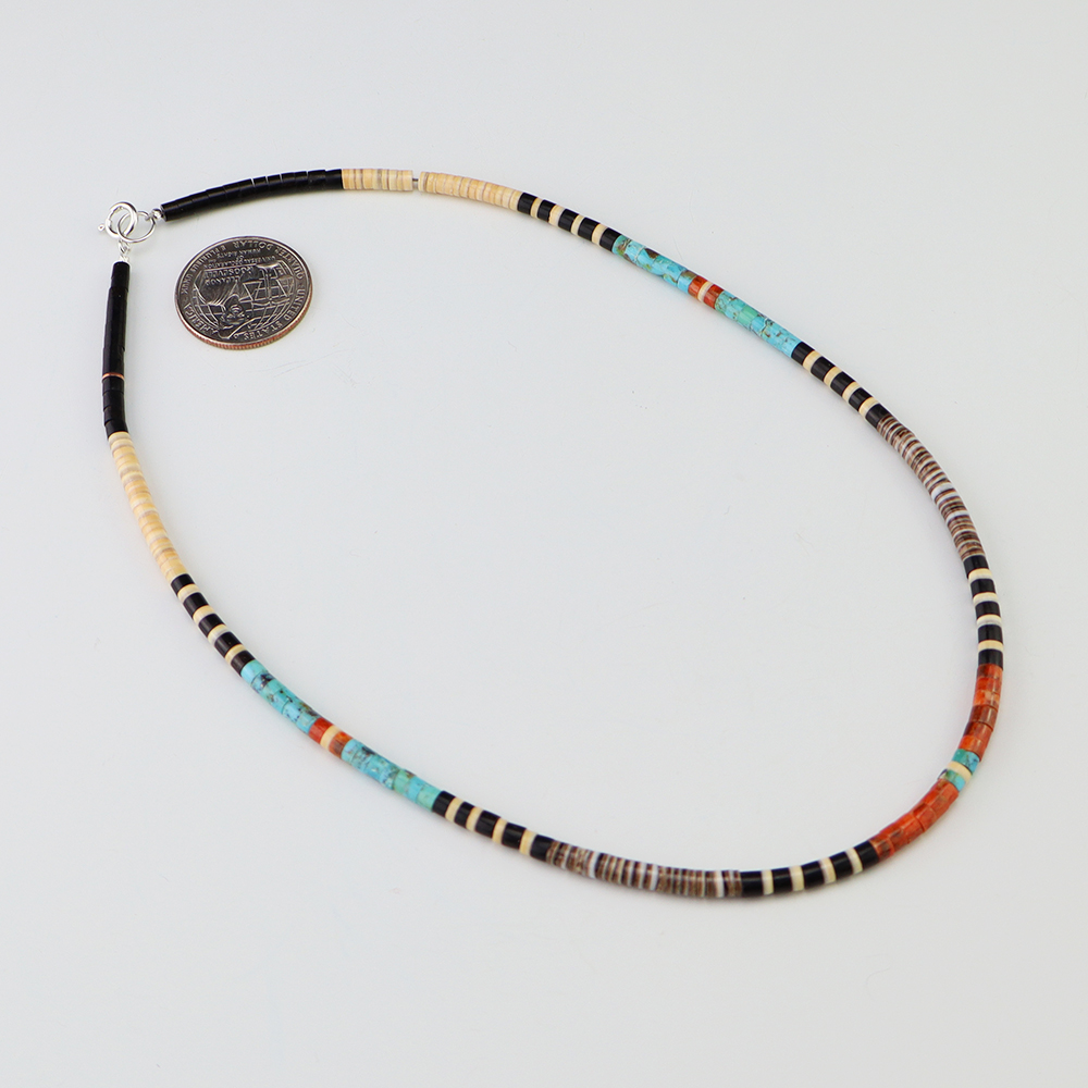 Kewa (Santo Domingo) artists are known for their heishi. The word “heishi“ means “shell” in the Keresan language. Traditionally Santo Domingo jewelry makers created their heishi jewelry out of shell. The shell is hand cut into a flat disc. Today, other stones that Santo Domingo artists cut in this manner, are also referred to as heishi. With modern tools and innovations, artists can create different styles of beads and use different gemstones like turquoise, coral, jet, serpentine, and spiny oyster.