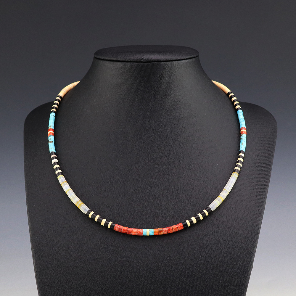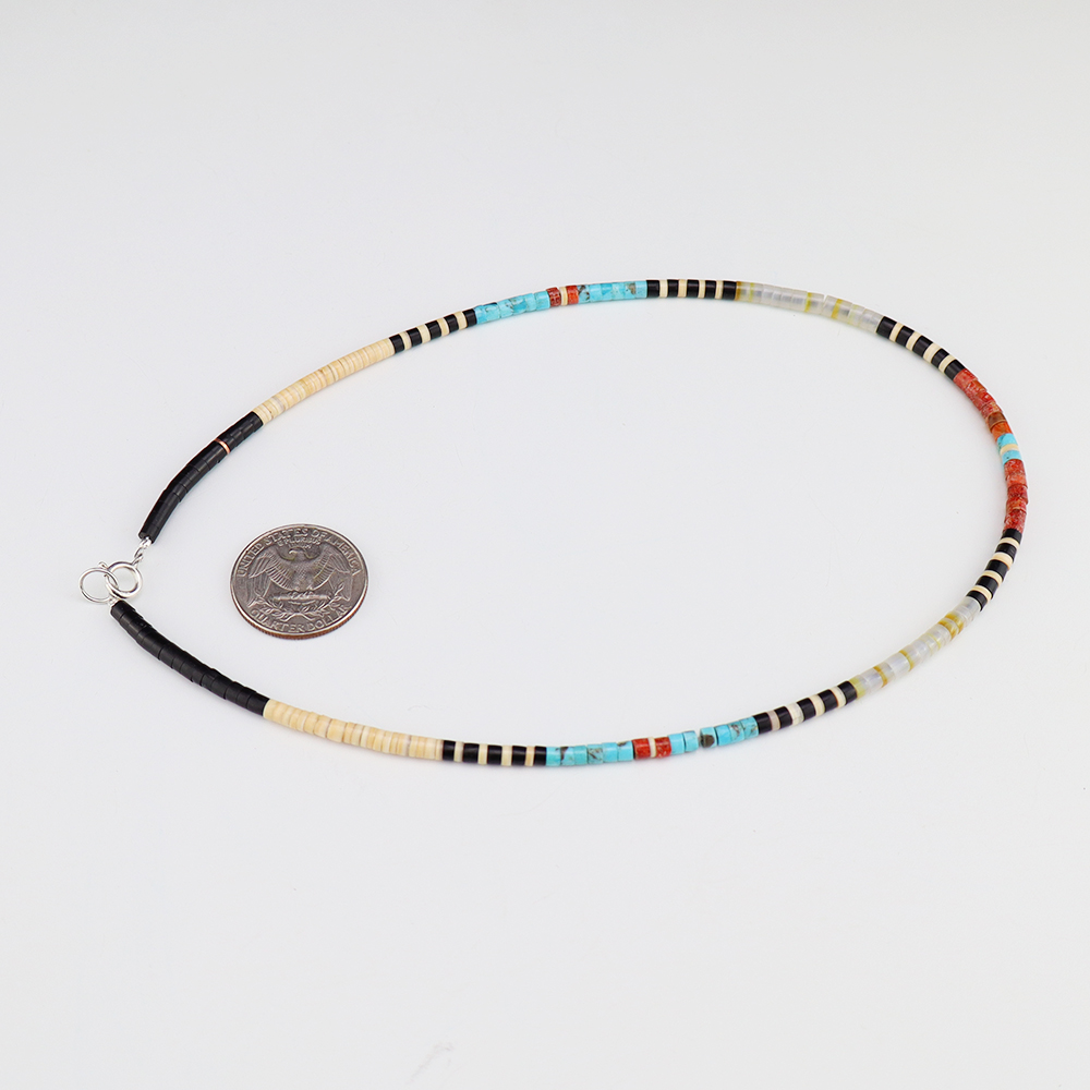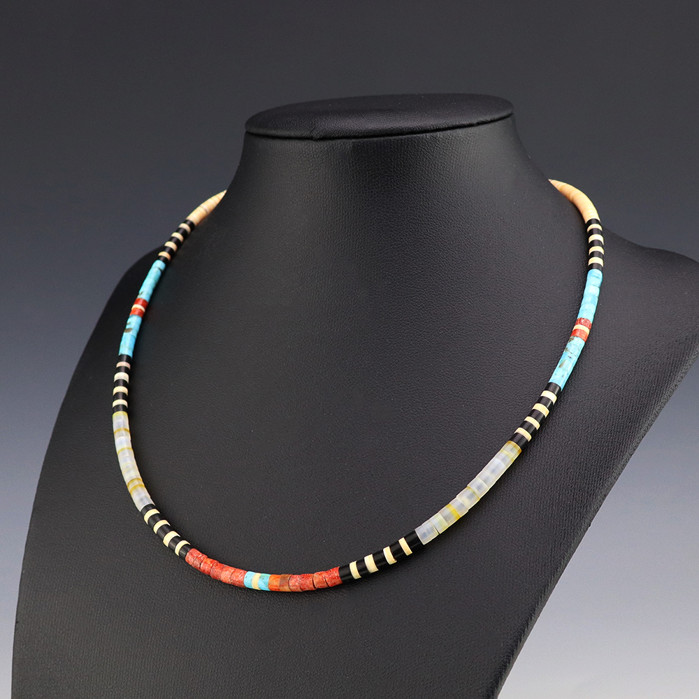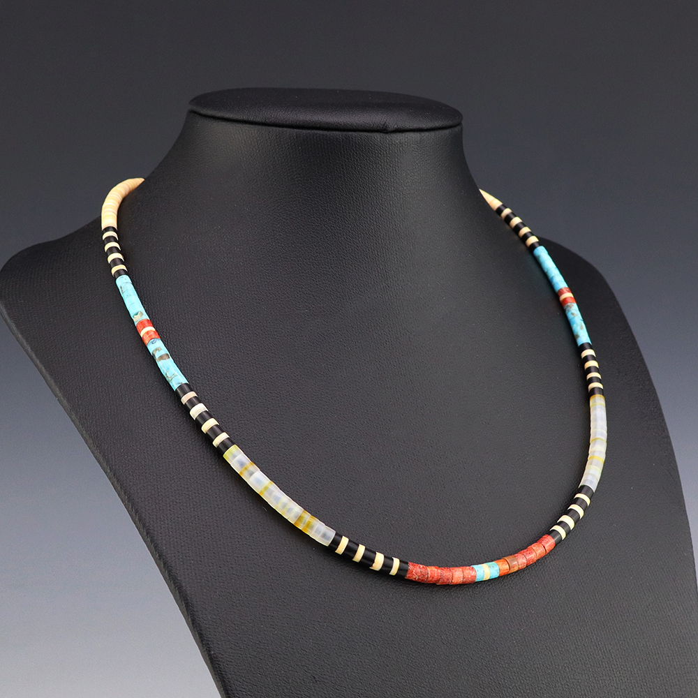 Kewa (Santo Domingo) artists are known for their heishi. The word “heishi“ means “shell” in the Keresan language. Traditionally Santo Domingo jewelry makers created their heishi jewelry out of shell. The shell is hand cut into a flat disc. Today, other stones that Santo Domingo artists cut in this manner, are also referred to as heishi. With modern tools and innovations, artists can create different styles of beads and use different gemstones like turquoise, coral, jet, serpentine, and spiny oyster.