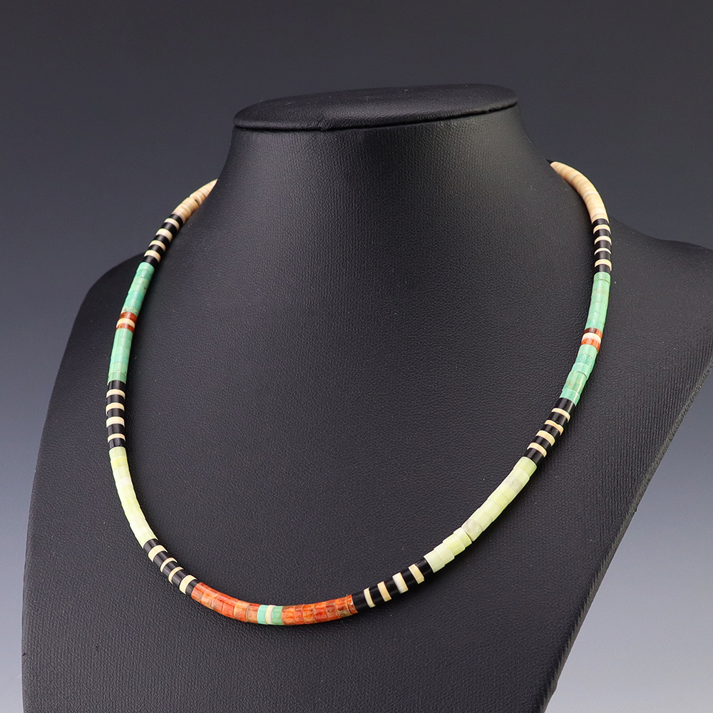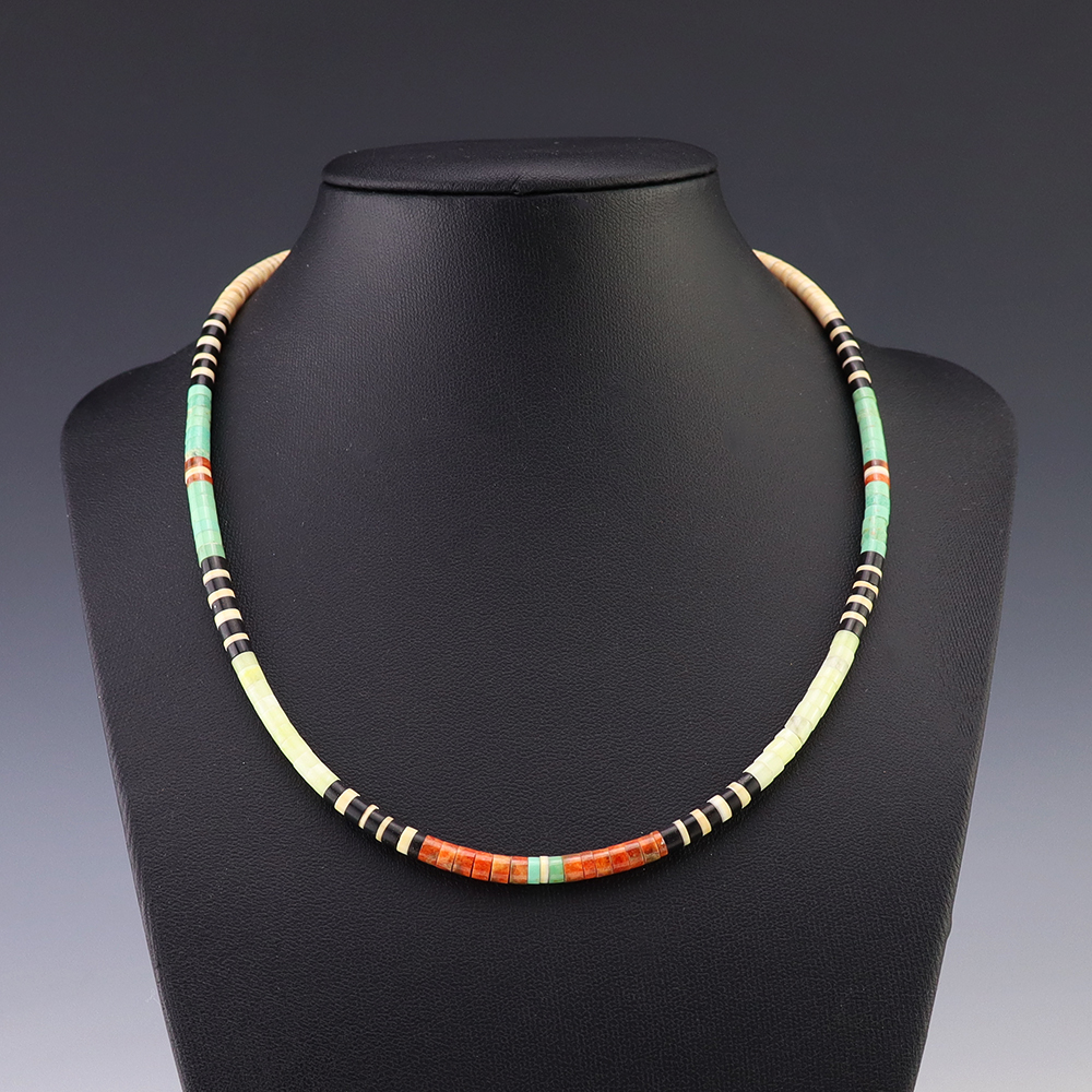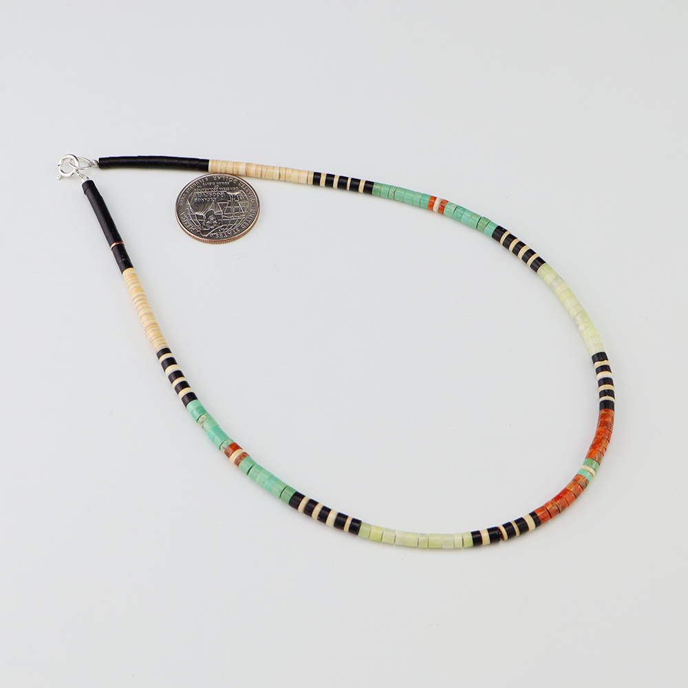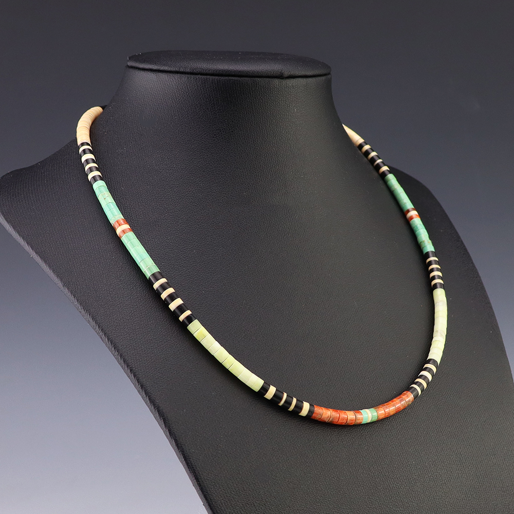 Kewa (Santo Domingo) artists are known for their heishi. The word “heishi“ means “shell” in the Keresan language. Traditionally Santo Domingo jewelry makers created their heishi jewelry out of shell. The shell is hand cut into a flat disc. Today, other stones that Santo Domingo artists cut in this manner, are also referred to as heishi. With modern tools and innovations, artists can create different styles of beads and use different gemstones like turquoise, coral, jet, serpentine, and spiny oyster.