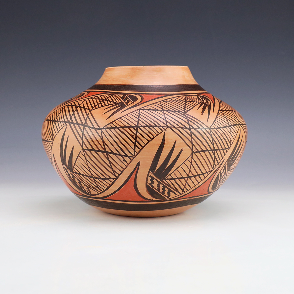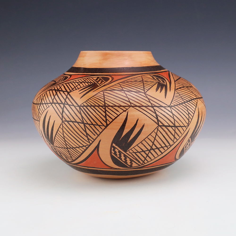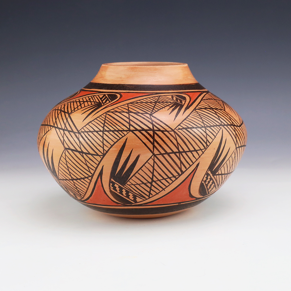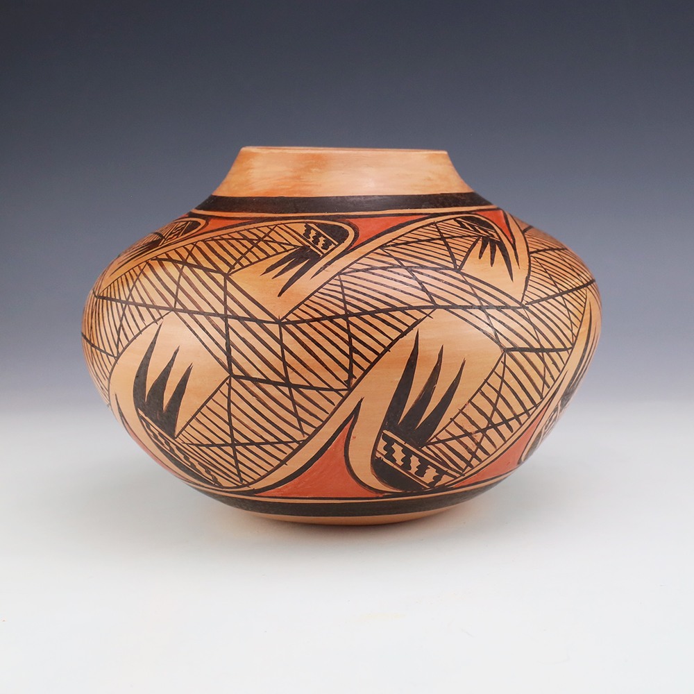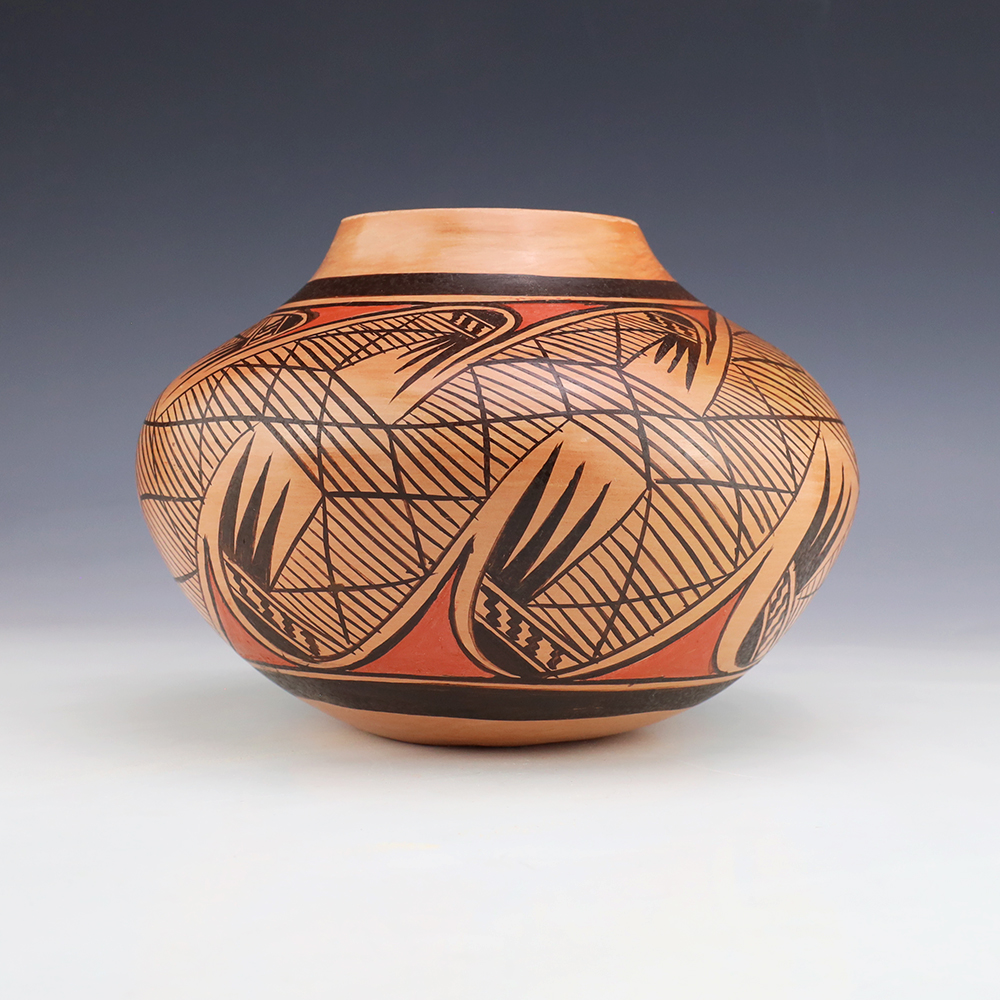 The Hopi pueblos are located in Northern Arizona, atop three large mesas. On First Mesa there is a long tradition of pottery making, that was ultimately shaped by the master potter Nampeyo at the turn of the 20th century. Nampeyo is credited with the revival of a prehistoric Hopi pottery type named Sikyatki, after an archaeological site near First Mesa. In addition to the distinct designs that Nampeyo revived, Hopi pottery is also known for it wonderful blushes. The blushes are created by a combination of the natural iron rich clay and the pit firing technique. It is the tonal yellow to dark orange surface of Hopi pottery that distinguishes it from the other Pueblos.