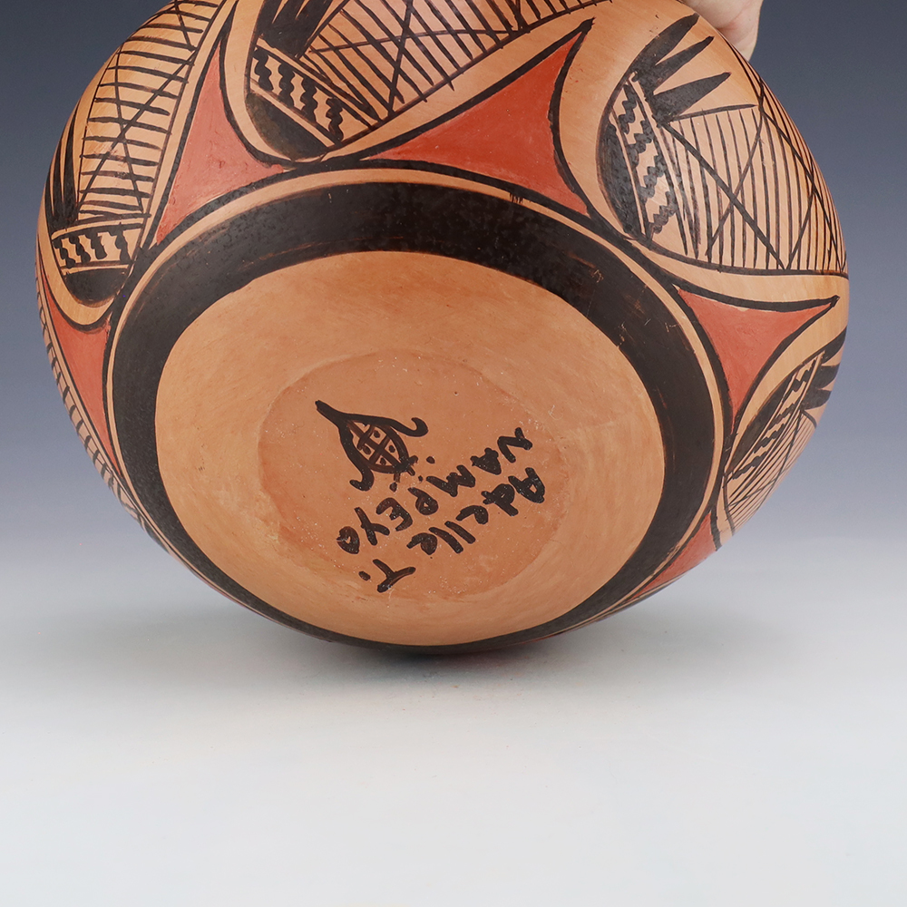 Hopi artist Adelle Nampeyo was born in 1959. She is one of the great granddaughters of the famous “Nampeyo” known for reviving and expanding the beautiful ancient style of pottery called Sikyatki. She learned pottery making from her mother, Elva Nampeyo, and has been making pottery since 1979. Adelle specializes in the handmade traditional Sikyatki polychrome pottery for which her family is famous. She now teaches her children the art of her ancestors so they can continue in her footsteps. This exquisite pottery vase was traditionally hand coiled and fired by Adelle. A unique addition to any pottery or Native American art collection. Signed