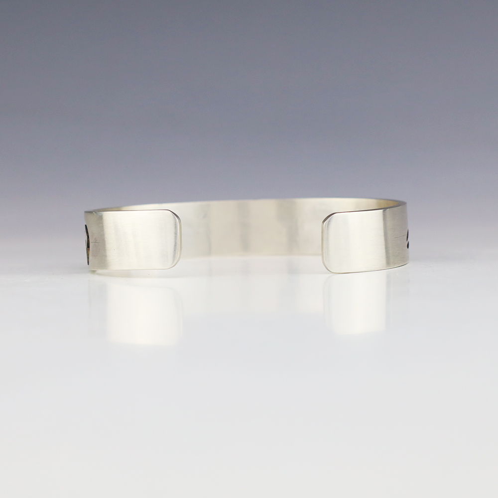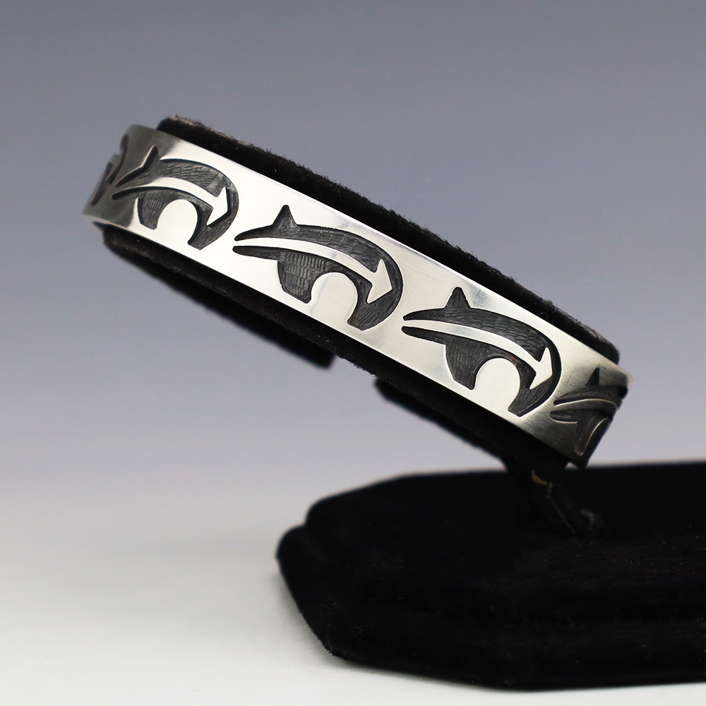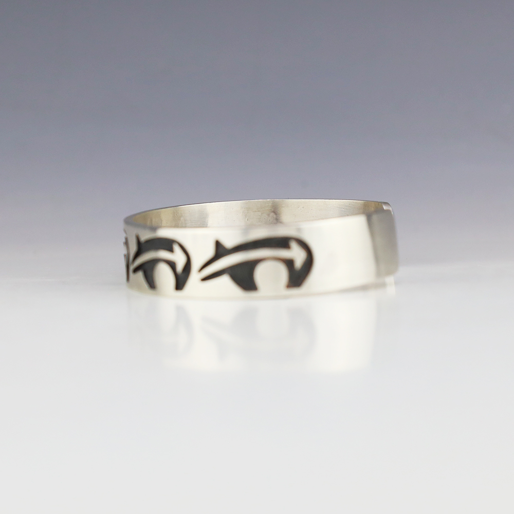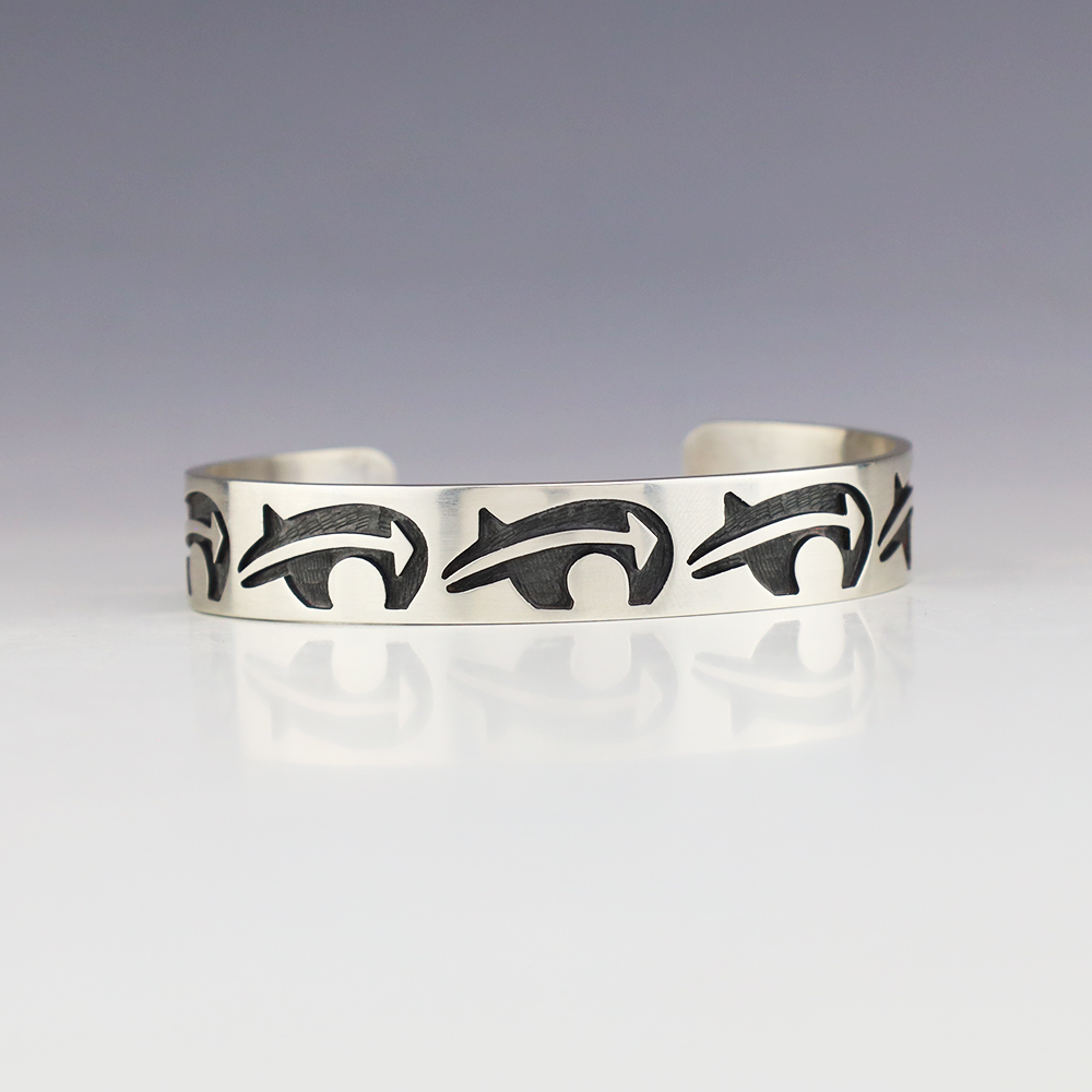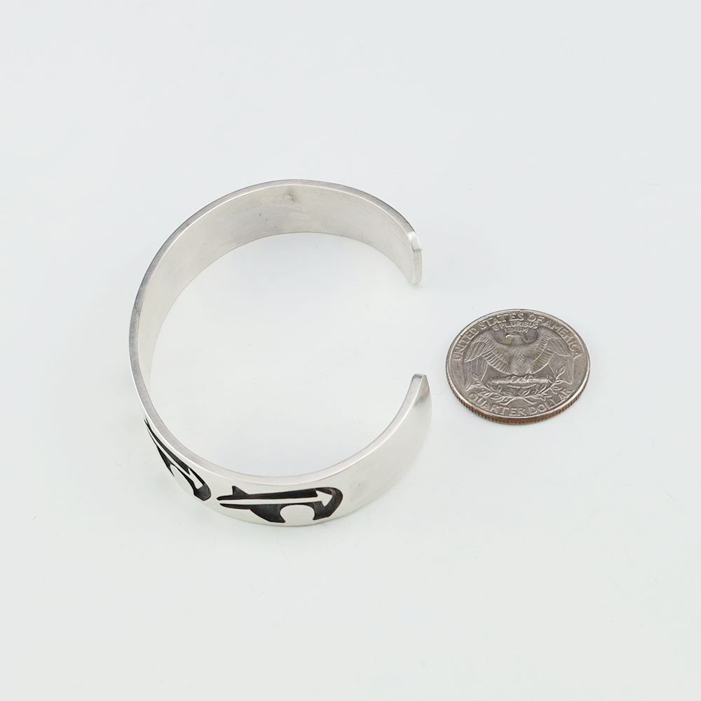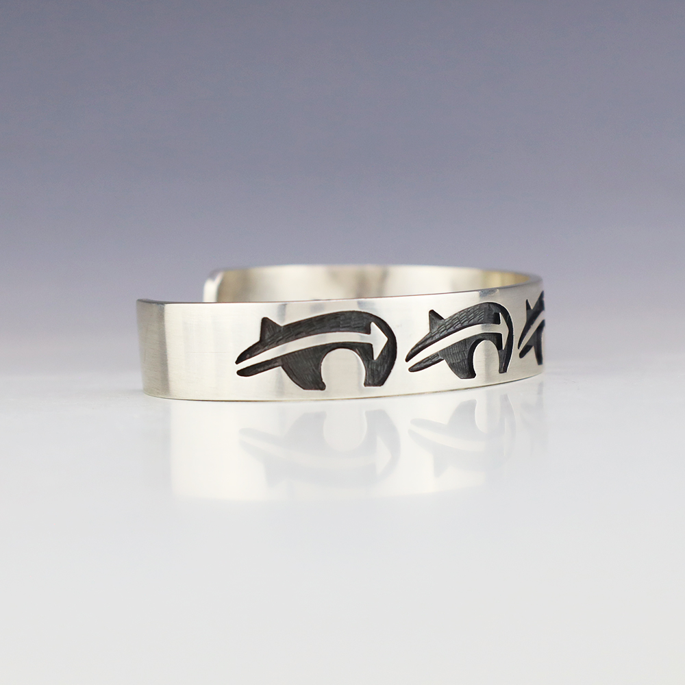 Hopi artist Darren Seweyestewa created this incredibly detailed bracelet through the overlay technique. Hopi overlay is constructed from two layers of sterling silver. A design is cut out with a jeweler’s saw by hand. This top design layer is then silver soldered to another sheet, the bottom layer, of silver. Texturing is added to the bottom layer in all the open areas of the design using a hammer and a small punch. The piece is then formed to its final shape and size. The bottom layer is then oxidized to enhance the design. A stunning addition of high-quality craftsmanship to your jewelry wardrobe. Weighs 28 grams. The entire inner circumference is about 7”, including 1 1/16” opening. (Fits a 7″ wrist). Signed.