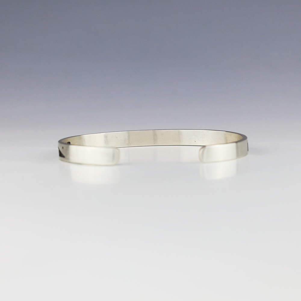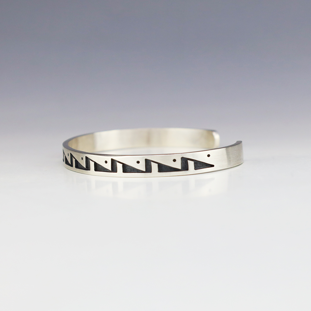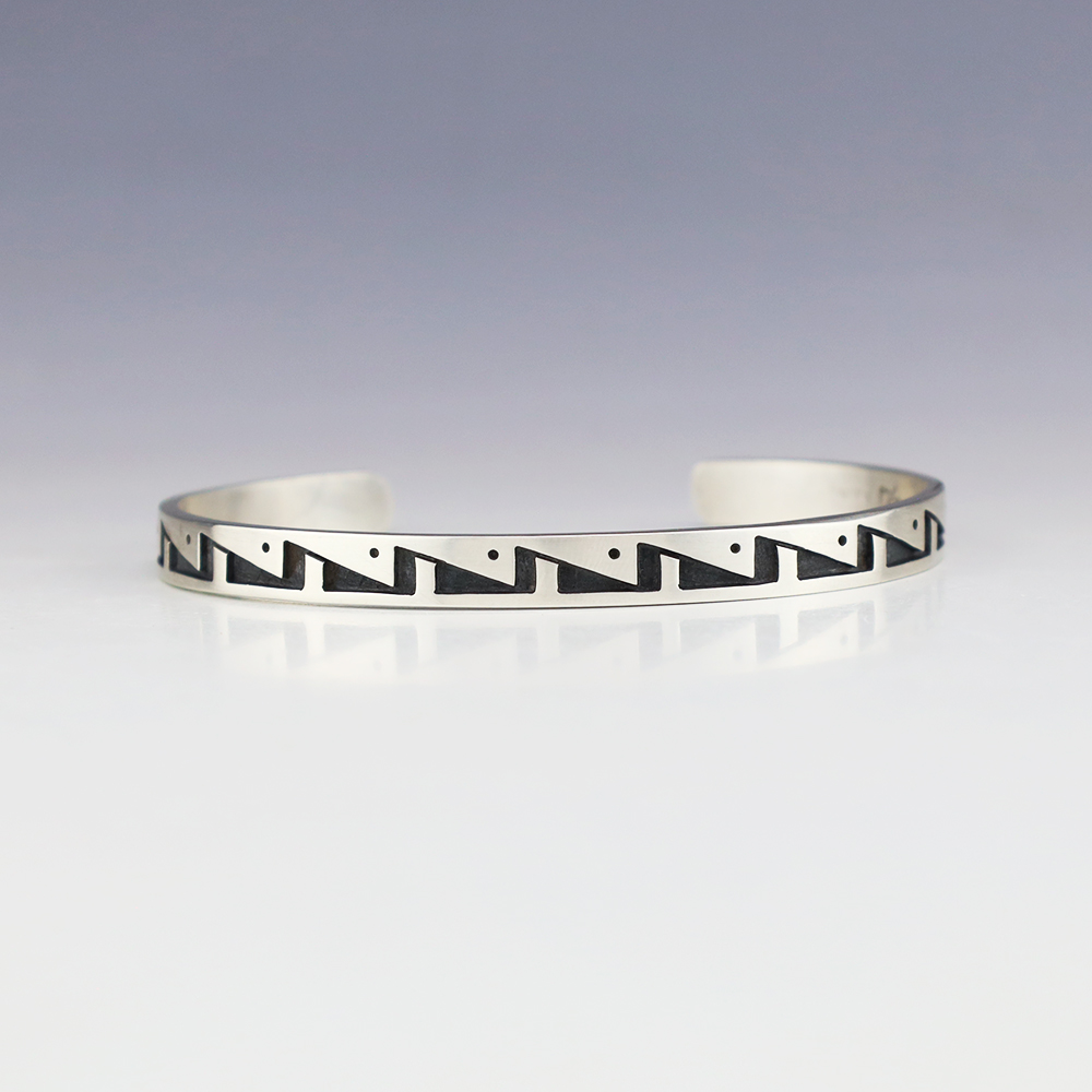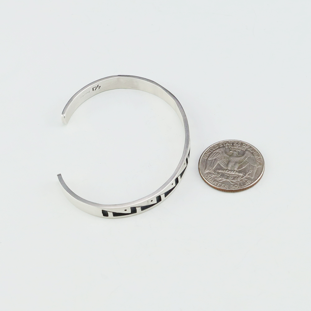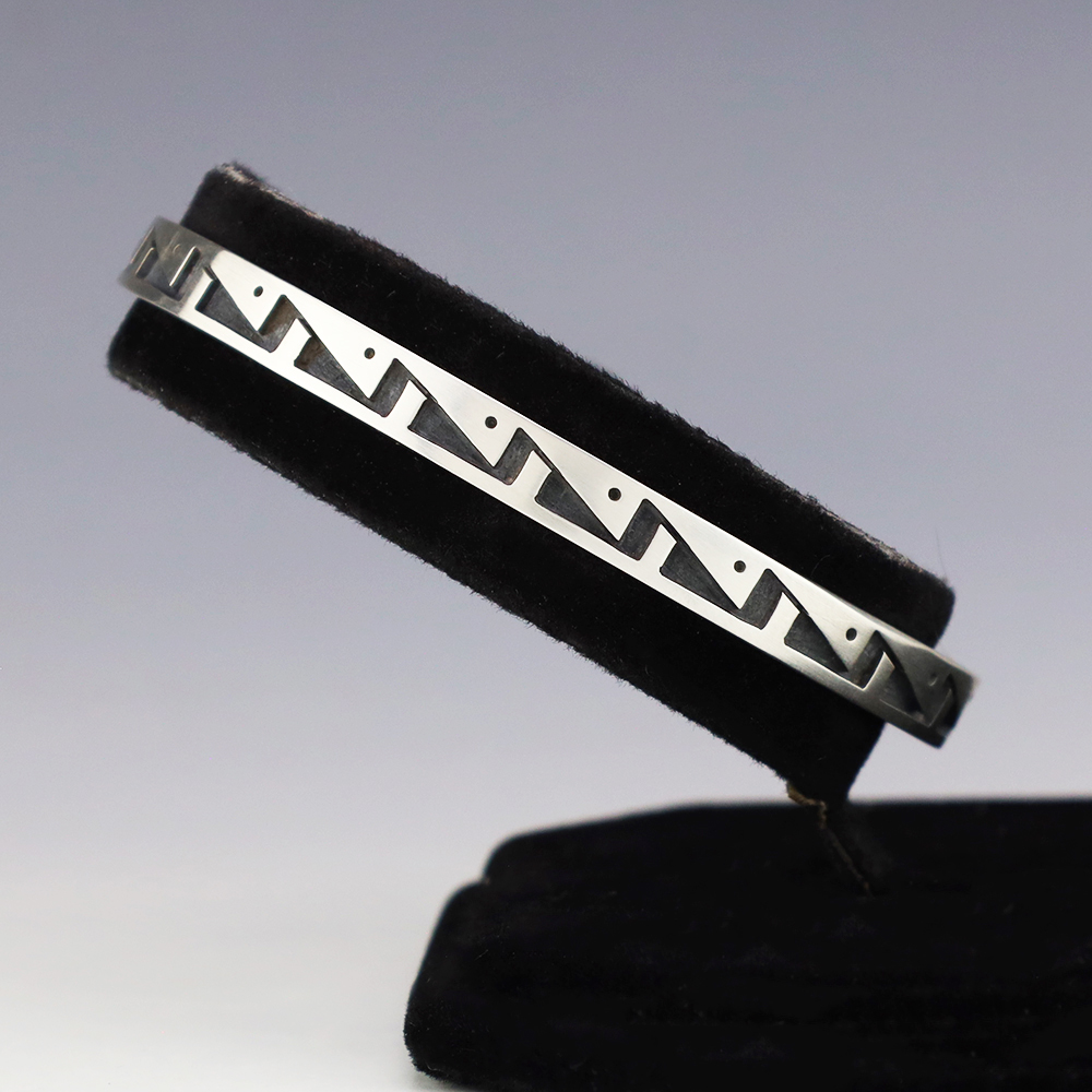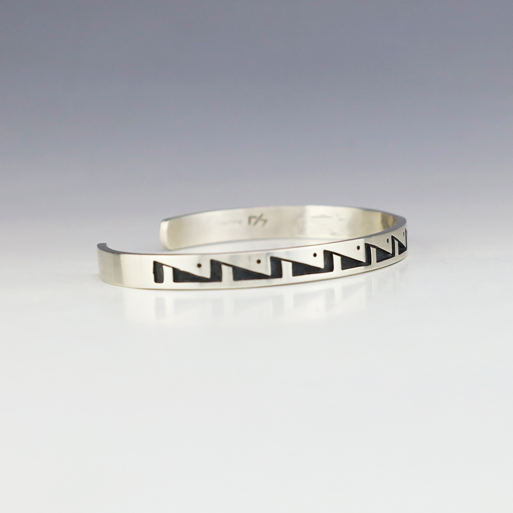 Hopi artist Darren Seweyestewa created this incredibly detailed bracelet through the overlay technique. Hopi overlay is constructed from two layers of sterling silver. A design is cut out with a jeweler’s saw by hand. This top design layer is then silver soldered to another sheet, the bottom layer, of silver. Texturing is added to the bottom layer in all the open areas of the design using a hammer and a small punch. The piece is then formed to its final shape and size. The bottom layer is then oxidized to enhance the design. A stunning addition of high-quality craftsmanship to your jewelry wardrobe. Weighs 14 grams. The entire inner circumference is about 7”, including 1 1/8” opening. (Fits a 7″ wrist). Signed.