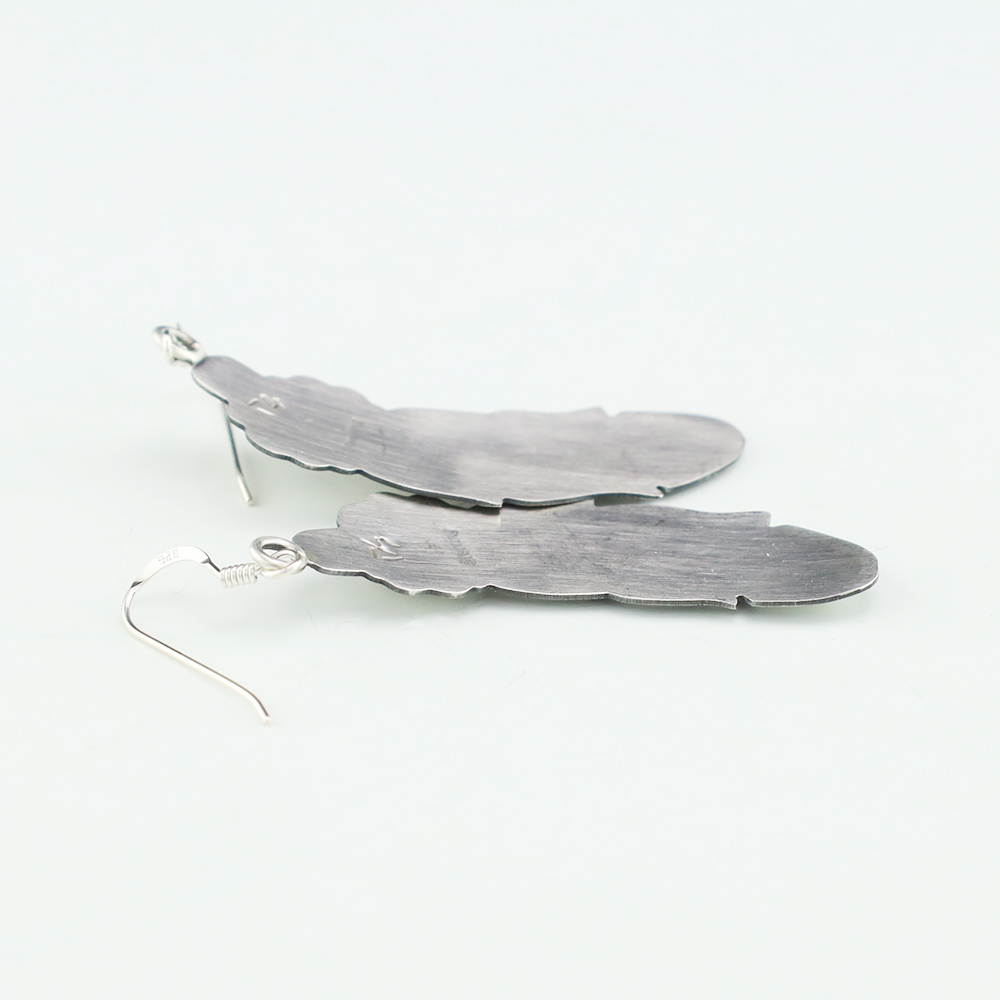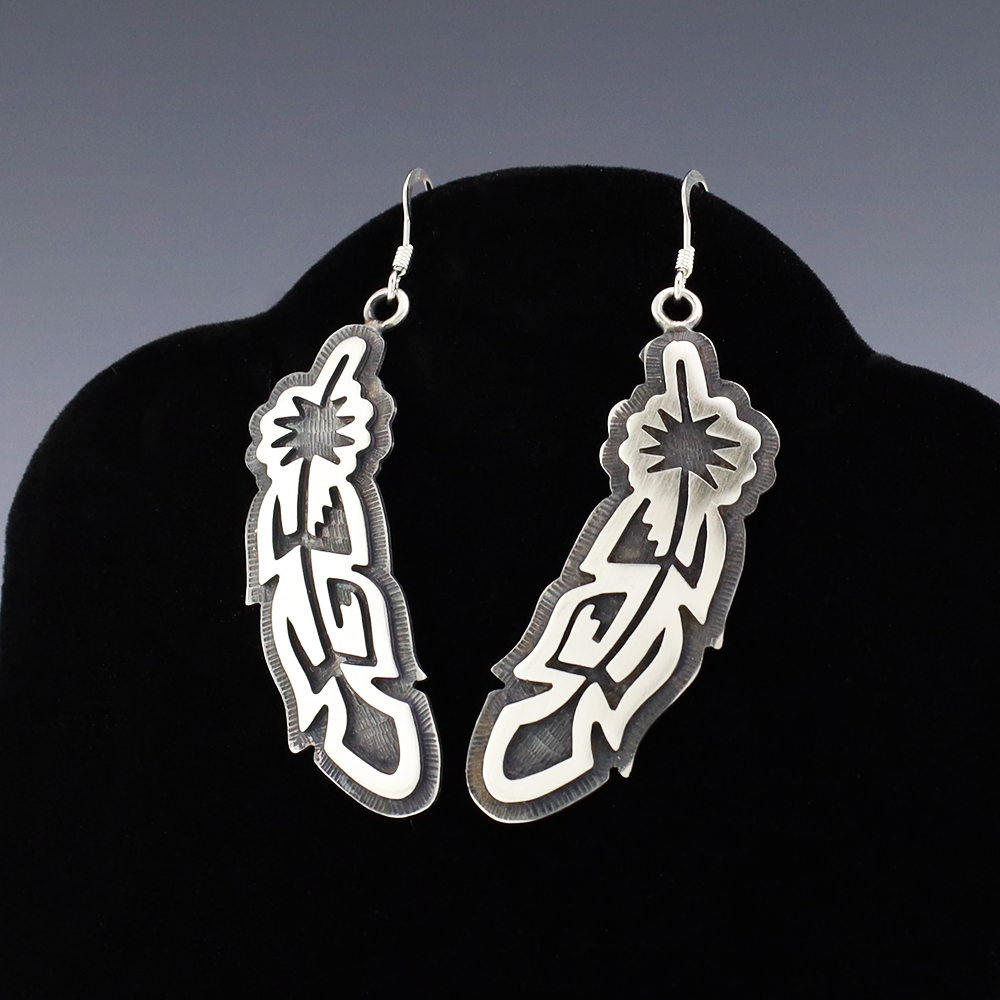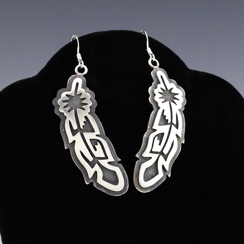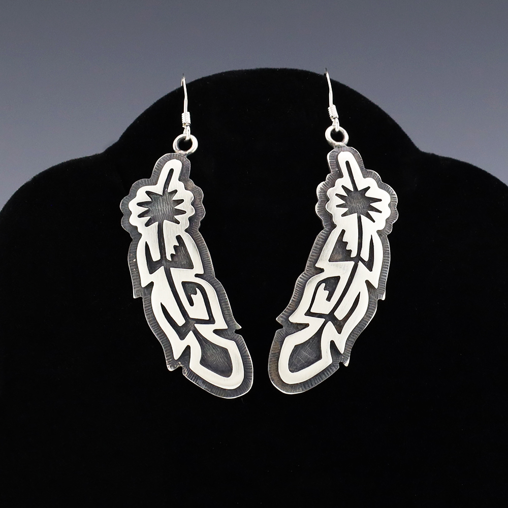Hopi artist, Darren Seweyestewa created these wonderful earrings through the overlay technique. Hopi overlay is constructed from two layers of sterling silver. A design is cut out with a jeweler’s saw by hand. This top design layer is then silver soldered to another sheet, the bottom layer, of silver. Texturing is added to the bottom layer in all the open areas of the design using a hammer and a small punch. The piece is then formed to its final shape and size. The bottom layer is then oxidized to enhance the design. A unique addition of high-quality craftsmanship to your jewelry wardrobe. Weighs 8 grams. Signed