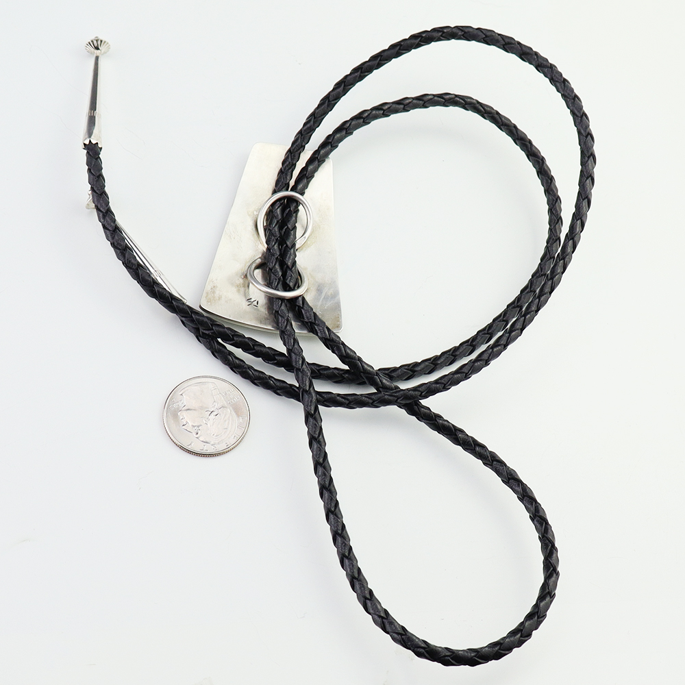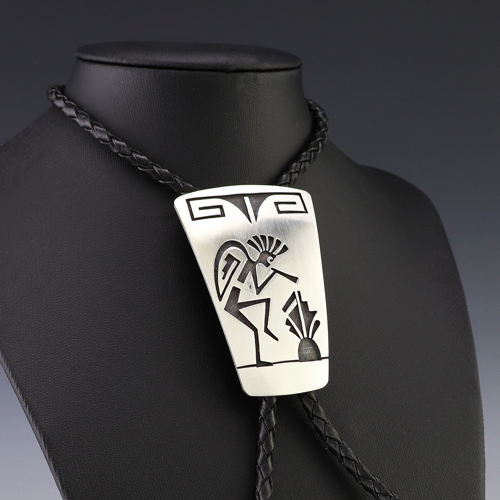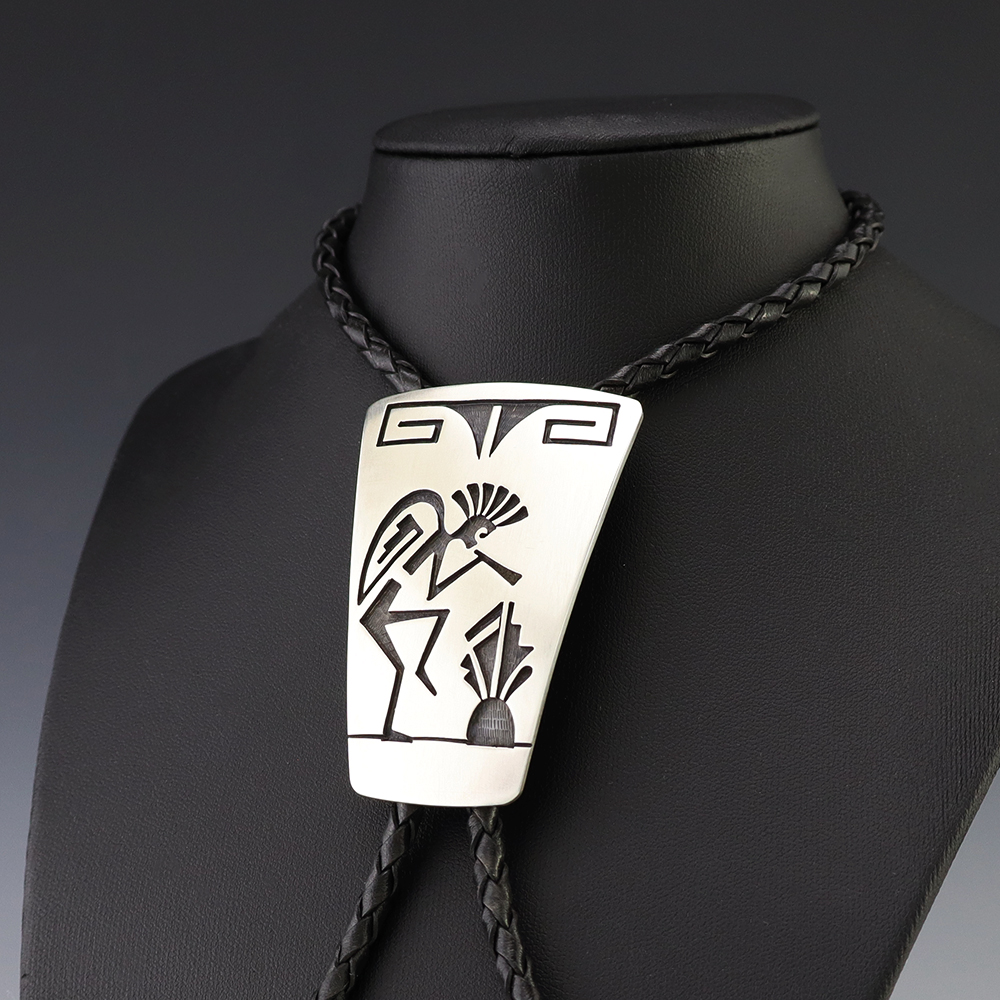 Great design! Hand crafted bolo tie made through the overlay technique. Hopi overlay is constructed from two layers of sterling silver. A design is cut out with a jeweler’s saw by hand. This top design layer is then silver soldered to another sheet, the bottom layer, of silver. Texturing is added to the bottom layer in all the open areas of the design using a hammer and a small punch. The piece is then formed to its final shape and size. The bottom layer is then oxidized to enhance the design. Hopi artist Darren Seweyestewa made this magnificent bolo tie out of sterling silver. Weighs 46 grams. Signed