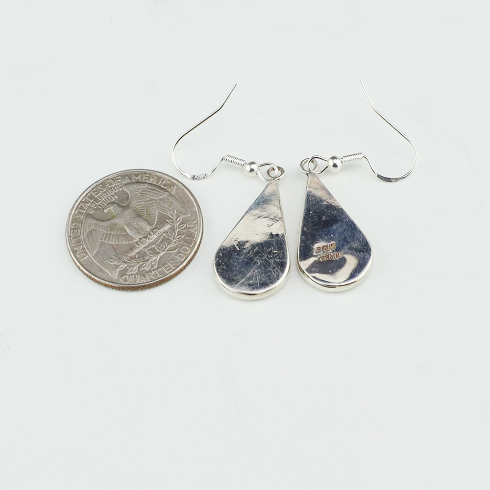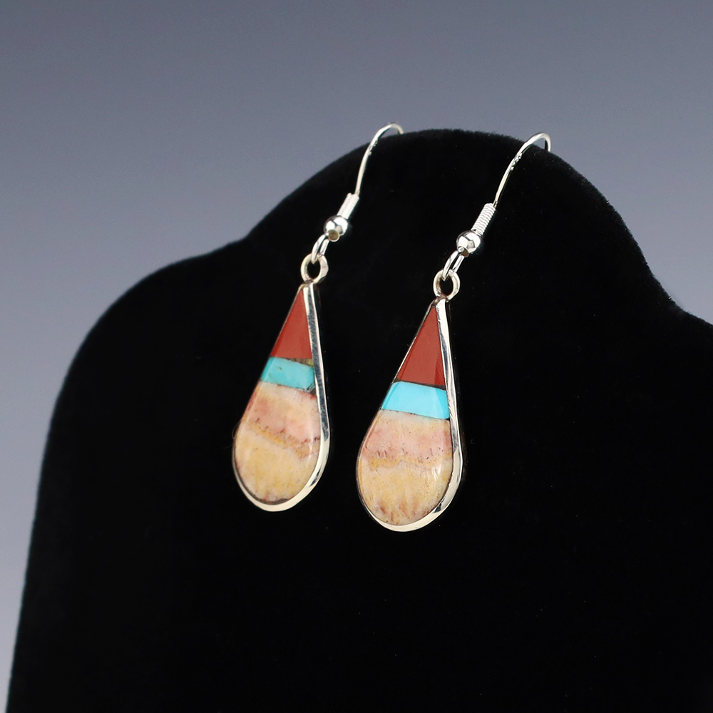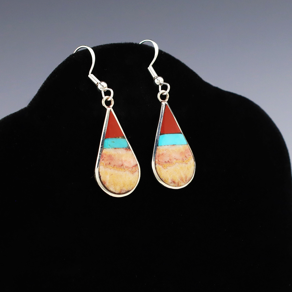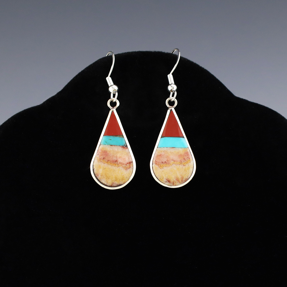 Zuni artists Nancy and Sheldon Westika created these lovely earrings. The Westikas have been making jewelry since the 1970’s and they are known for their fine inlay work. Made out of sterling silver and inlaid with natural Kingman Turquoise, Pipestone, and Dolomite. Weighs 4 grams. Signed