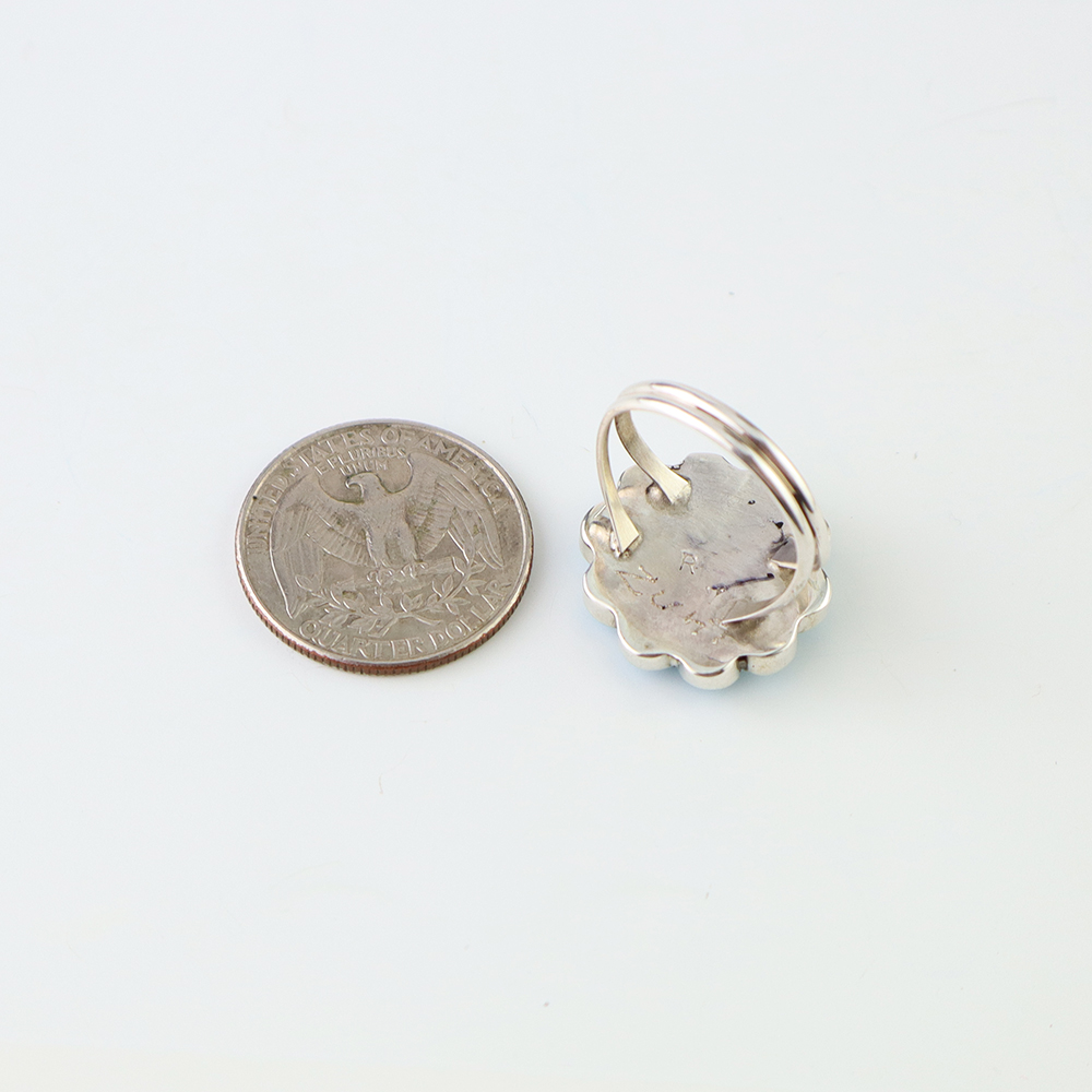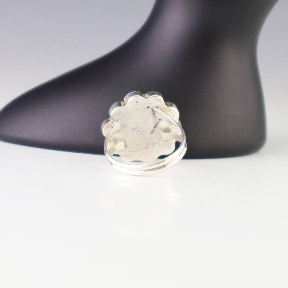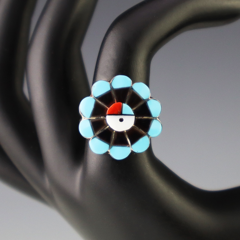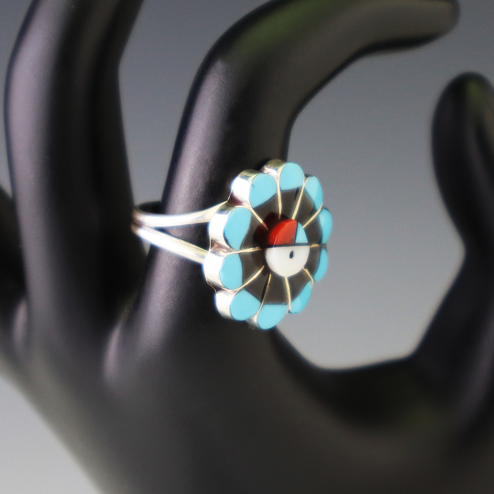 Zuni artists are known for their fine lapidary skills. Each stone is hand cut, polished, and set into a sterling silver setting. The ring is inlaid with Turquoise, Mother of Pearl Shell, Jet, and Coral stones. Hand made by Zuni artist Romero Vacit. Weighs 4 grams. Size 8 1/4. Signed