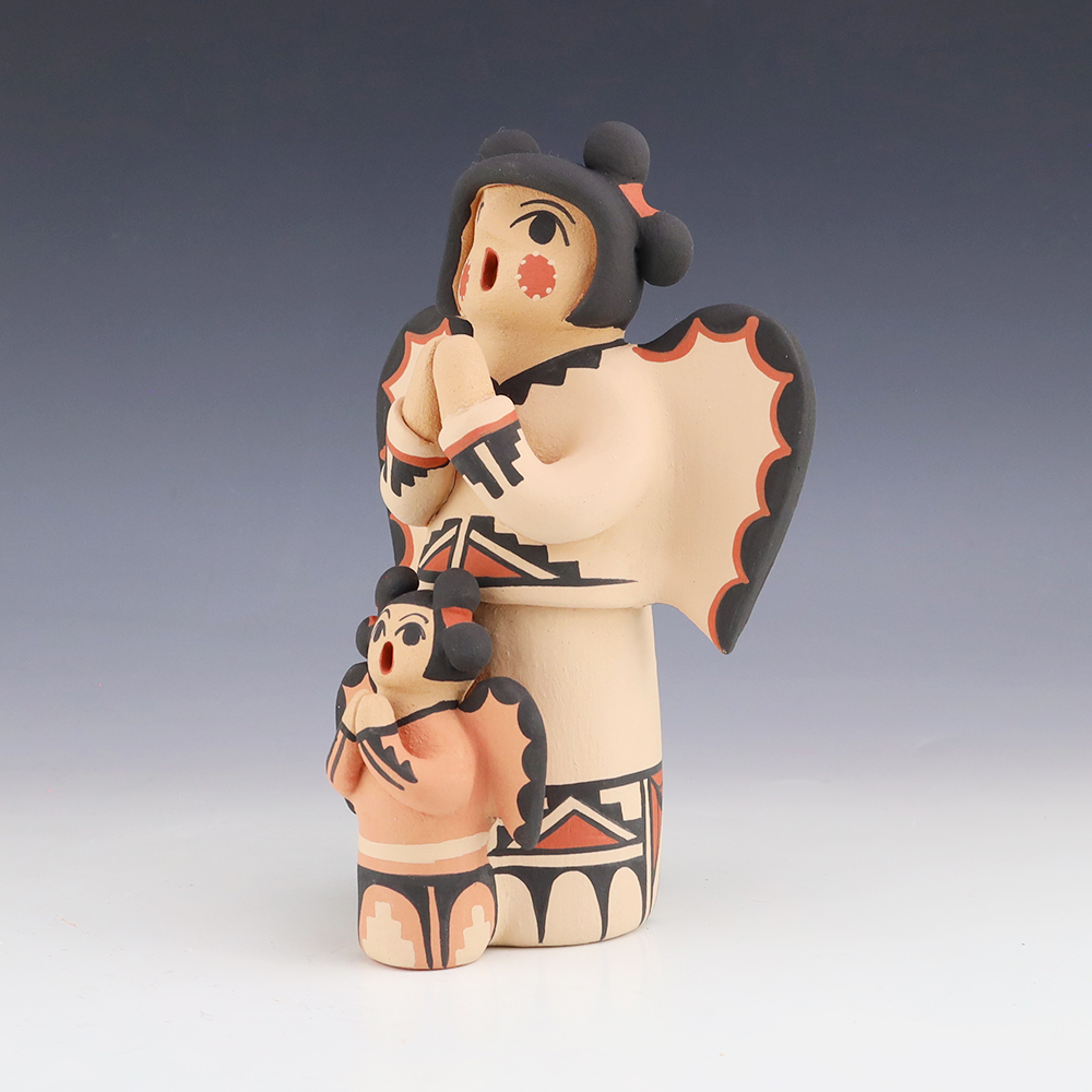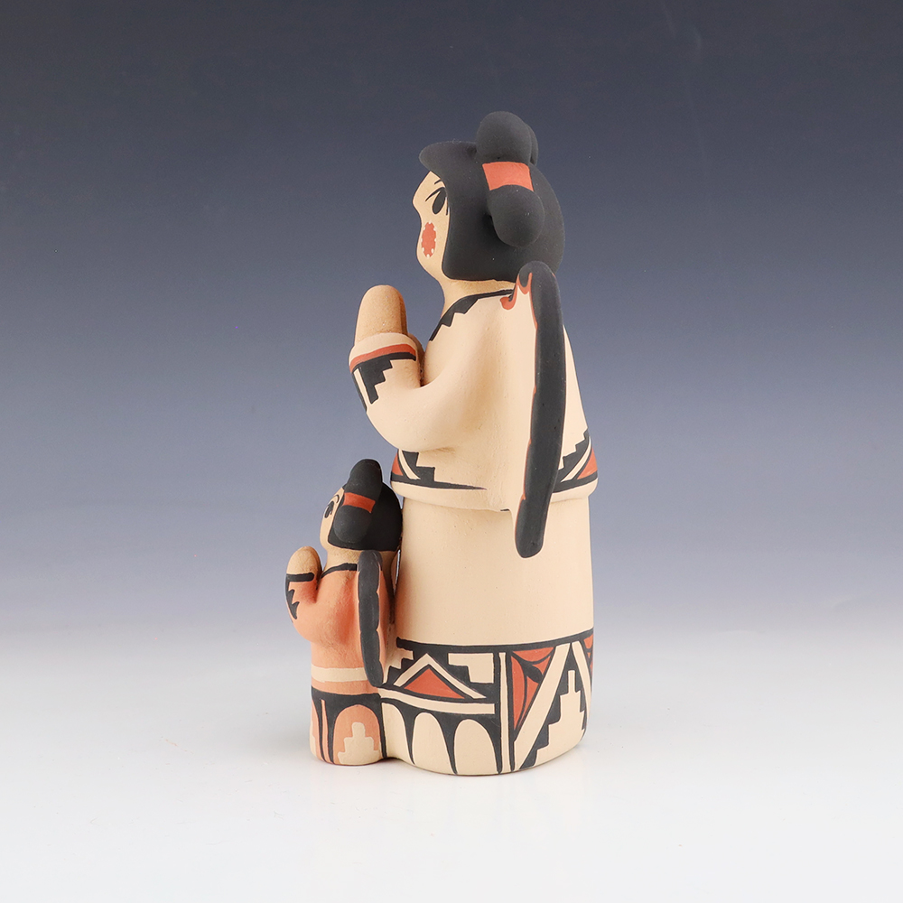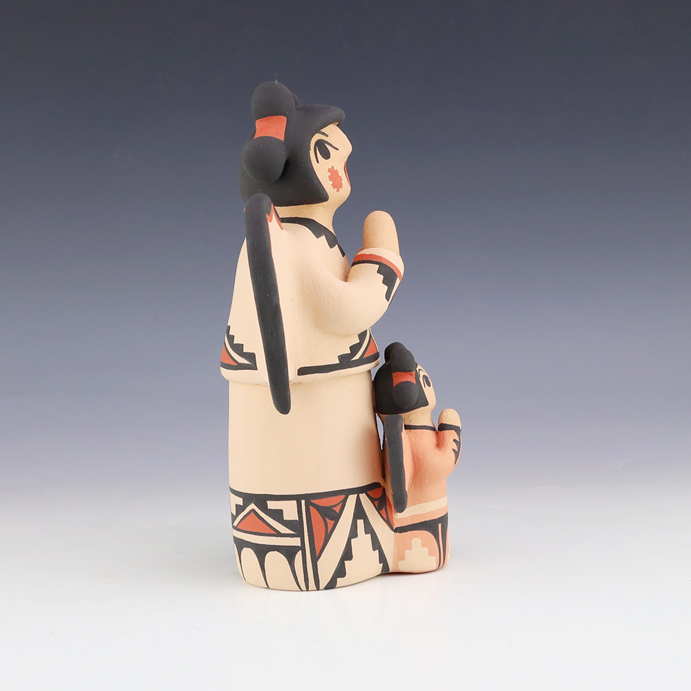This wonderfully painted storyteller was handmade by Jemez Pueblo potter Anissa Fragua and depicts a woman holding a child and a wedding basket. Anissa uses both the coil method and pinch method to create her pottery piece and as in traditional storytellers, Anissa’s storytellers have their mouths open. Storytellers represent the...