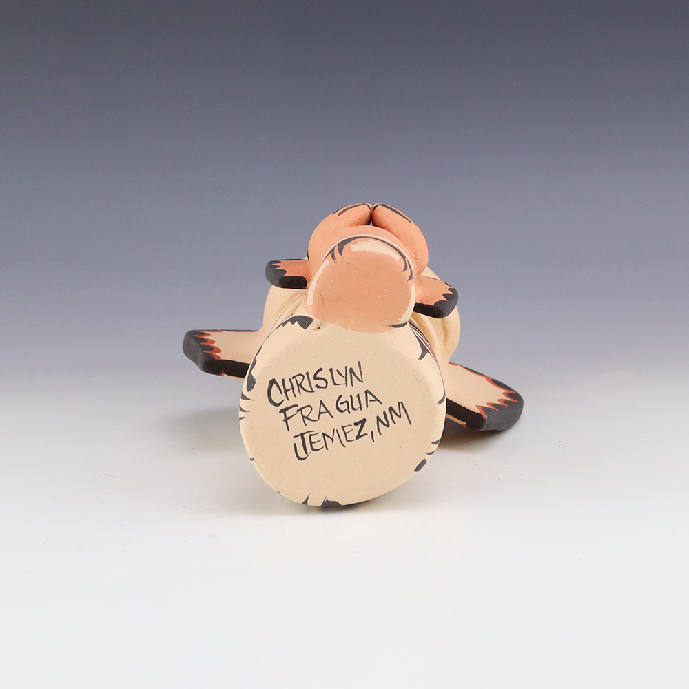 This wonderfully painted storyteller was handmade by Jemez Pueblo potter Chrislyn Fragua and depicts Santa Claus with with two children and a dog. Chrislyn uses both the coil method and pinch method to create her pottery piece and as in traditional storytellers, Chrislyn’s storytellers have their mouths open. Storytellers represent...