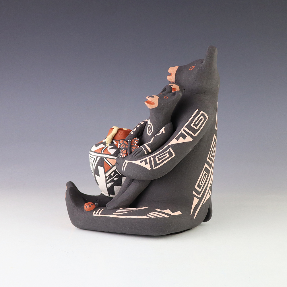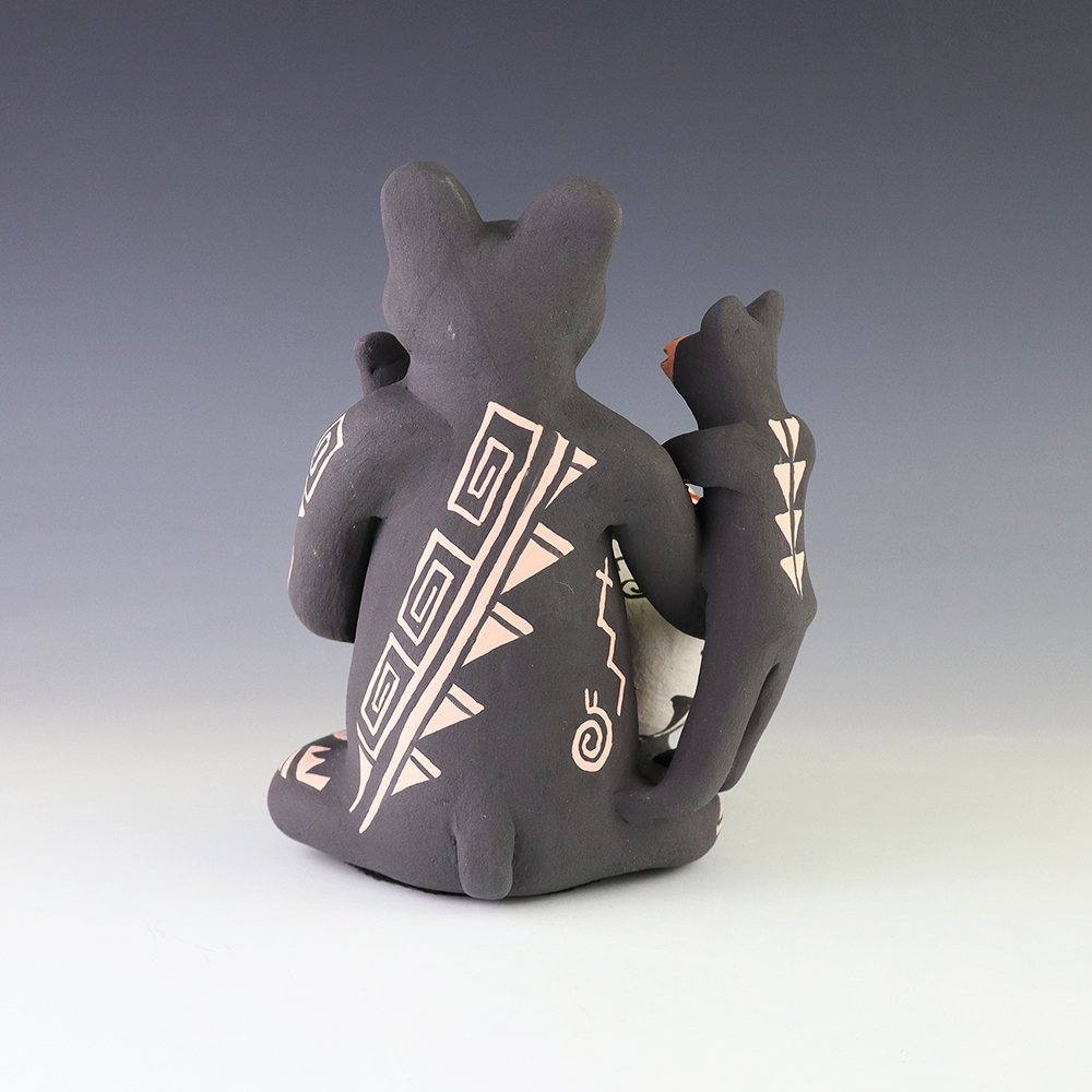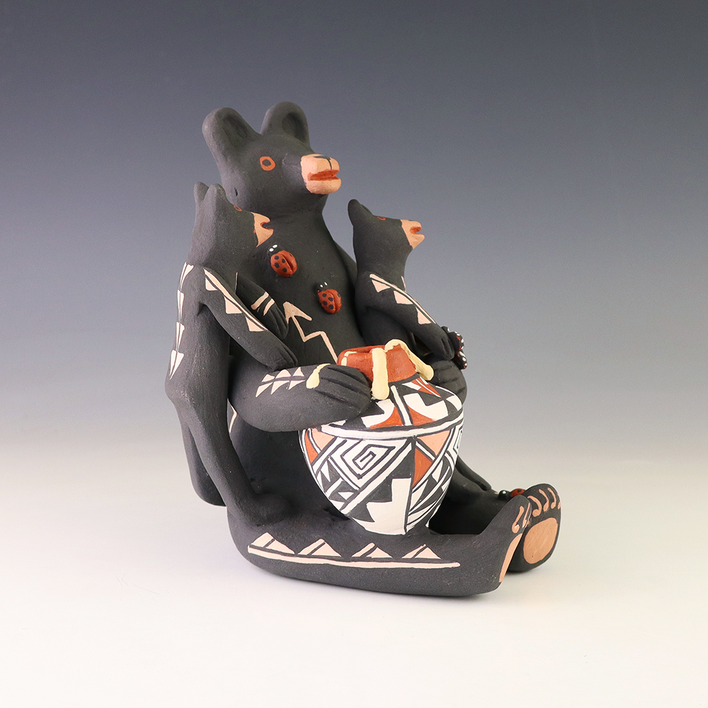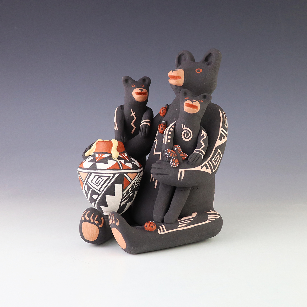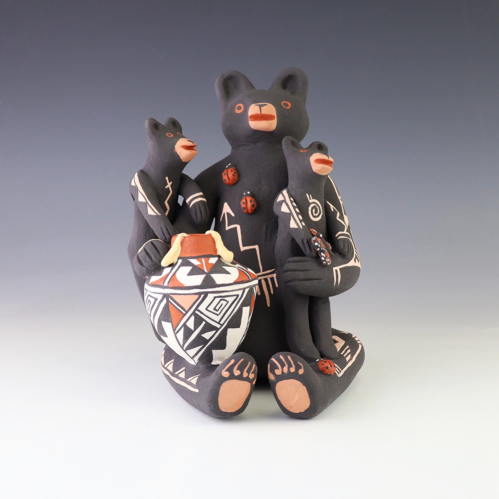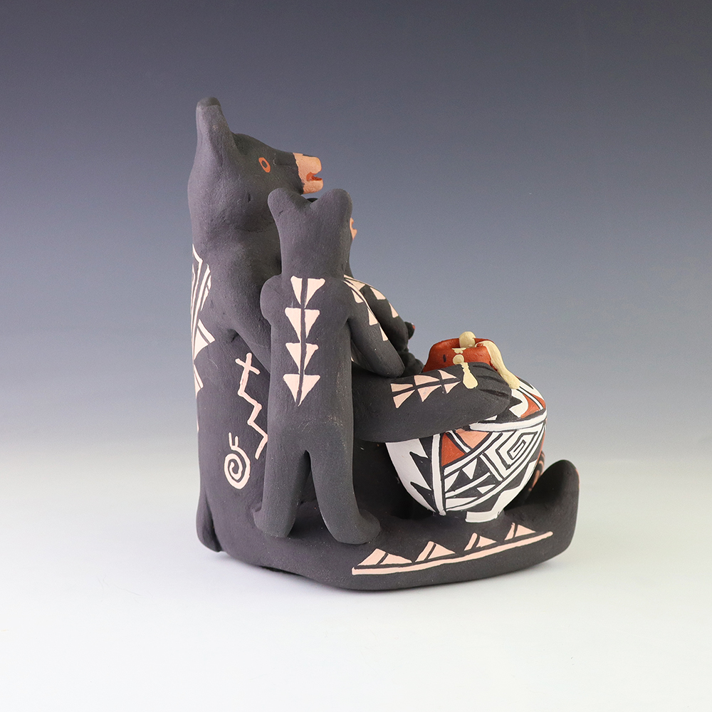 This wonderfully painted storyteller was handmade by Jemez Pueblo potter Carol Lucero Gachupin and depicts a bear holding two baby bears and a pot. Carol uses both the coil method and pinch method to create her pottery piece and as in traditional storytellers, Carol’s storytellers have their mouths open. Storytellers represent the passing down of stories orally through Pueblo tradition. Signed