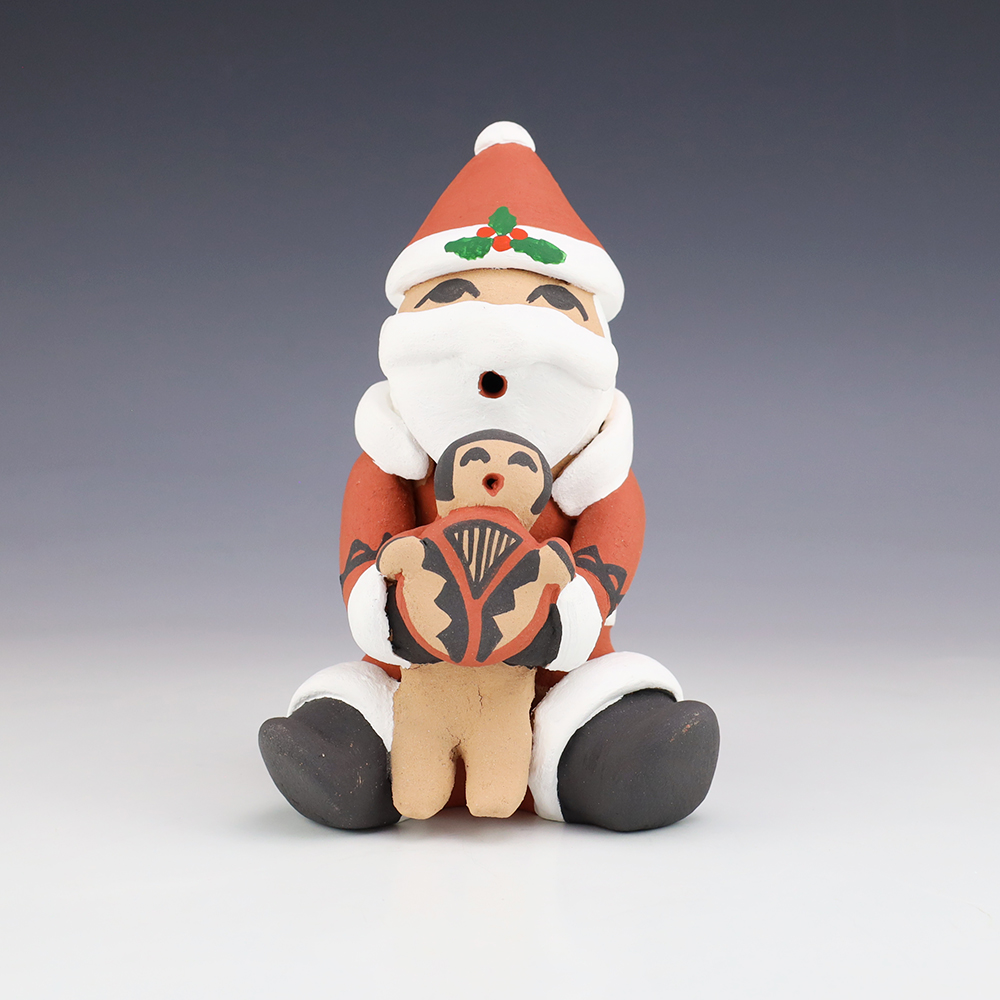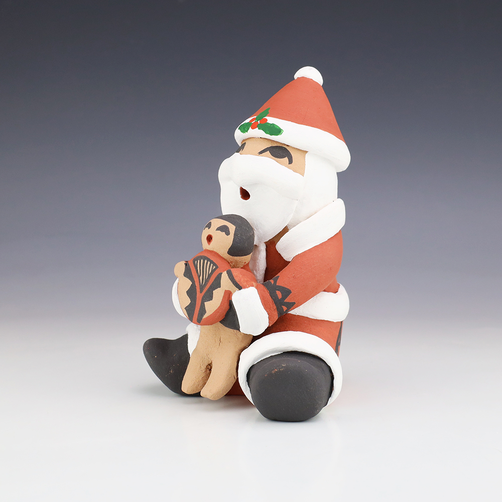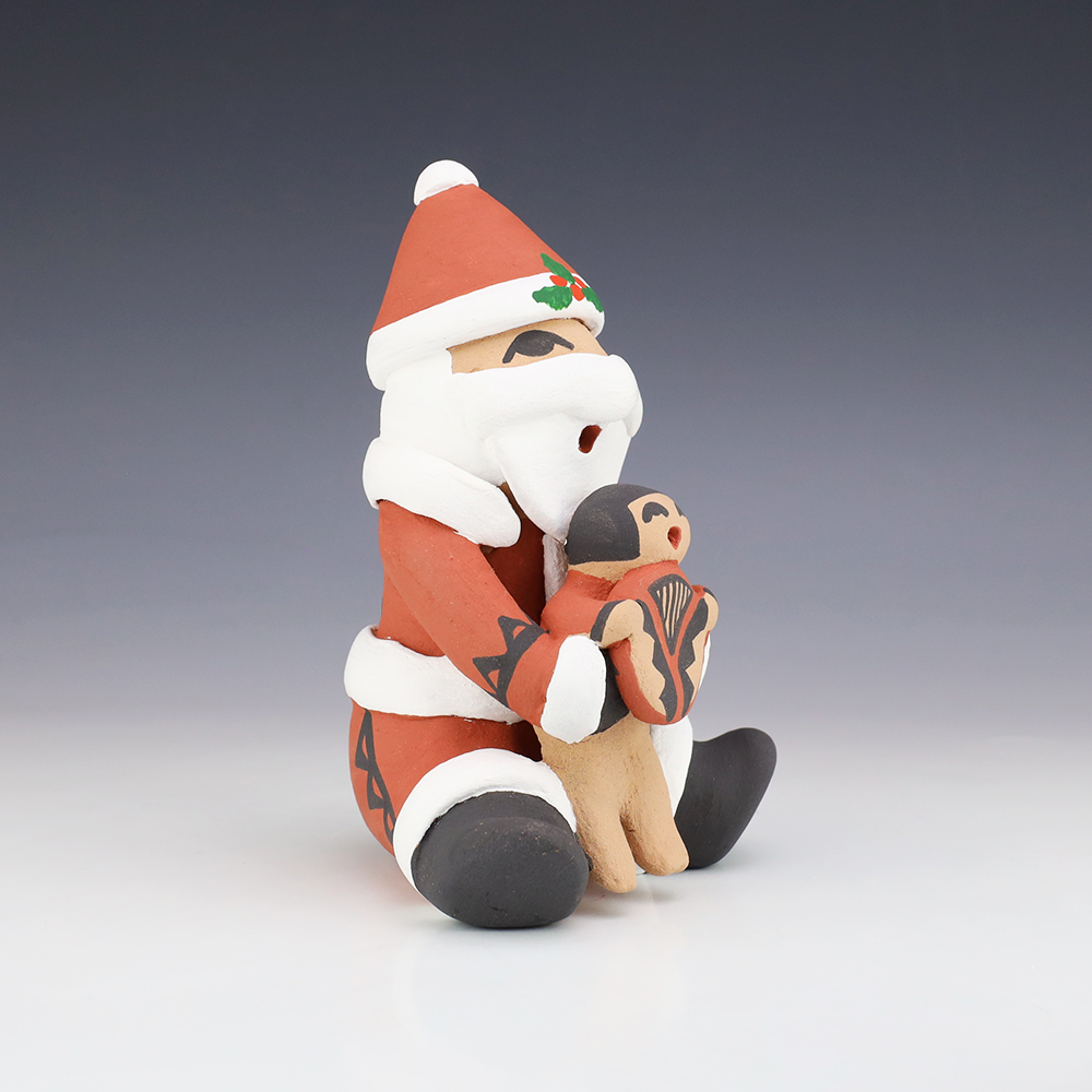 Jemez potter Venida Toya made this wonderful Santa Claus storyteller. Vernida uses both the coil method and pinch method to create her pottery pieces. Vernida is from the Jemez Pueblo. She is the daughter of famous potter Judy Toya. Vernida creates storytellers that are very unique to her own sense of style. In keeping with the traditions of those who first taught Vernida her skills, she uses all natural materials from her Pueblo when making her storytellers. Signed