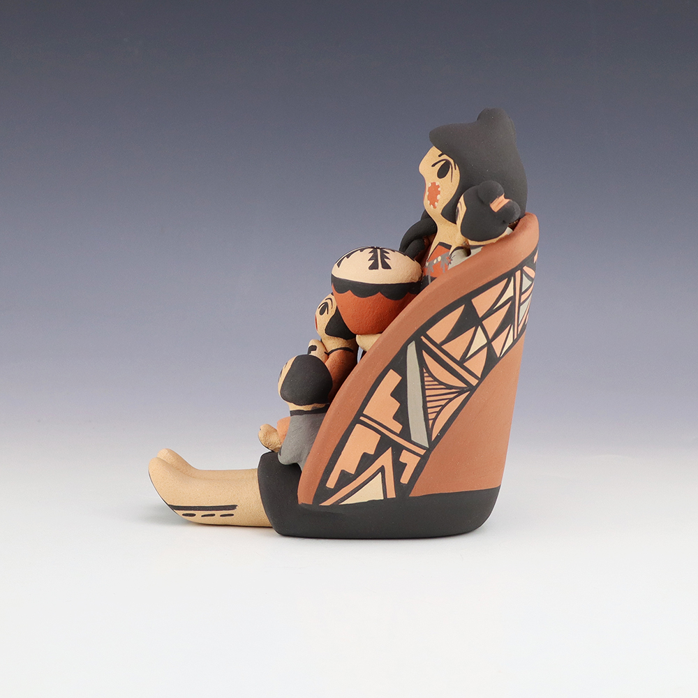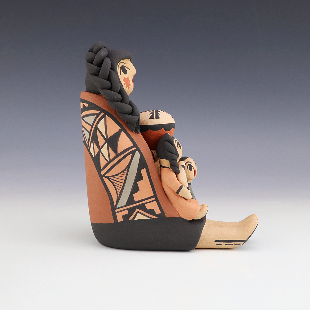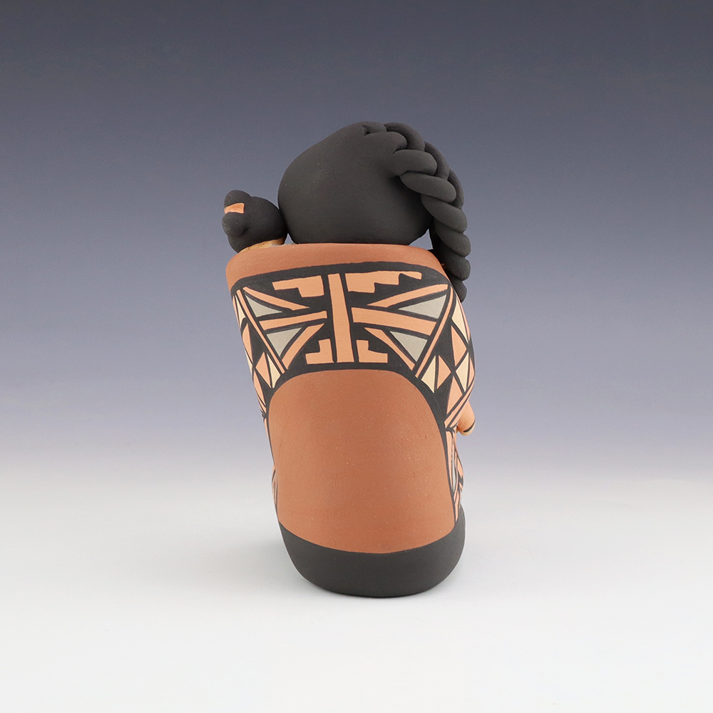 Cochiti potter Johnna Herrera hand crafted this outstanding pottery storyteller, which depicts a lady with a child.  Storytellers represent the passing down of stories orally through Pueblo tradition. Signed 4 1/4” tall x 2 3/4″ long x 2 1/4″ Artist card included Â