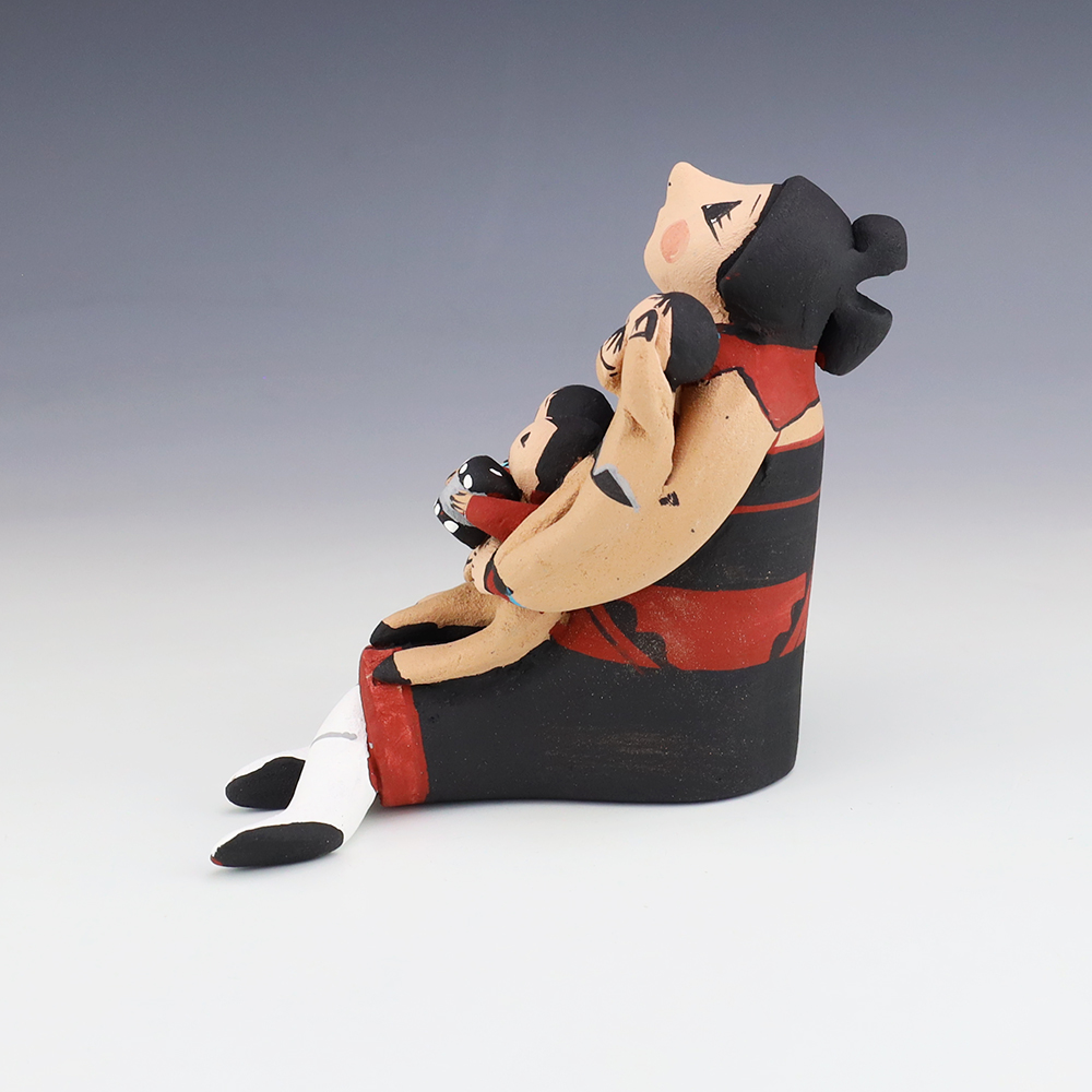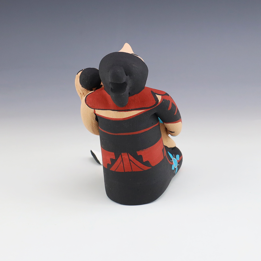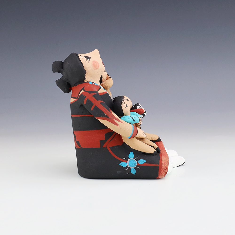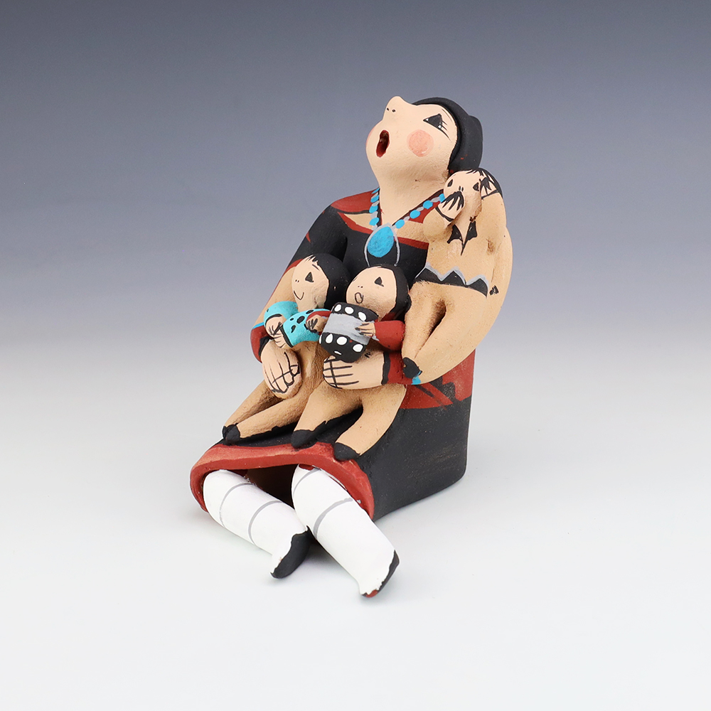 This wonderfully painted storyteller was handmade by Jemez Pueblo potter Chrislyn Fragua and depicts a woman holding a child and a baby. Chrislyn uses both the coil method and pinch method to create her pottery piece and as in traditional storytellers, Chrislyn’s storytellers have their mouths open. Storytellers represent the...