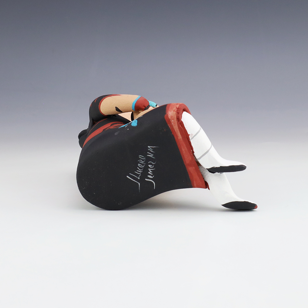 This wonderfully painted storyteller was handmade by Jemez Pueblo potter Joyce Lucero. Joyce uses both the coil method and pinch method to create her pottery piece and as in traditional storytellers, Joyce’s storytellers have their mouths open. Storytellers represent the passing down of stories orally through Pueblo tradition. Signed