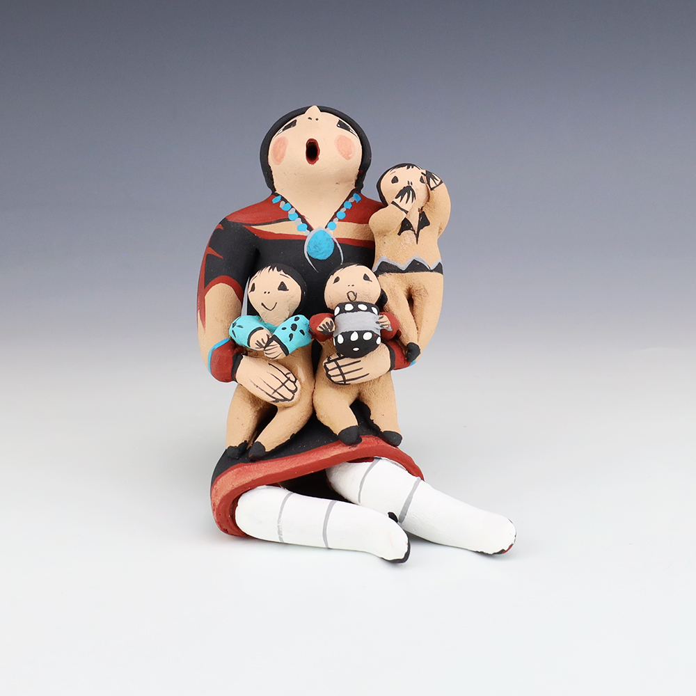 This wonderfully painted storyteller was handmade by Jemez Pueblo potter Chrislyn Fragua and depicts a woman with three children and a dog. Chrislyn uses both the coil method and pinch method to create her pottery piece and as in traditional storytellers, Chrislyn’s storytellers have their mouths open. Storytellers represent the...