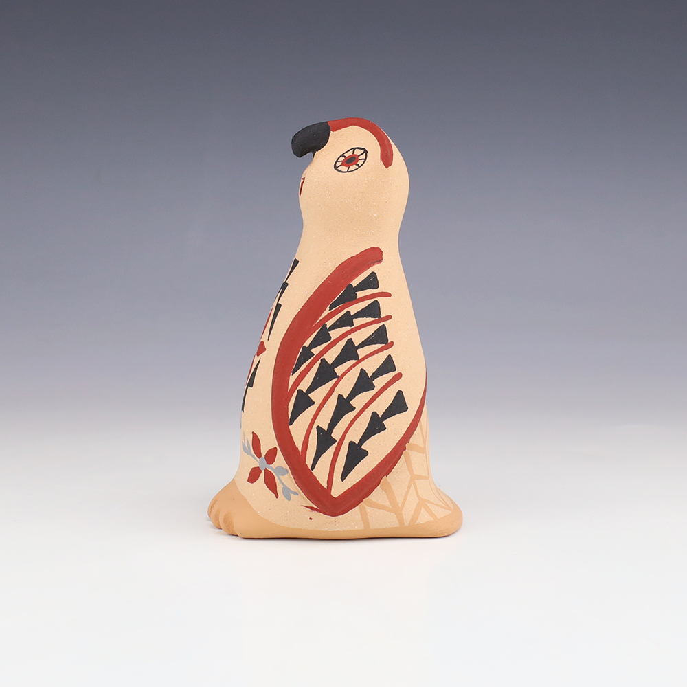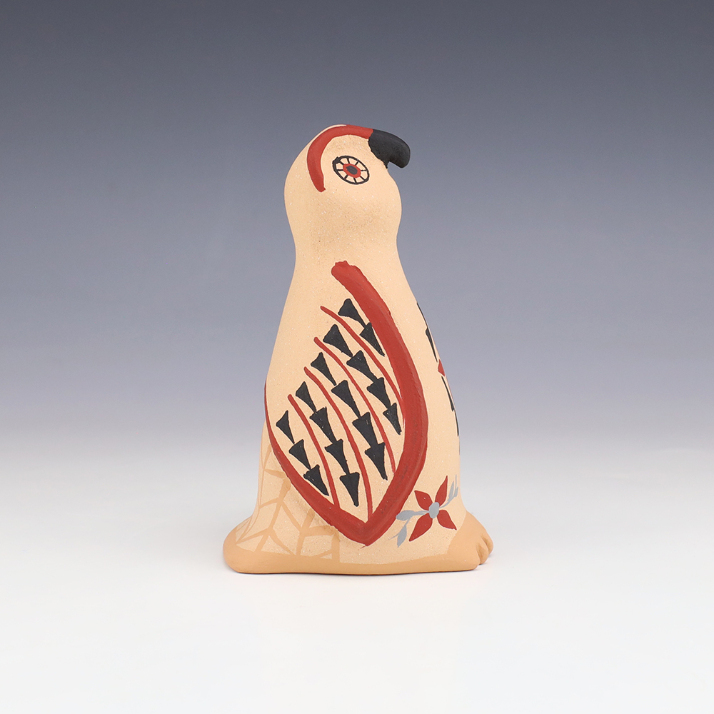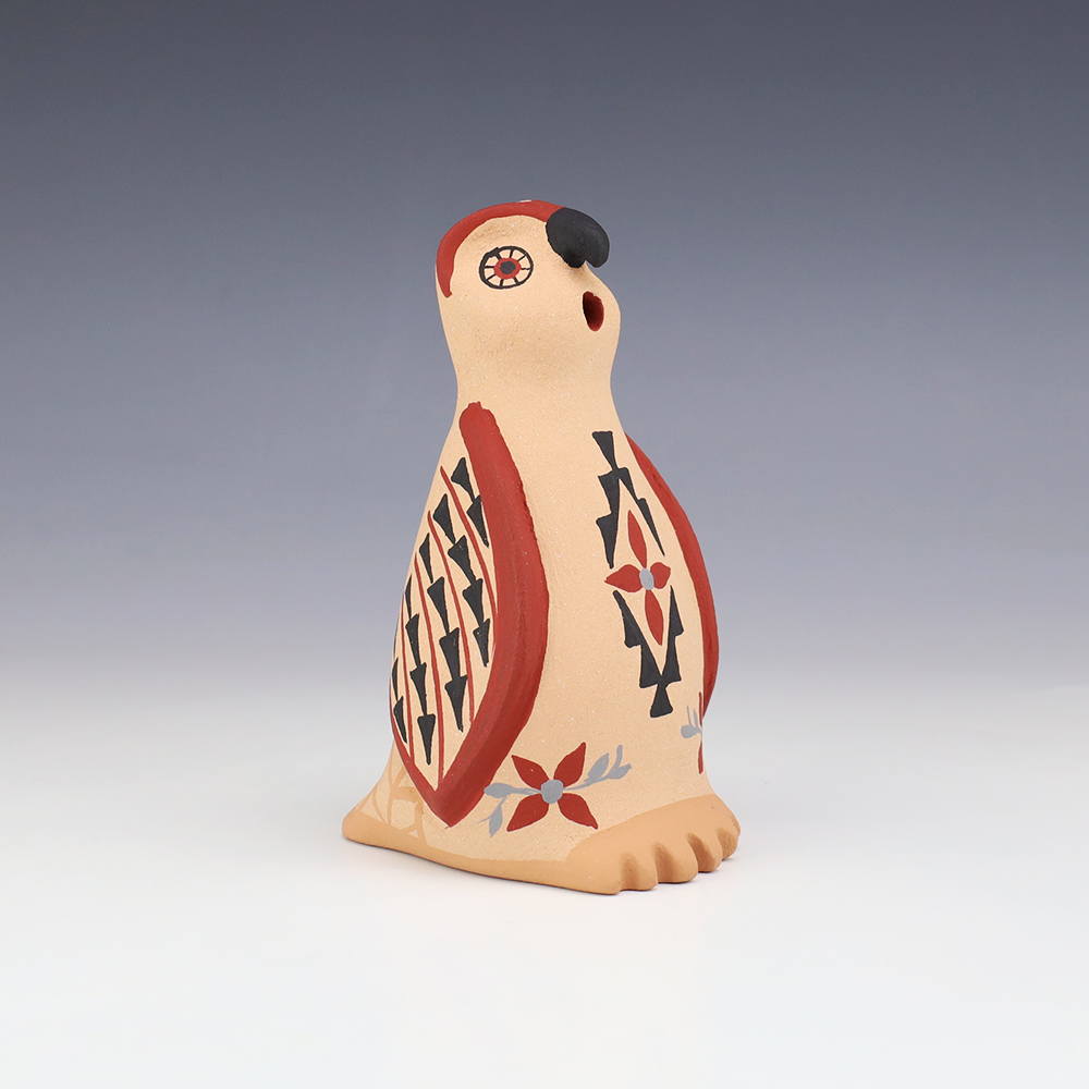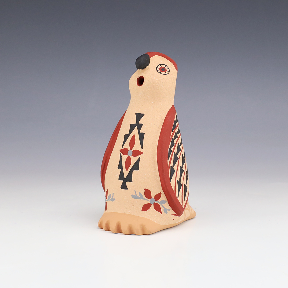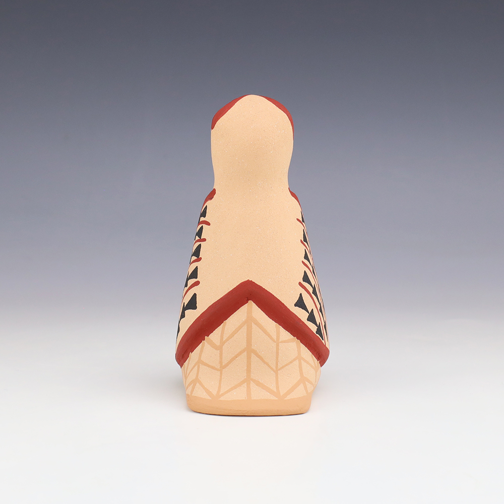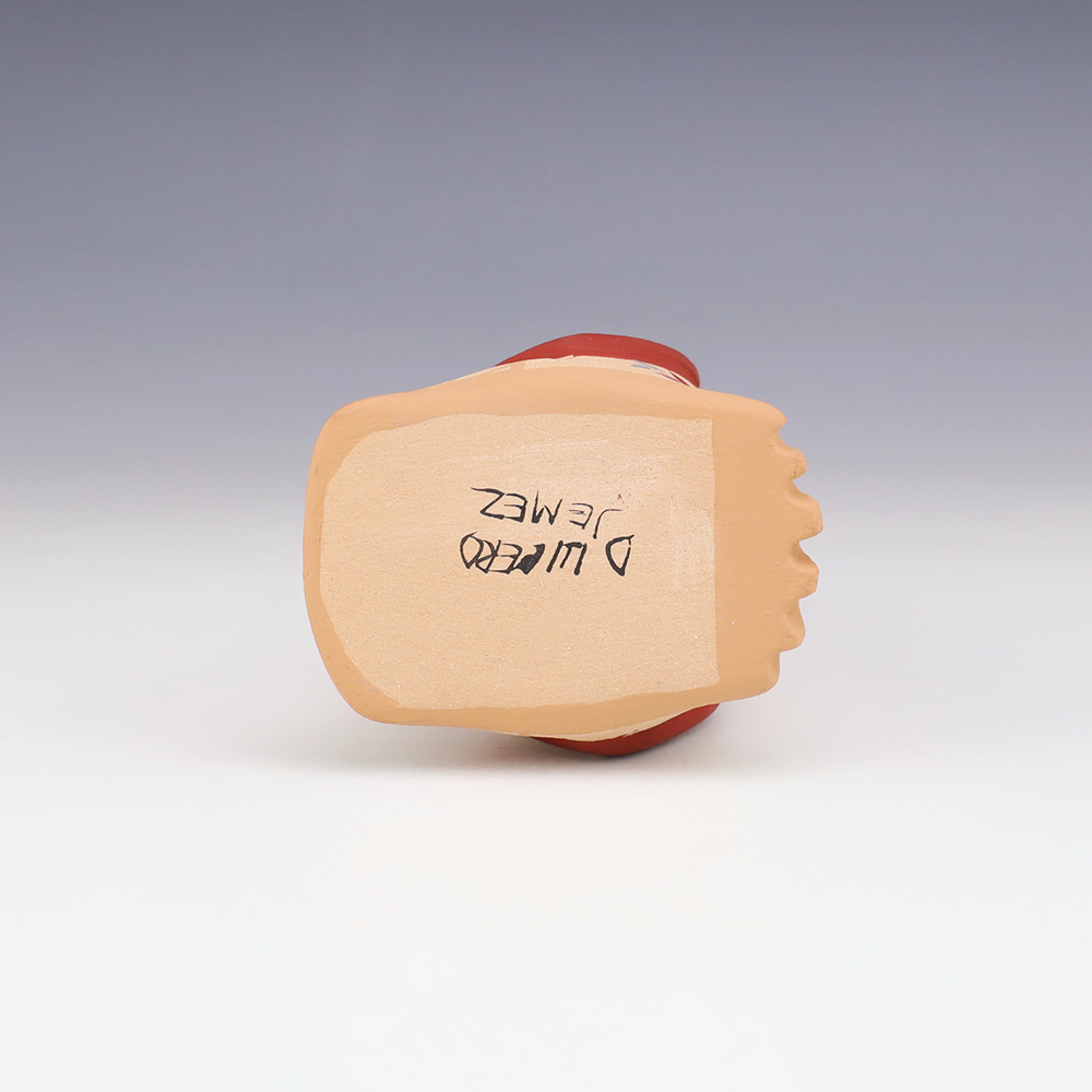 This wonderfully painted storyteller owl was handmade by Jemez Pueblo potter Diane Lucero. Diane uses both the coil method and pinch method to create her pottery piece and as in traditional storytellers, Diane’s storytellers have their mouths open. Storytellers represent the passing down of stories orally through Pueblo tradition. Signed