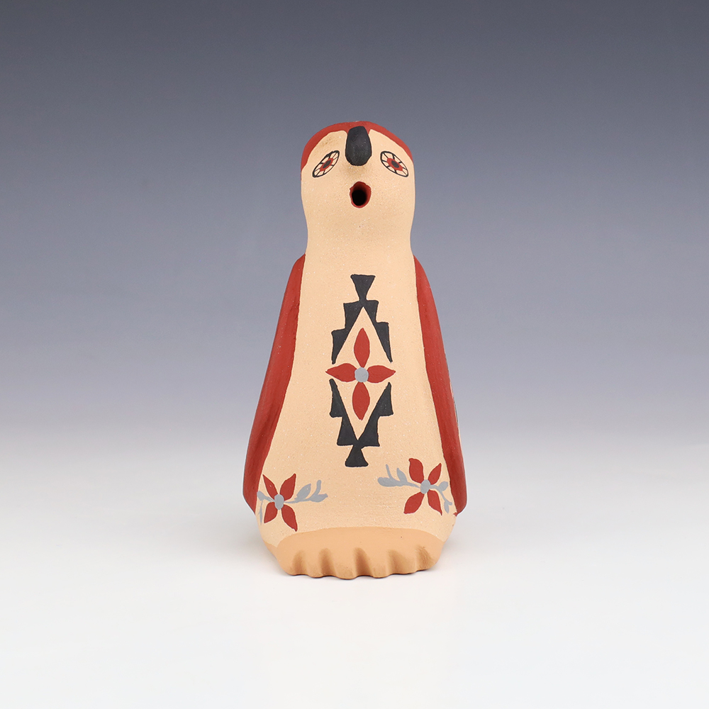 This wonderfully painted storyteller owl was handmade by Jemez Pueblo potter Diane Lucero. Diane uses both the coil method and pinch method to create her pottery piece and as in traditional storytellers, Diane’s storytellers have their mouths open. Storytellers represent the passing down of stories orally through Pueblo tradition. Signed