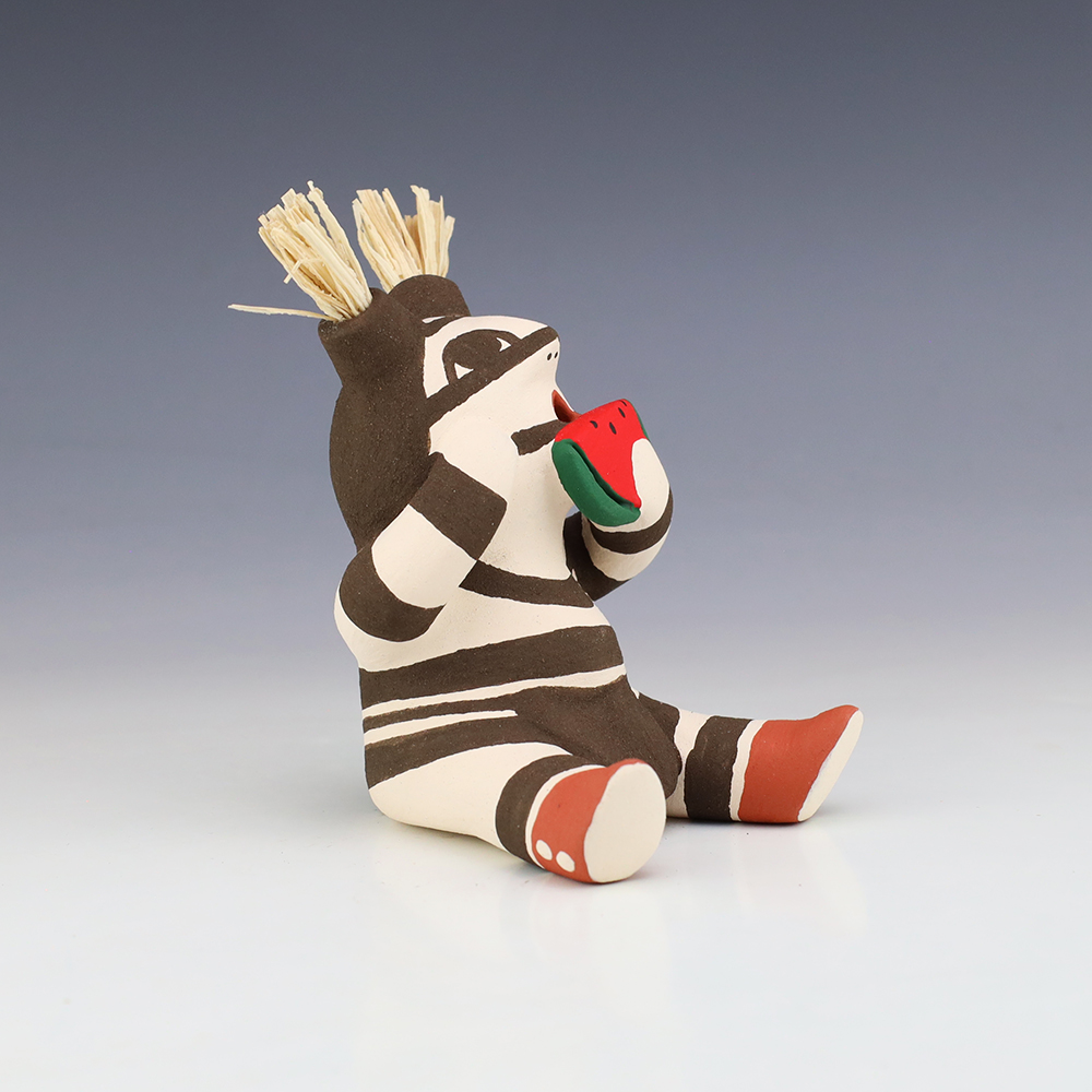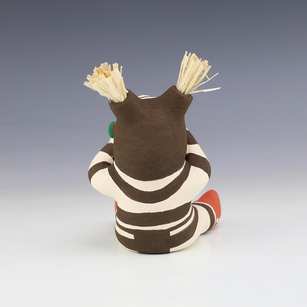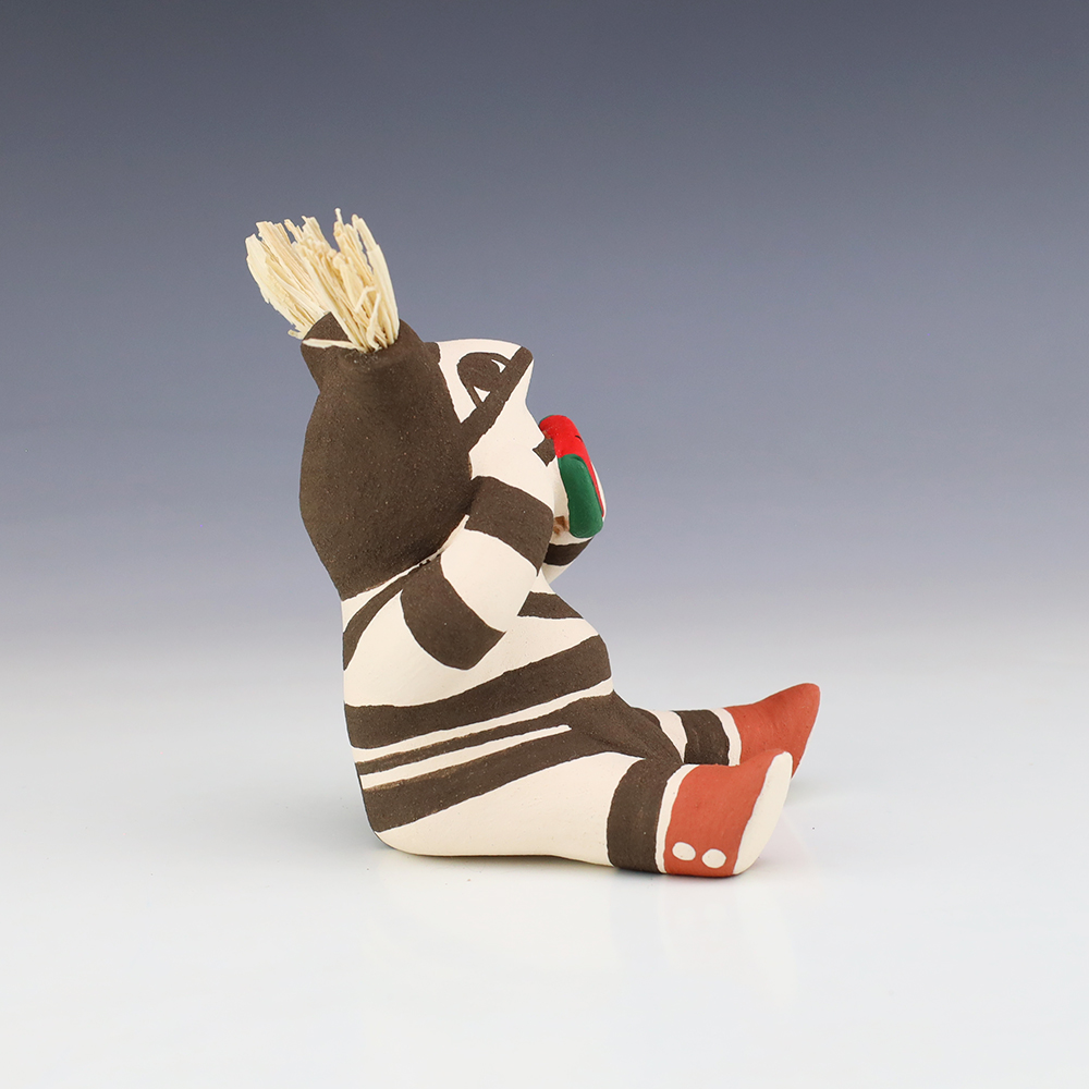 This wonderfully painted Koshare was handmade by potter Antoinette Concha. Antoinette was born into the Water Clan at Jemez Pueblo in 1964 (her tribal affiliation is both Jemez and Taos). She has been making pottery since 1976. She is the daughter of Alma Concha Loretto Maestas and Delfino Concha. Signed