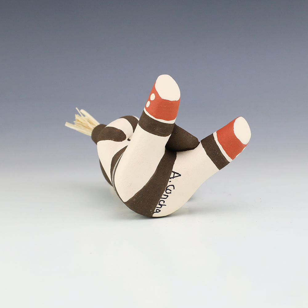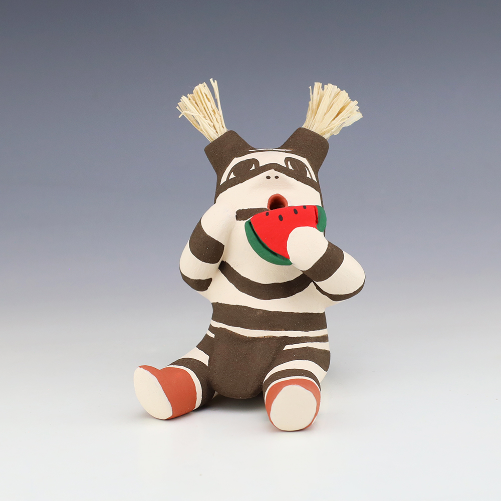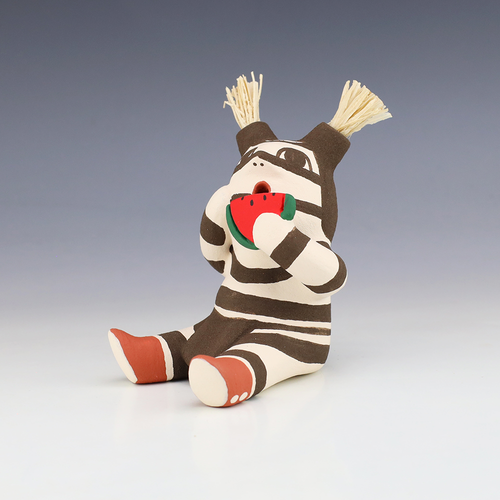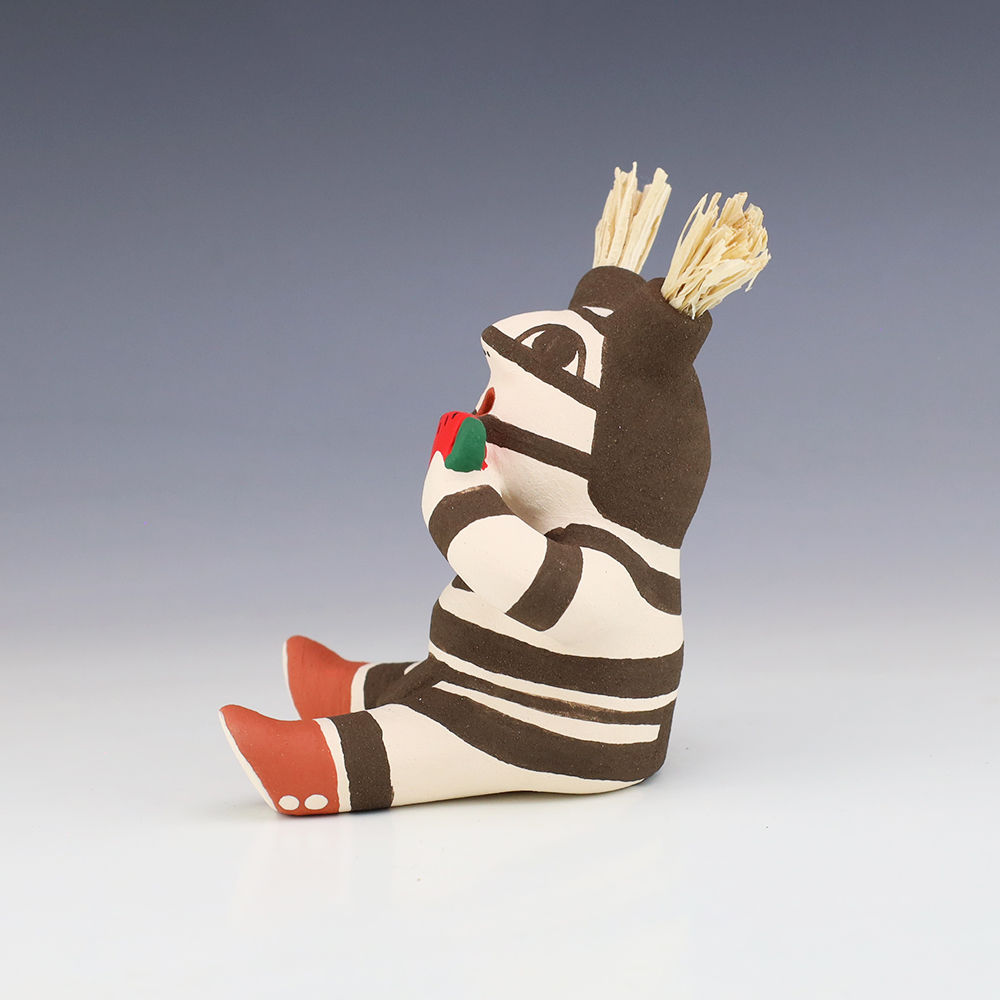 This wonderfully painted Koshare was handmade by potter Antoinette Concha. Antoinette was born into the Water Clan at Jemez Pueblo in 1964 (her tribal affiliation is both Jemez and Taos). She has been making pottery since 1976. She is the daughter of Alma Concha Loretto Maestas and Delfino Concha. Signed