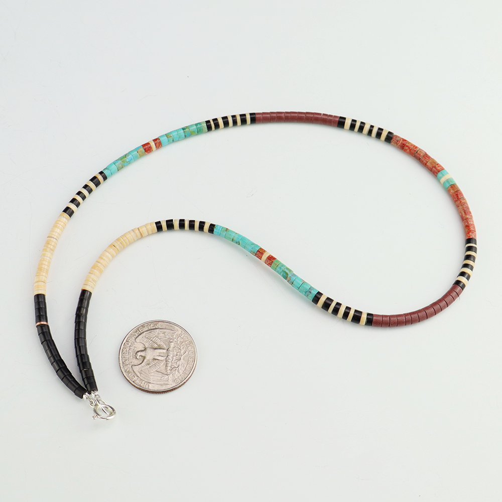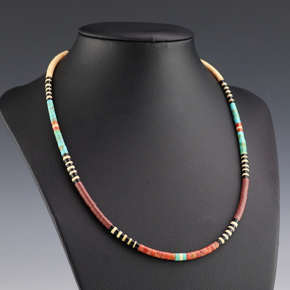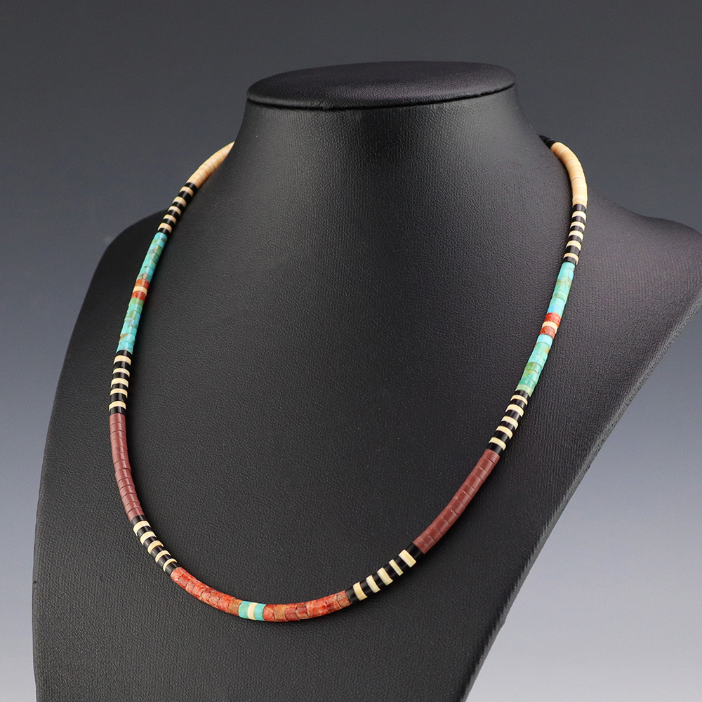 Kewa (Santo Domingo) artists are known for their heishi. The word “heishi“ means “shell” in the Keresan language. Traditionally Santo Domingo jewelry makers created their heishi jewelry out of shell. The shell is hand cut into a flat disc. Today, other stones that Santo Domingo artists cut in this manner, are also referred to as heishi. With modern tools and innovations, artists can create different styles of beads and use different gemstones like turquoise, coral, jet, serpentine, and spiny oyster.