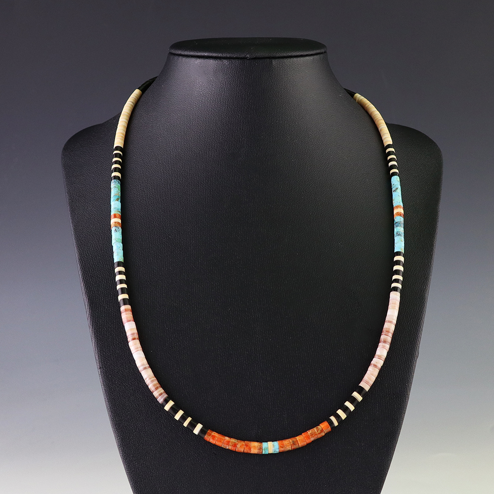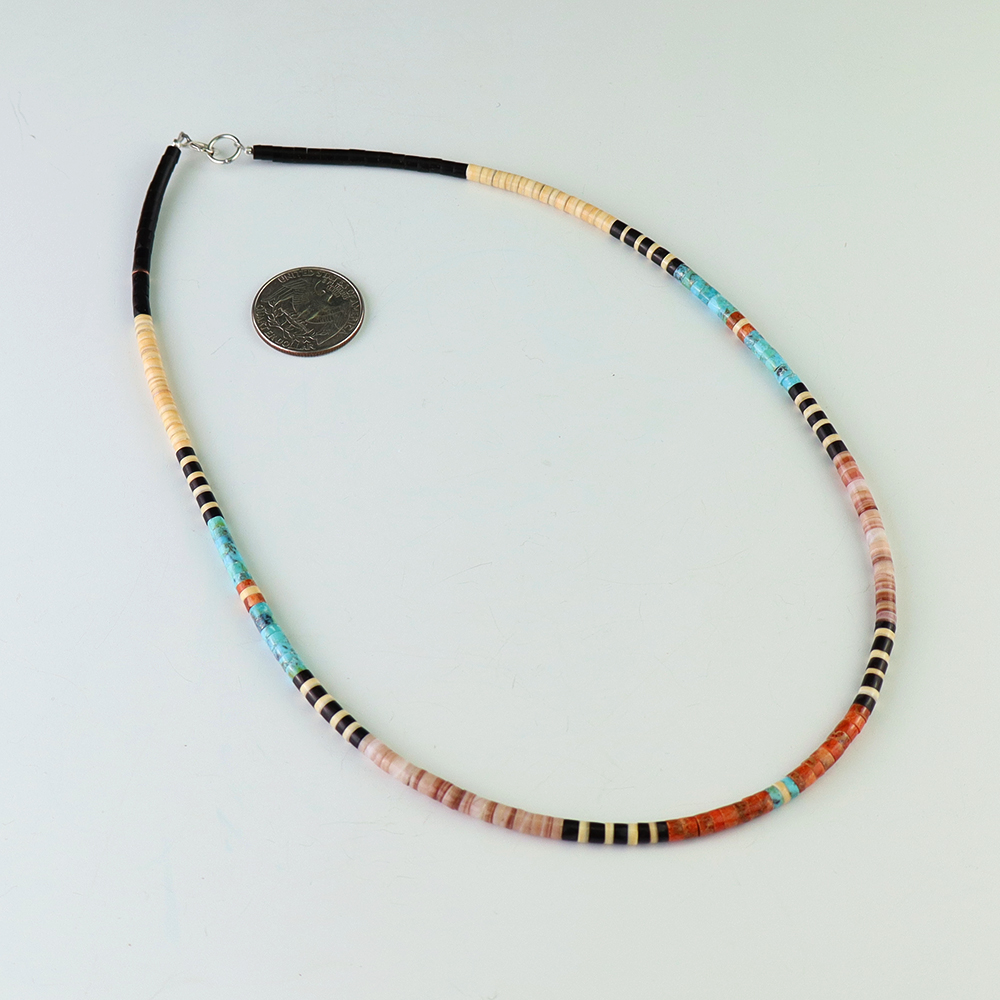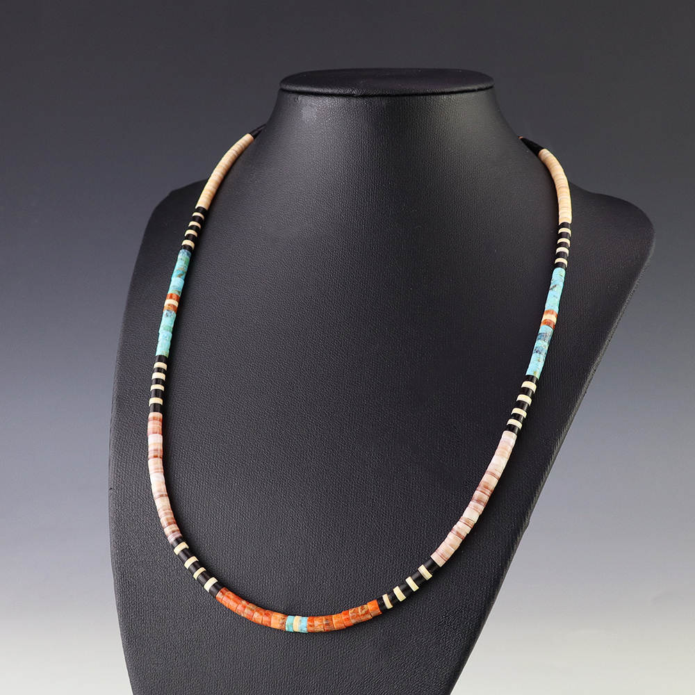 Kewa (Santo Domingo) artists are known for their heishi. The word “heishi“ means “shell” in the Keresan language. Traditionally Santo Domingo jewelry makers created their heishi jewelry out of shell. The shell is hand cut into a flat disc. Today, other stones that Santo Domingo artists cut in this manner, are also referred to as heishi. With modern tools and innovations, artists can create different styles of beads and use different gemstones like turquoise, coral, jet, serpentine, and spiny oyster.