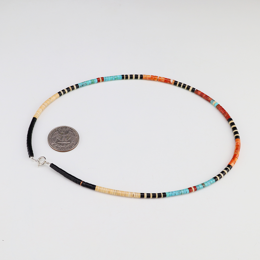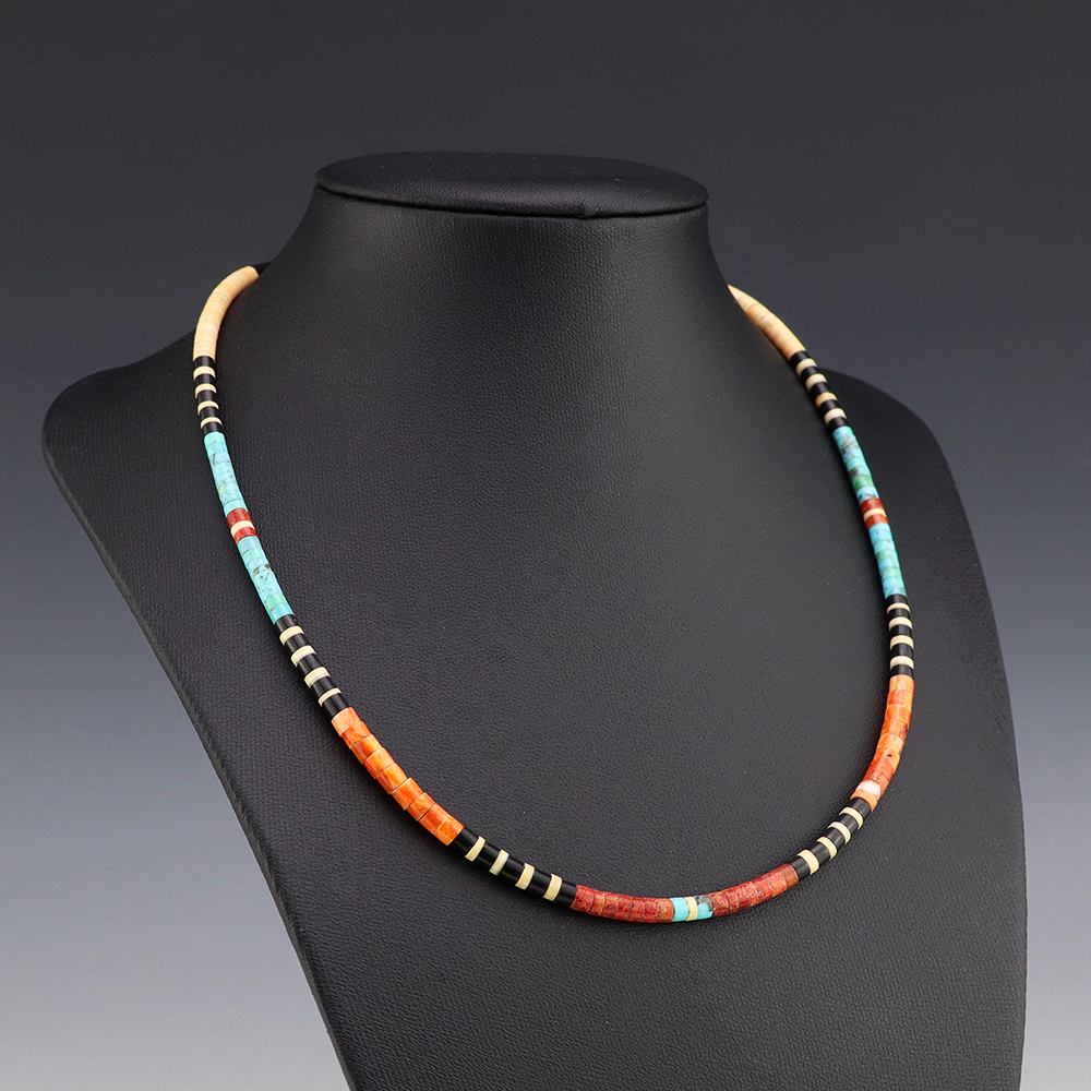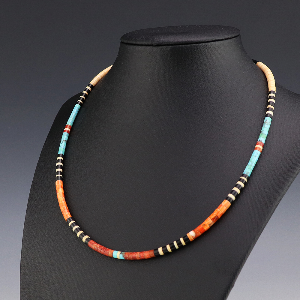 Kewa (Santo Domingo) artists are known for their heishi. The word “heishi“ means “shell” in the Keresan language. Traditionally Santo Domingo jewelry makers created their heishi jewelry out of shell. The shell is hand cut into a flat disc. Today, other stones that Santo Domingo artists cut in this manner, are also referred to as heishi. With modern tools and innovations, artists can create different styles of beads and use different gemstones like turquoise, coral, jet, serpentine, and spiny oyster.