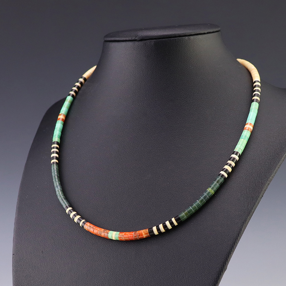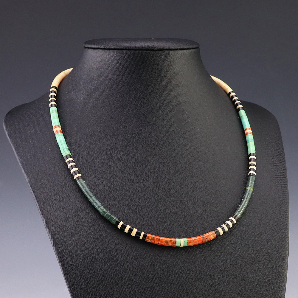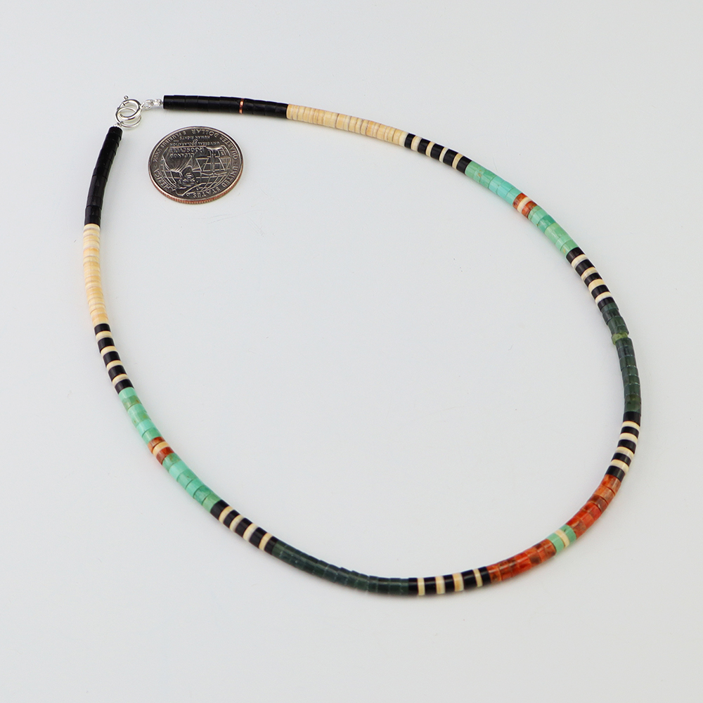 Kewa (Santo Domingo) artists are known for their heishi. The word “heishi“ means “shell” in the Keresan language. Traditionally Santo Domingo jewelry makers created their heishi jewelry out of shell. The shell is hand cut into a flat disc. Today, other stones that Santo Domingo artists cut in this manner, are also referred to as heishi. With modern tools and innovations, artists can create different styles of beads and use different gemstones like turquoise, coral, jet, serpentine, and spiny oyster.