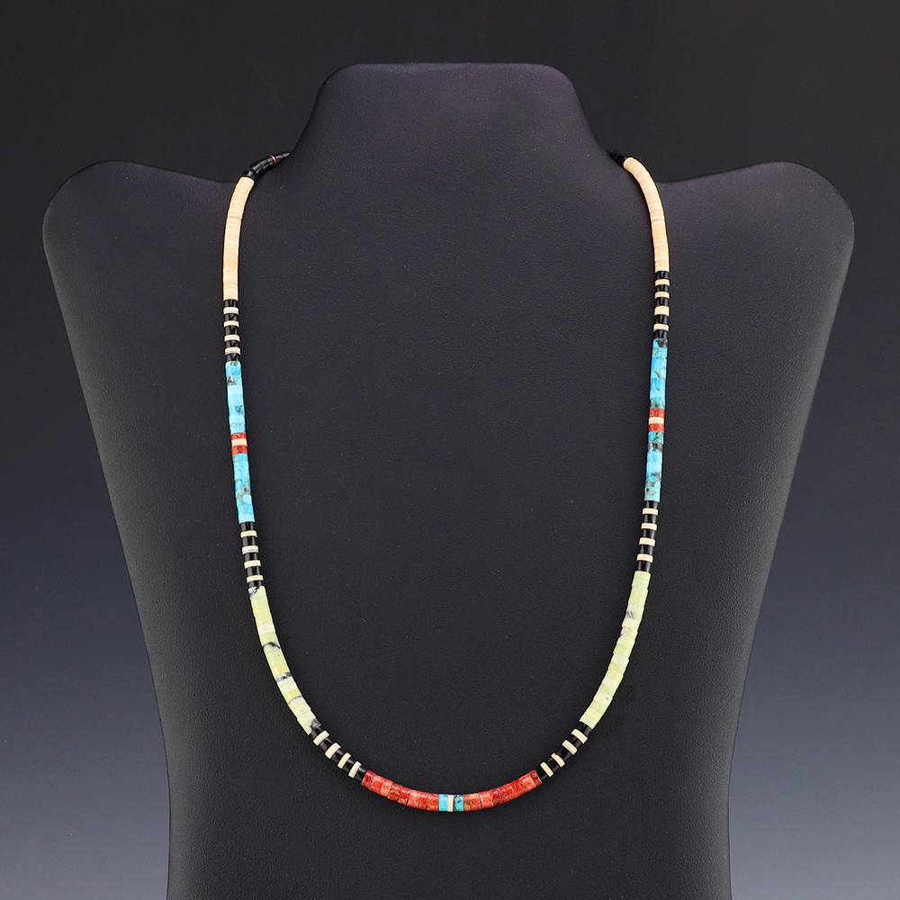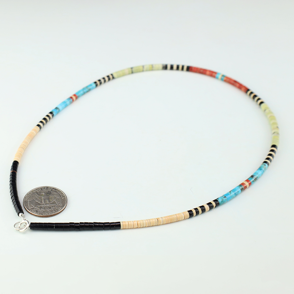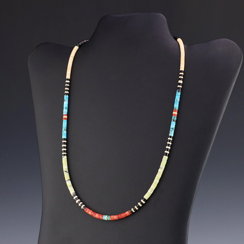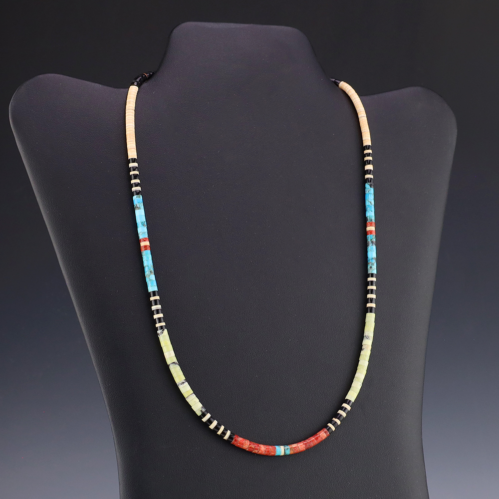 Kewa artists Mary and Gerard Calabaza made this wonderful necklace out of Melon Shell, Turquoise, Jet, Serpentine, and Apple Coral. Traditionally made by hand cutting, drilling, rolling, and stringing. A great strand of heishi that is finished off with sterling silver clasp. Weighs 12 grams. Fabulous colors that will look great with any outfit.