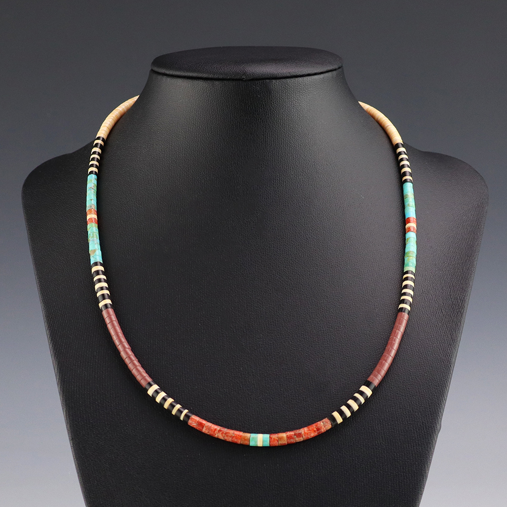 Kewa (Santo Domingo) artists are known for their heishi. The word “heishi“ means “shell” in the Keresan language. Traditionally Santo Domingo jewelry makers created their heishi jewelry out of shell. The shell is hand cut into a flat disc. Today, other stones that Santo Domingo artists cut in this manner, are also referred to as heishi. With modern tools and innovations, artists can create different styles of beads and use different gemstones like turquoise, coral, jet, serpentine, and spiny oyster.
