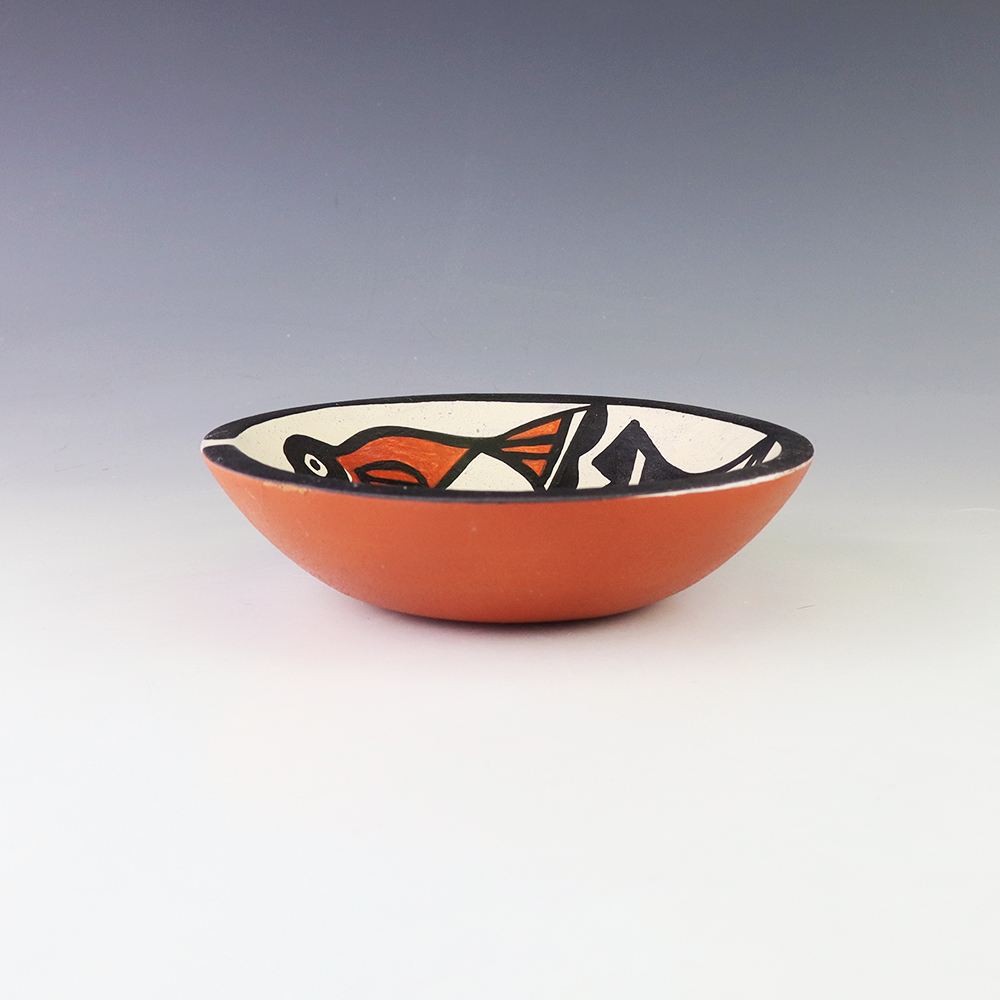 Santo Domingo pueblo one of the largest of the Northern pueblos. Santo Domingo pottery can be distinguished by its buff colored clay, cream slip, and dark black geometric designs. The elastic clay at Santo Domingo lends itself to large forms such as storage jars, dough bowls, and large ollas. The designs are mainly geometric with particular attention to the negative spaces. Occasionally there will also be elaborate bird motifs and polychrome designs.