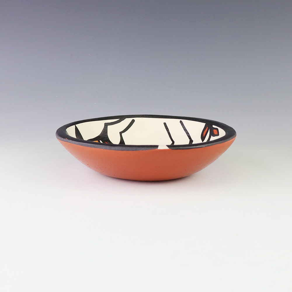 Santo Domingo pueblo one of the largest of the Northern pueblos. Santo Domingo pottery can be distinguished by its buff colored clay, cream slip, and dark black geometric designs. The elastic clay at Santo Domingo lends itself to large forms such as storage jars, dough bowls, and large ollas. The designs are mainly geometric with particular attention to the negative spaces. Occasionally there will also be elaborate bird motifs and polychrome designs.