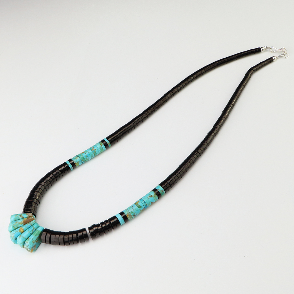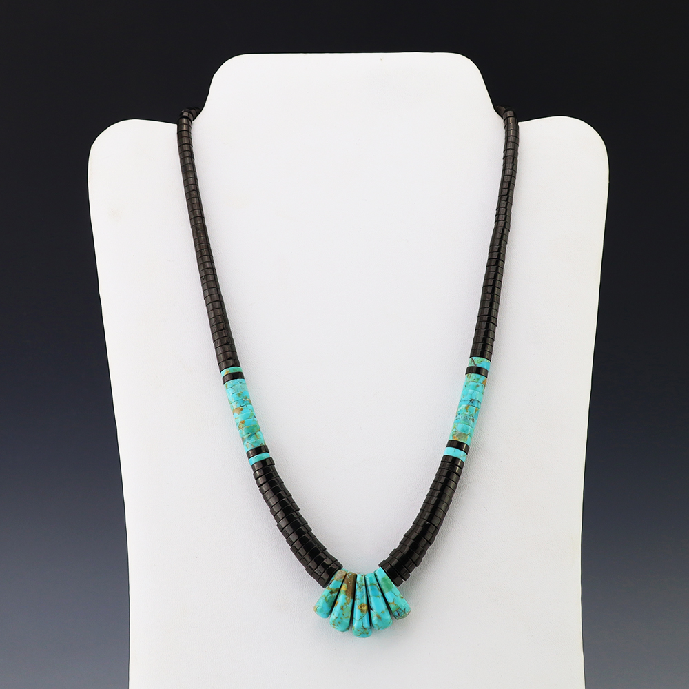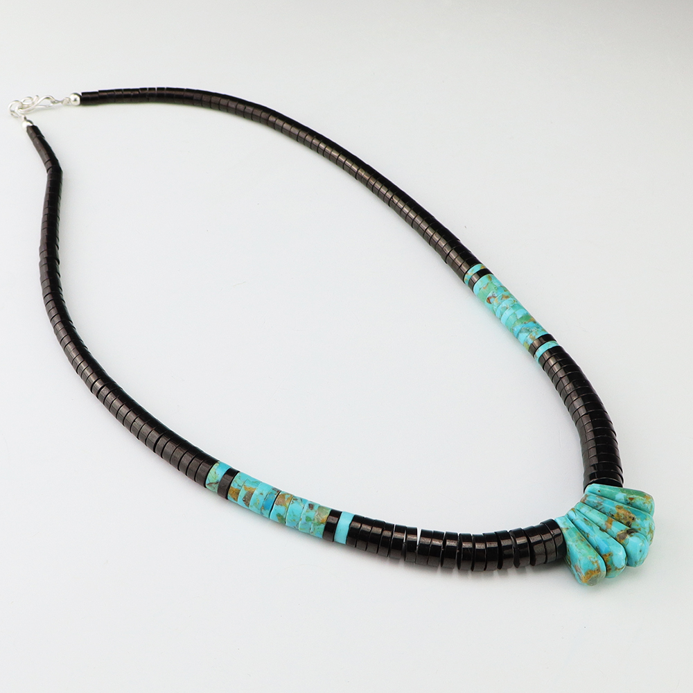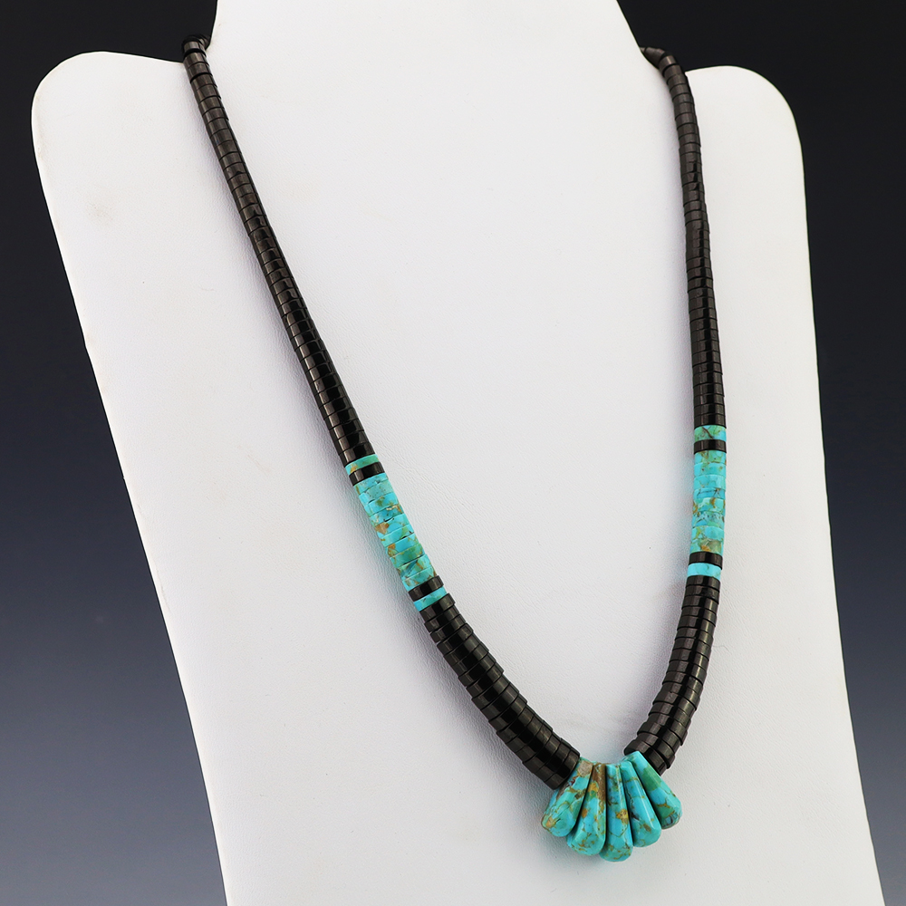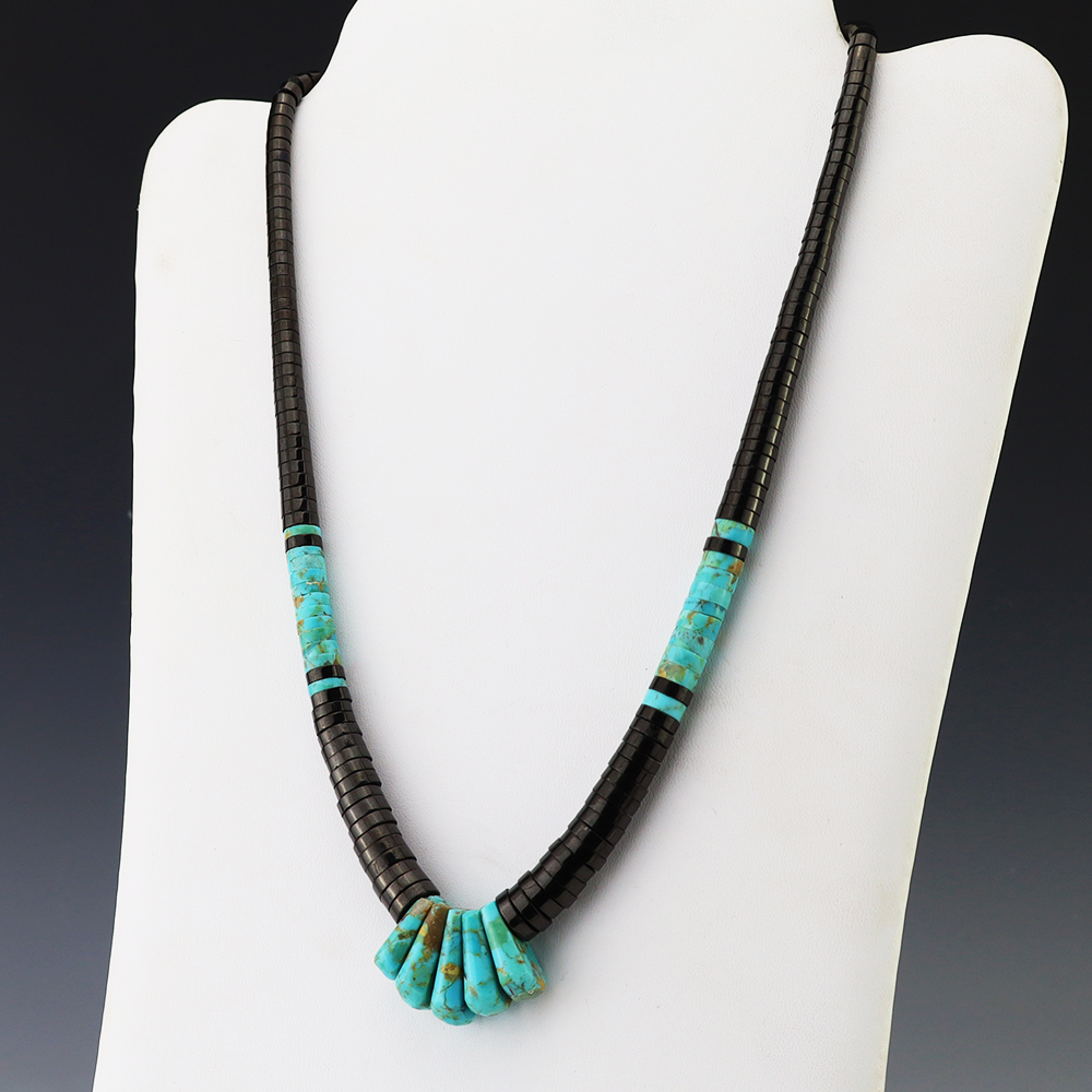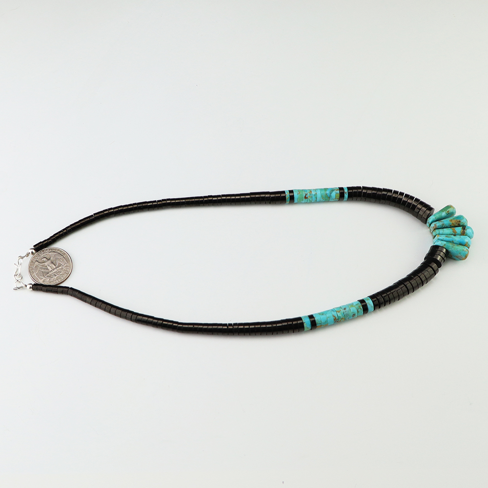 Amazing color combination! Kewa artist Lupe Lovato hand crafted this gorgeous necklace out of Turquoise and Jet. Traditionally made by hand cutting, drilling, rolling, and stringing. Weighs 36 grams. A timeless beauty that you will enjoy for years to come.