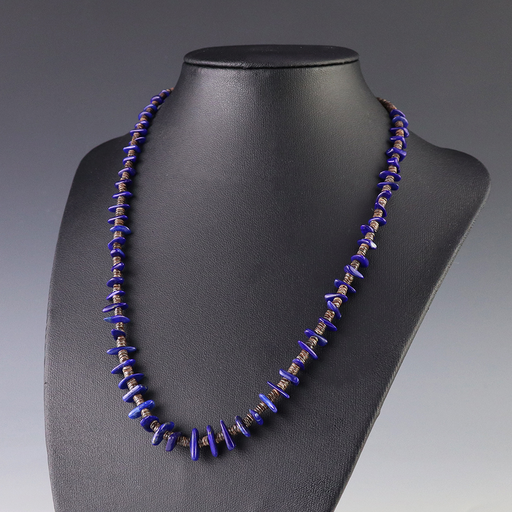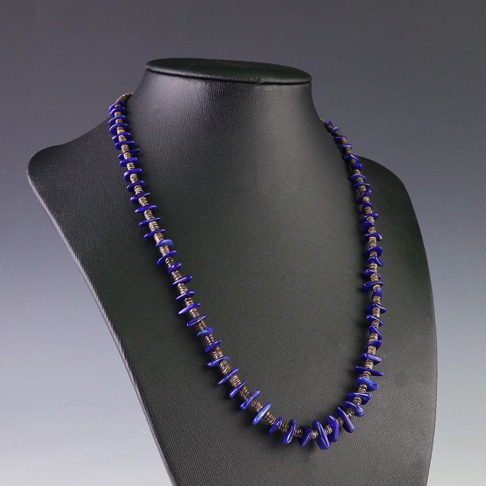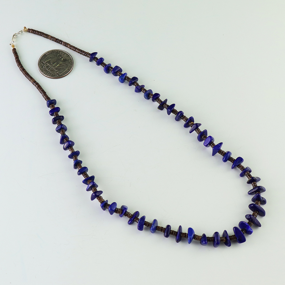 This necklace, hand made by Kewa artist Jeanette Calabaza, is a lovely statement piece. The necklace showcases fine Olive Shell and Lapis. The strand of heishi is finished off with a hook and eye. Weighs 14 grams.