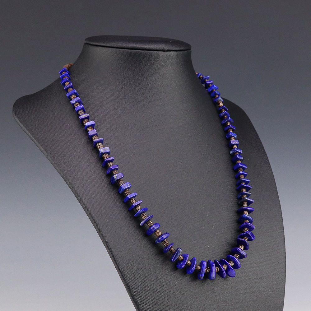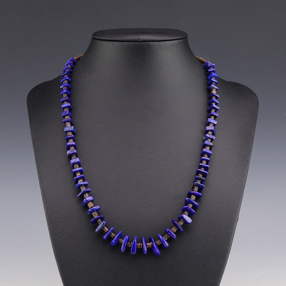 This necklace, hand made by Kewa artist Jeanette Calabaza, is a lovely statement piece. The necklace showcases fine Olive Shell and Lapis. The strand of heishi is finished off with a hook and eye. Weighs 18 grams.