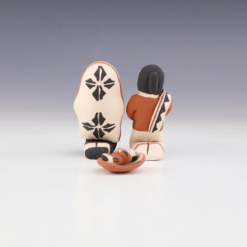 This wonderfully painted storyteller was handmade by Jemez Pueblo potter Chrislyn Fragua and depicts a woman with a baby and a child with a basketball. Chrislyn uses both the coil method and pinch method to create her pottery piece and as in traditional storytellers, Chrislyn’s storytellers have their mouths open. ...