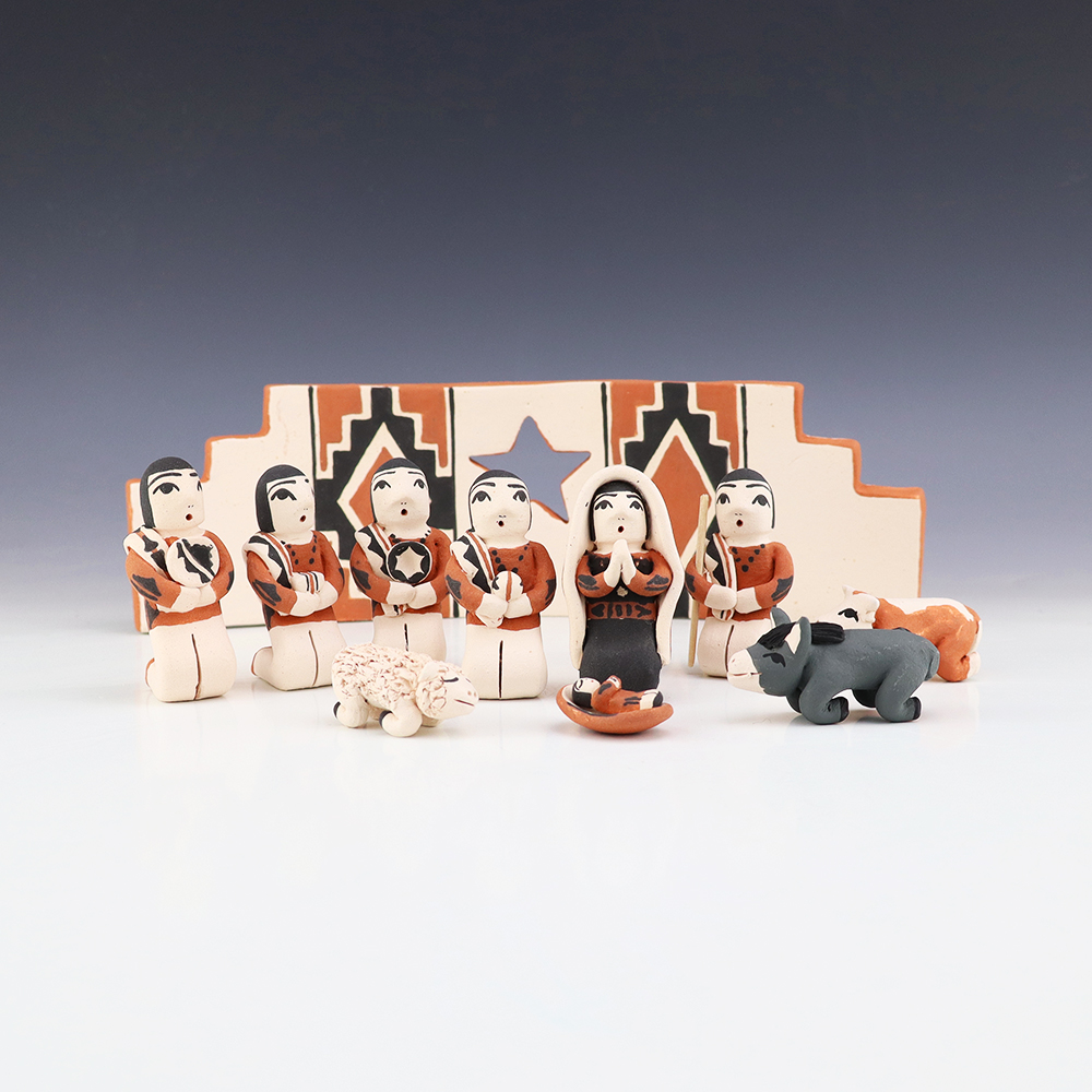 Kewa potters, Angel and Ralph made this exquisite Nativity. Traditionally made and fired using an outdoor kiln. Alluring colors and patterns. This Nativity would be a wonderful addition to your collection of Native American art or pottery. Signed.