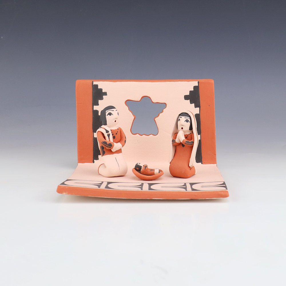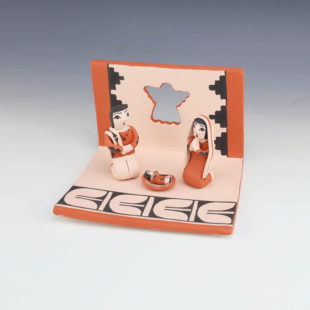 Kewa potters, Angel and Ralph made this exquisite Nativity. Traditionally made and fired using an outdoor kiln. Alluring colors and patterns. This Nativity would be a wonderful addition to your collection of Native American art or pottery. Signed.