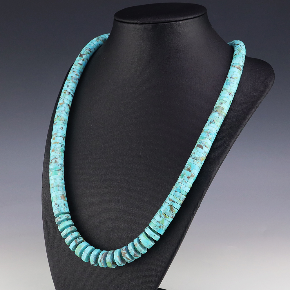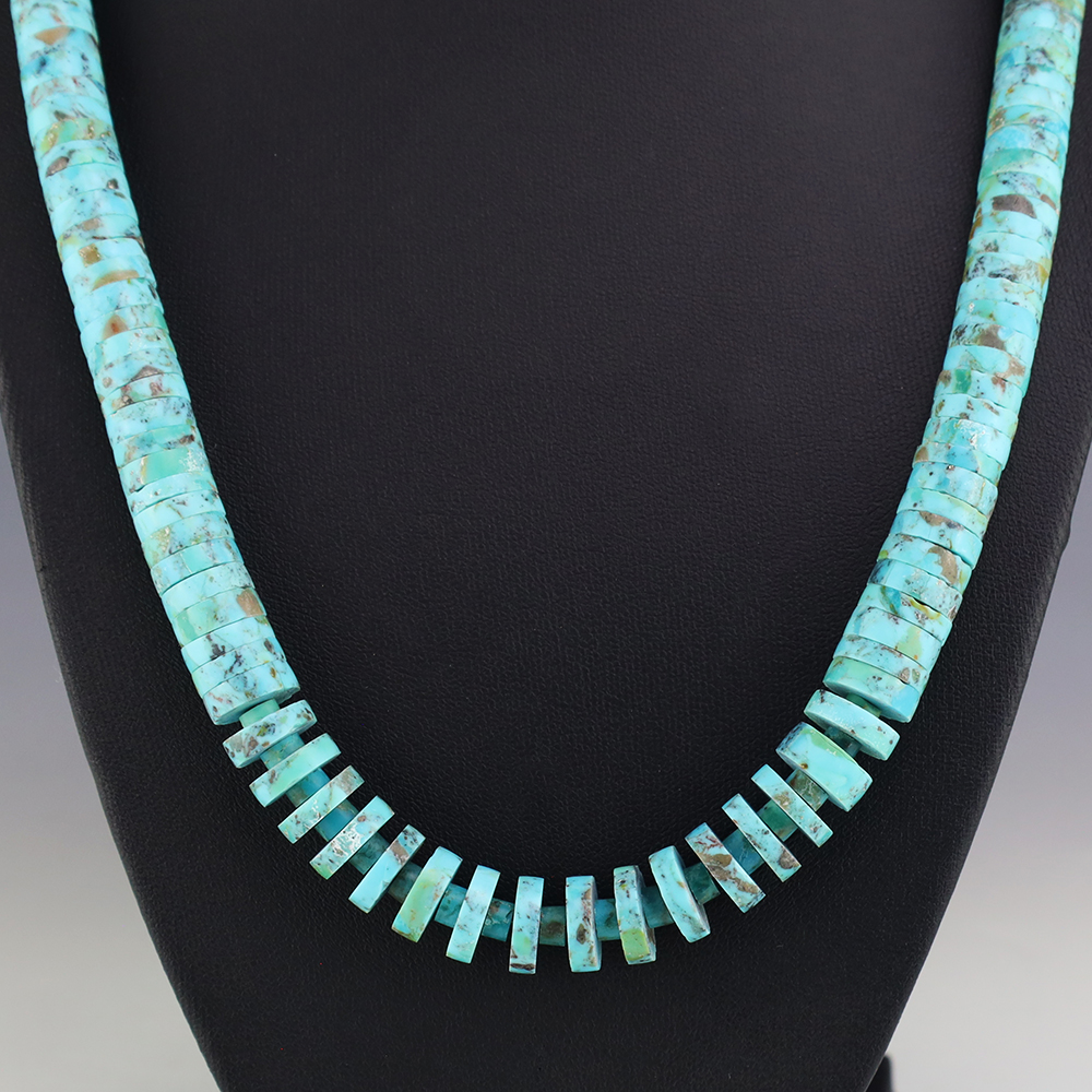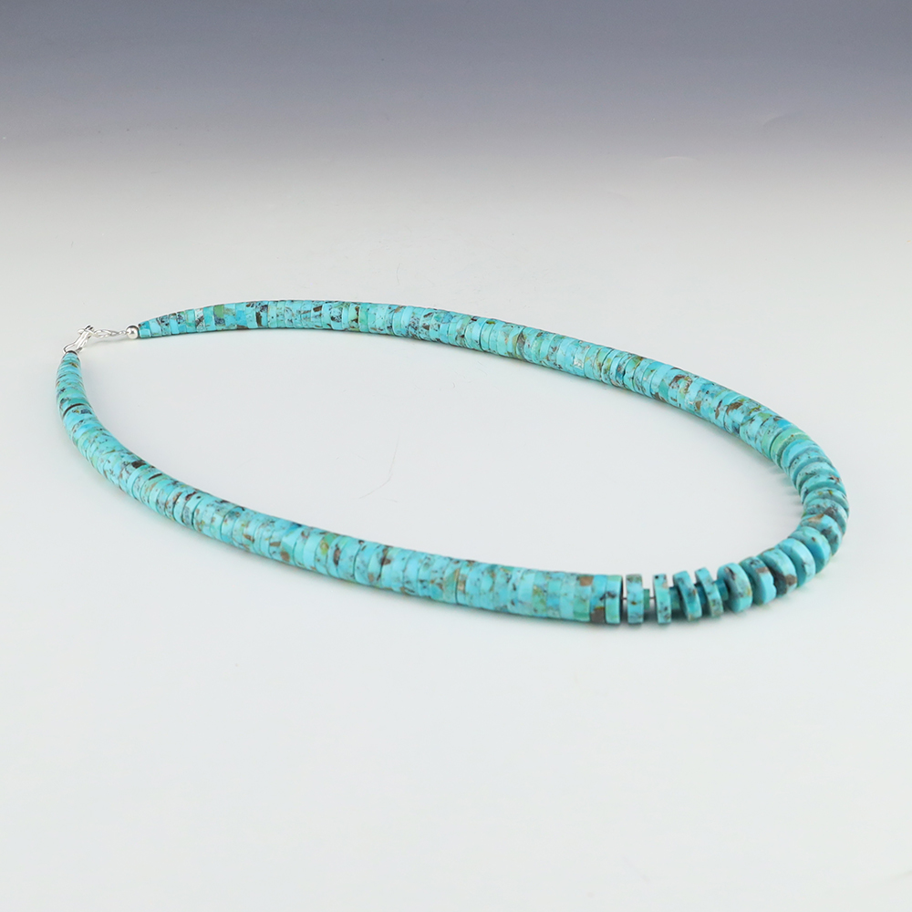 Kewa (Santo Domingo) artists are known for their heishi. The word “heishi“ means “shell” in the Keresan language. Traditionally Santo Domingo jewelry makers created their heishi jewelry out of shell. The shell is hand cut into a flat disc. Today, other stones that Santo Domingo artists cut in this manner, are also referred to as heishi. With modern tools and innovations, artists can create different styles of beads and use different gemstones like turquoise, coral, jet, serpentine, and spiny oyster.