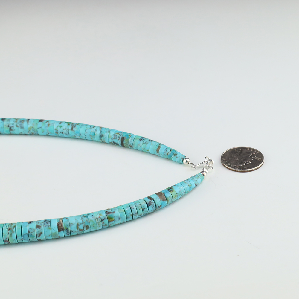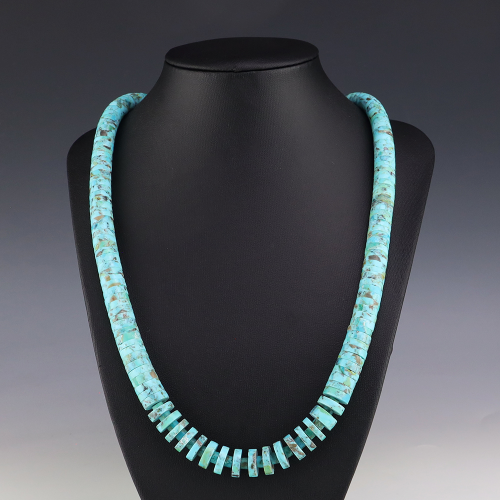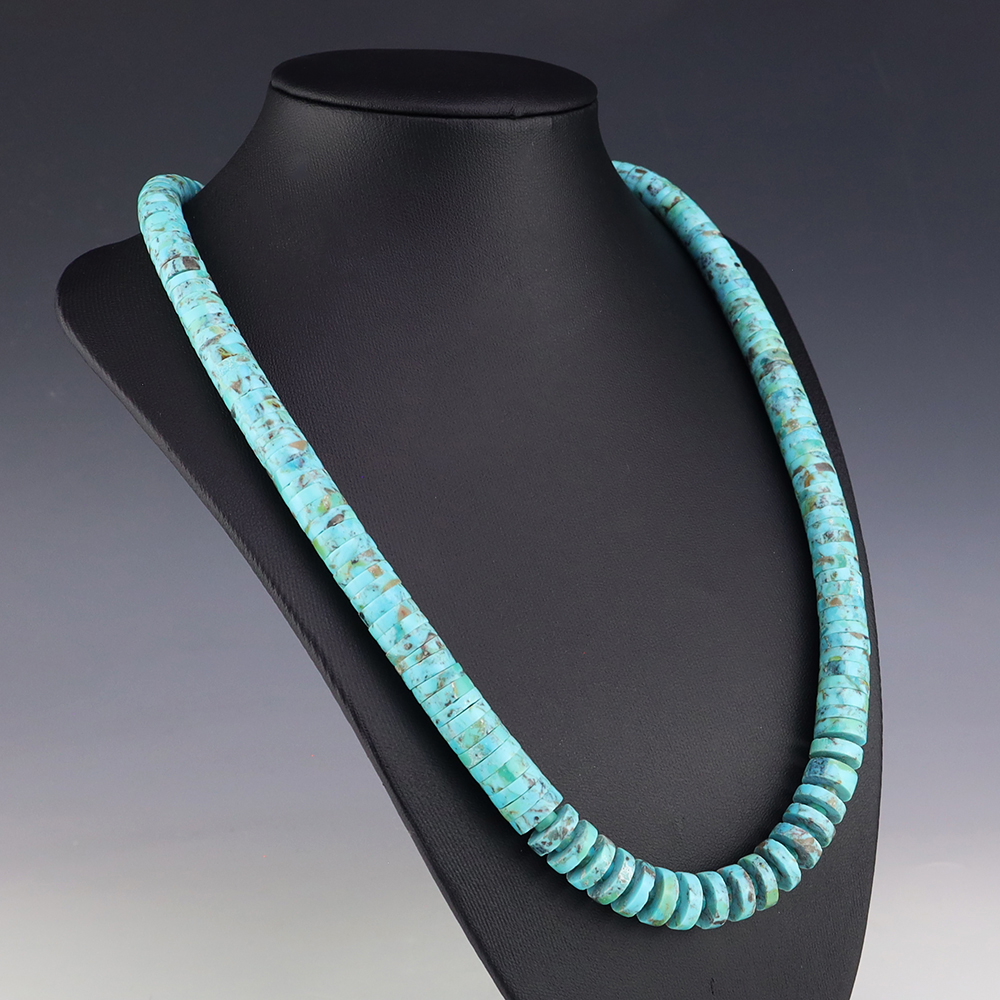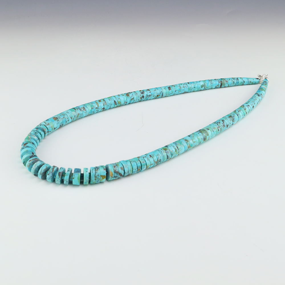 Kewa (Santo Domingo) artists are known for their heishi. The word “heishi“ means “shell” in the Keresan language. Traditionally Santo Domingo jewelry makers created their heishi jewelry out of shell. The shell is hand cut into a flat disc. Today, other stones that Santo Domingo artists cut in this manner, are also referred to as heishi. With modern tools and innovations, artists can create different styles of beads and use different gemstones like turquoise, coral, jet, serpentine, and spiny oyster.