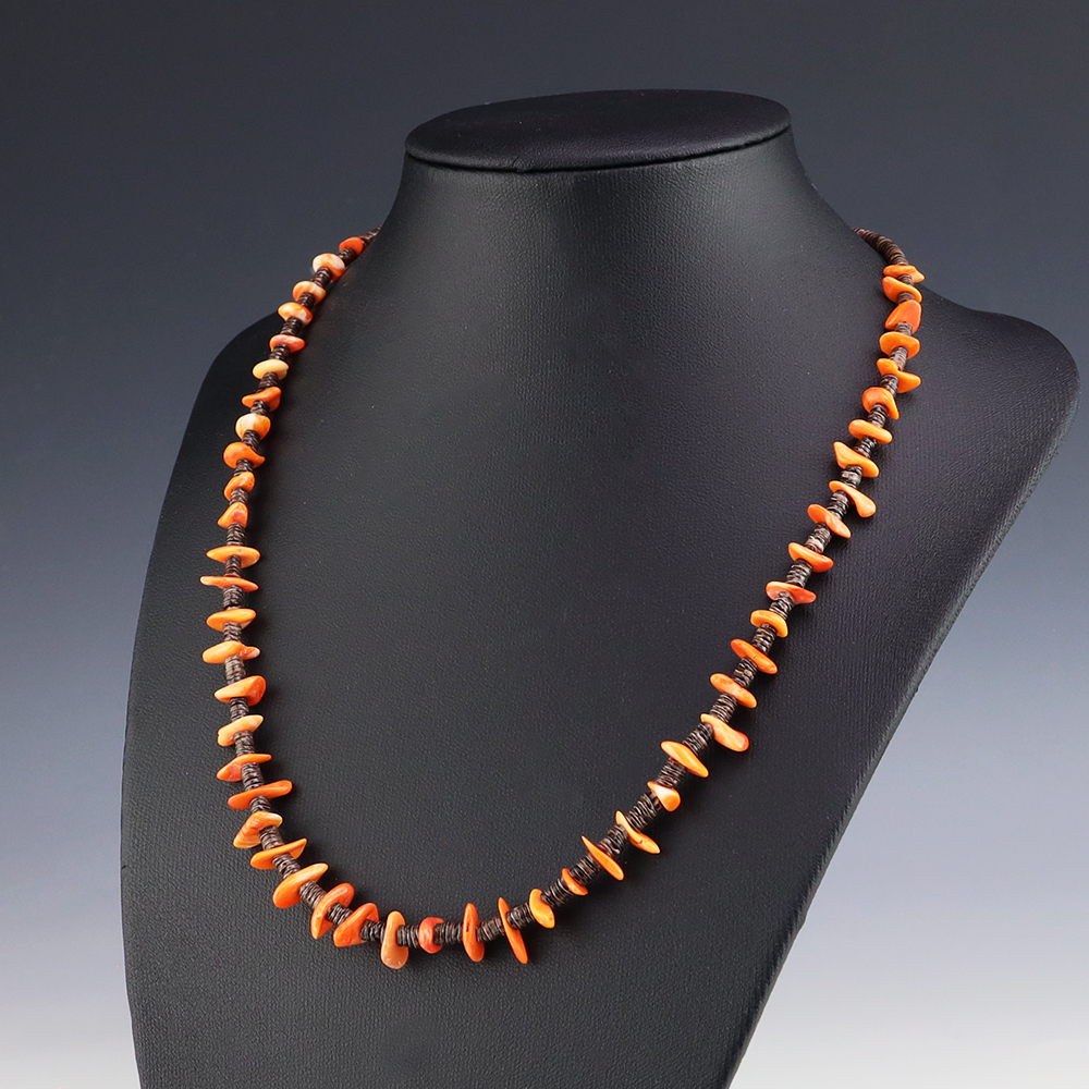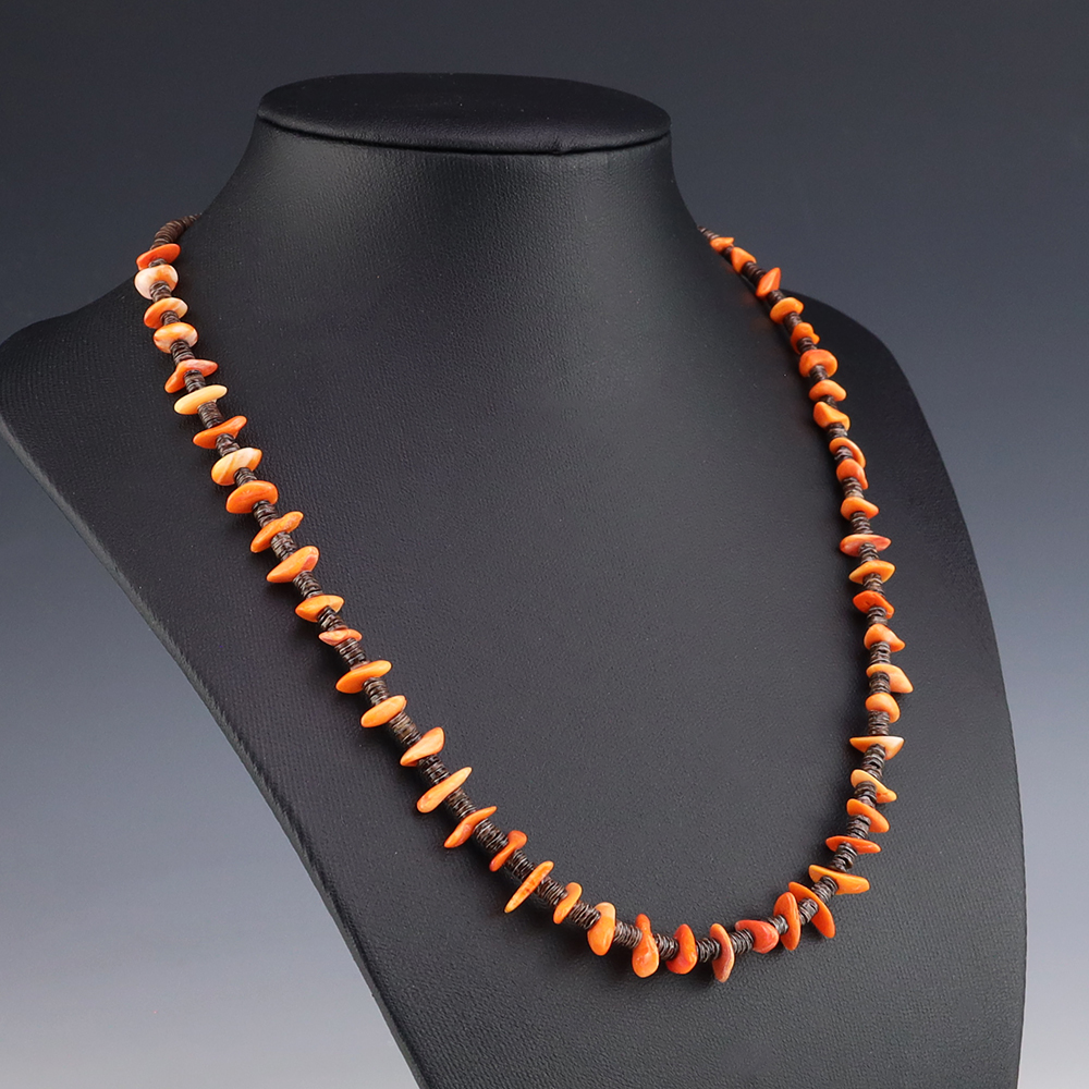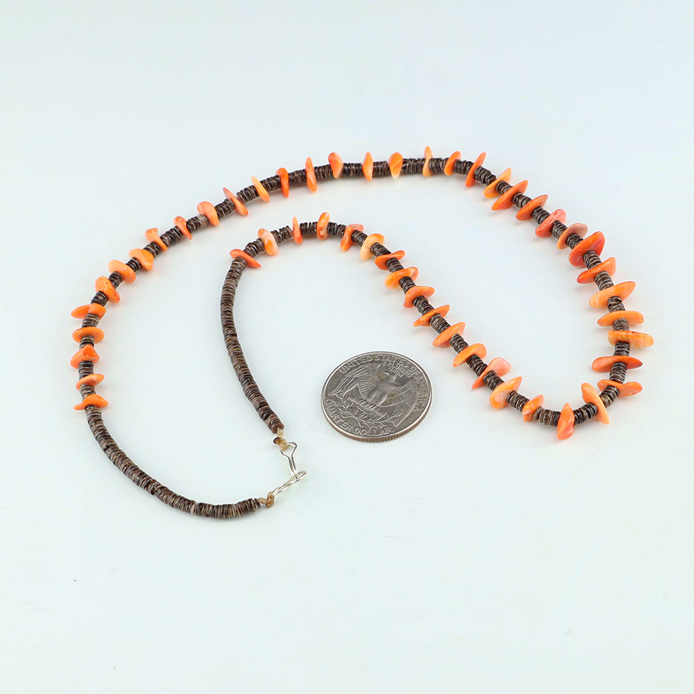 This necklace, hand made by Kewa artist Jeanette Calabaza, is a lovely statement piece. The necklace showcases fine Olive Shell and Spiny Oyster. The strand of heishi is finished off with a hook and eye. Weighs 12 grams.