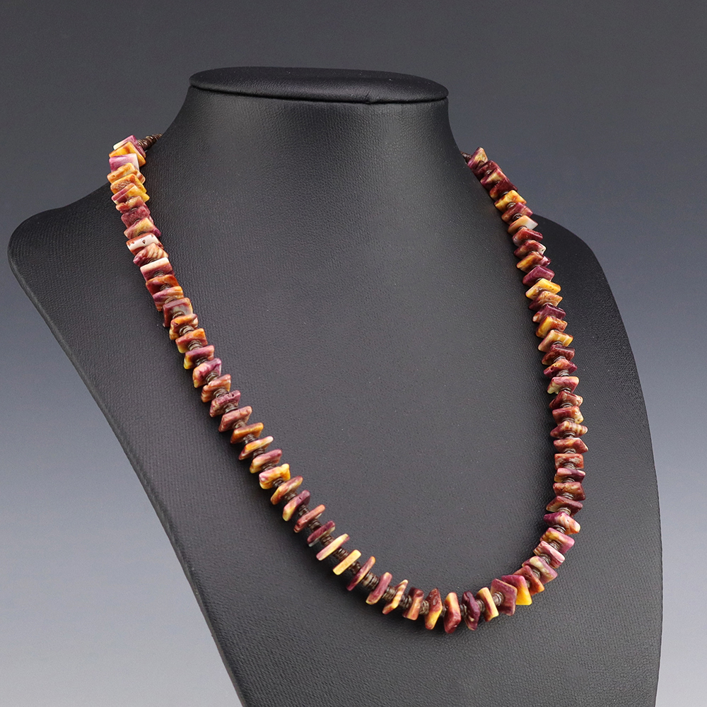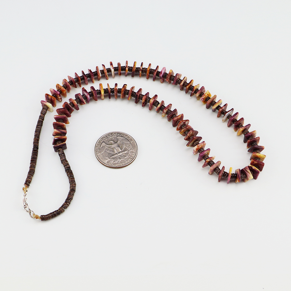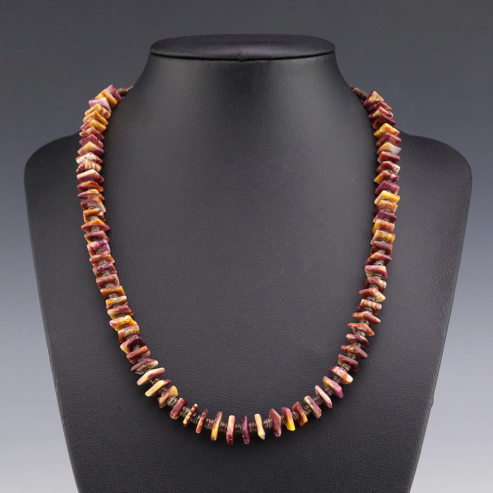 This necklace, hand made by Kewa artist Jeanette Calabaza, is a lovely statement piece. The necklace showcases fine Olive Shell and Spiny Oyster. The strand of heishi is finished off with a hook and eye. Weighs 20 grams.