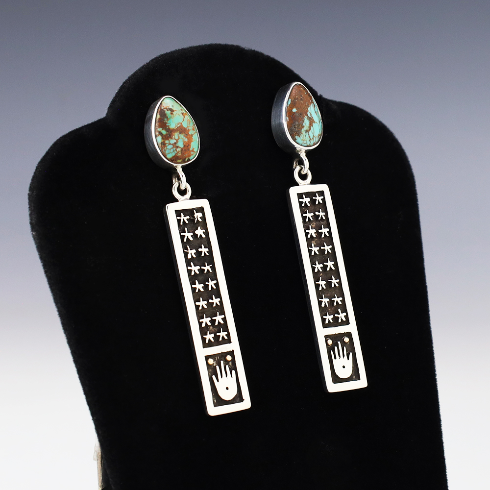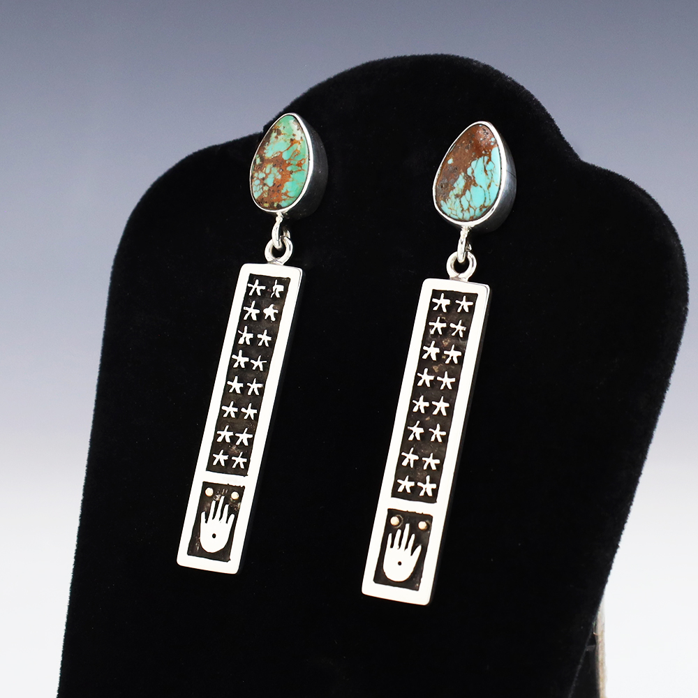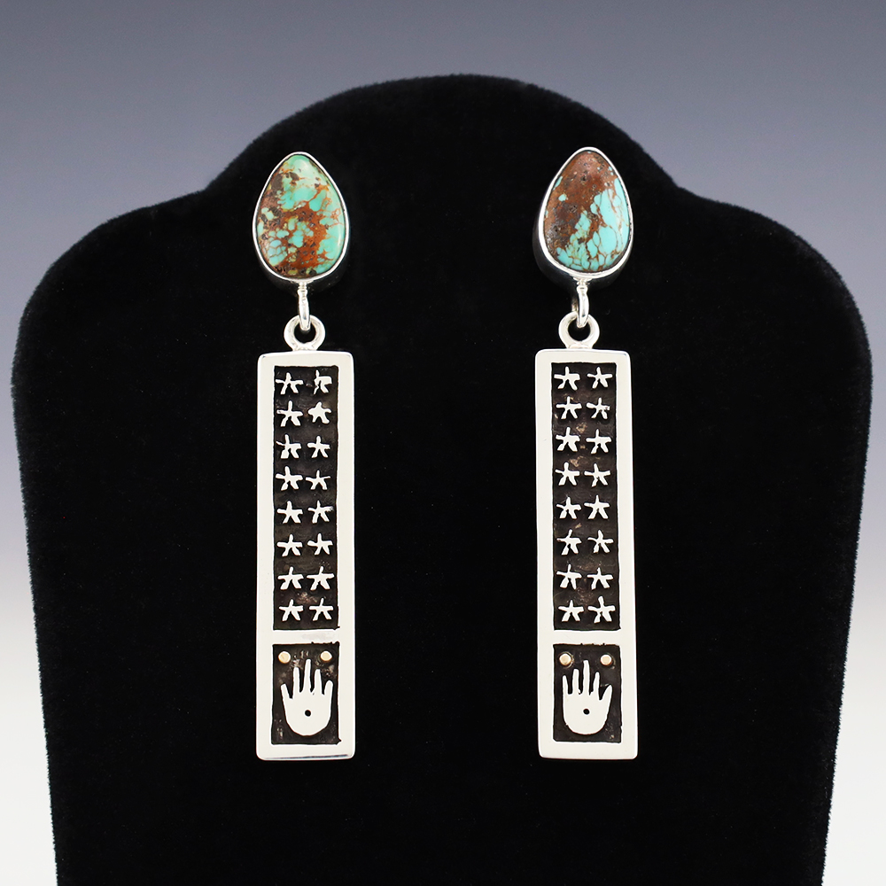 Stunning earrings made by award winning Kewa artist, Joseph Coriz. There is a hand under a starry night sky. Solid 14K gold accents adorn the earrings. Weighs 20 grams. Signed