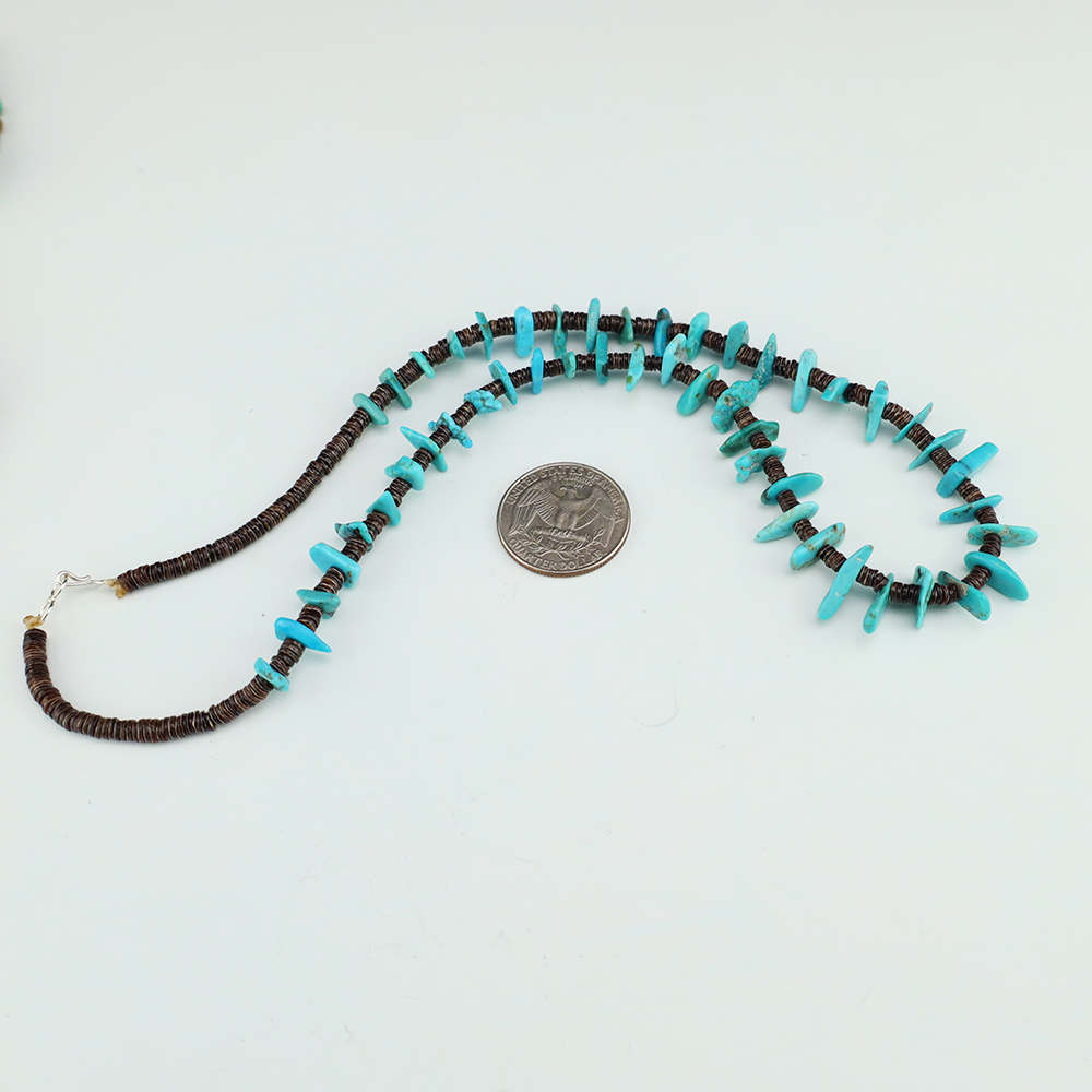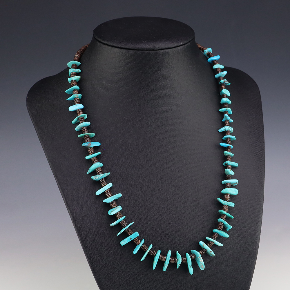 This necklace, hand made by Kewa artist Jeanette Calabaza, is a lovely statement piece. The necklace showcases fine Olive Shell and Turquoise. The strand of heishi is finished off with a hook and eye. Weighs 20 grams.