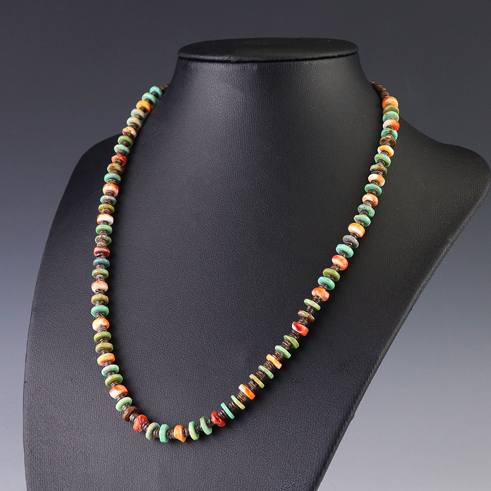 Kewa (Santo Domingo) artists are known for their heishi. The word “heishi“ means “shell” in the Keresan language. Traditionally Kewa jewelry makers created their heishi jewelry out of shell. The shell is hand cut into a flat disc. Today, other stones that Santo Domingo artists cut in this manner, are also referred to as heishi. With modern tools and innovations, artists can create different styles of beads and use different gemstones like turquoise, coral, jet, serpentine, and spiny oyster.