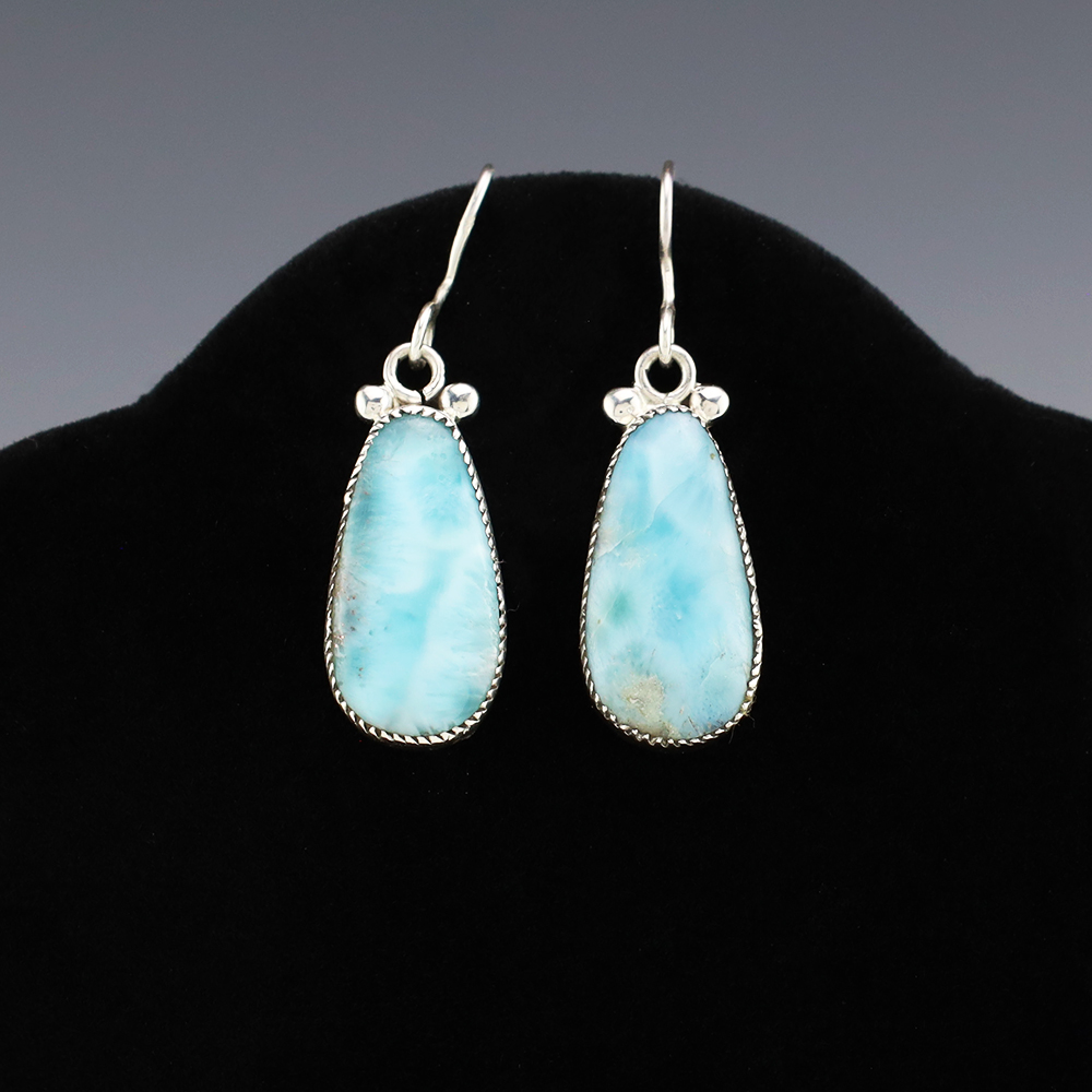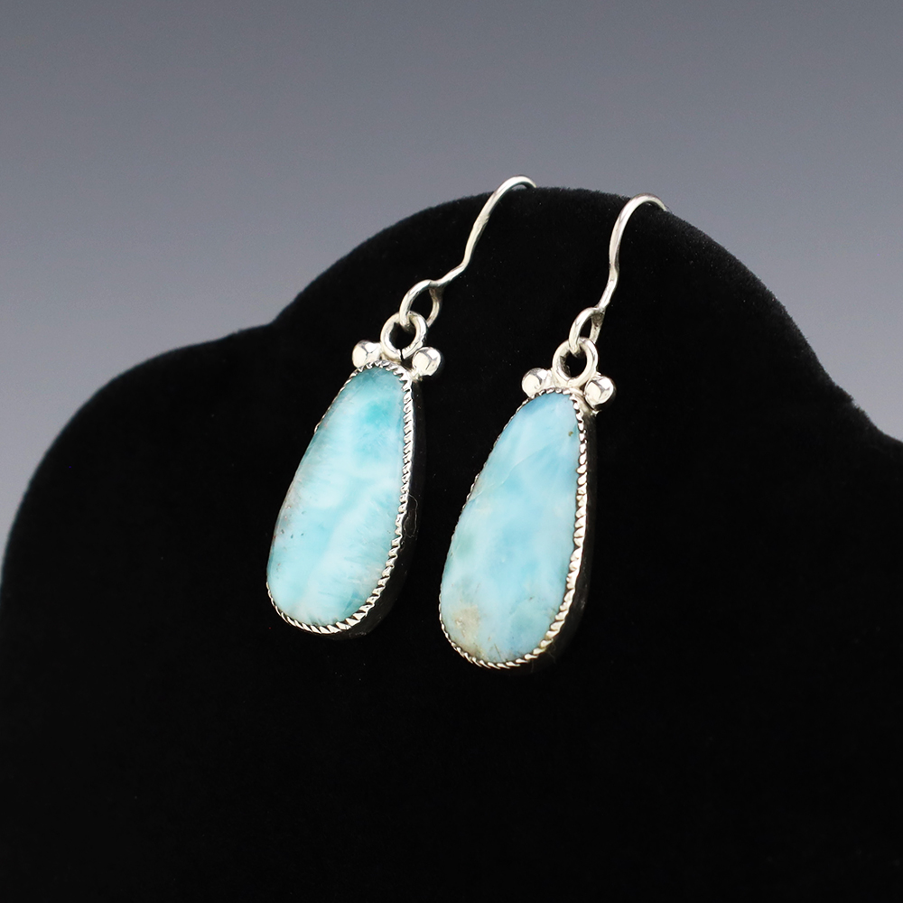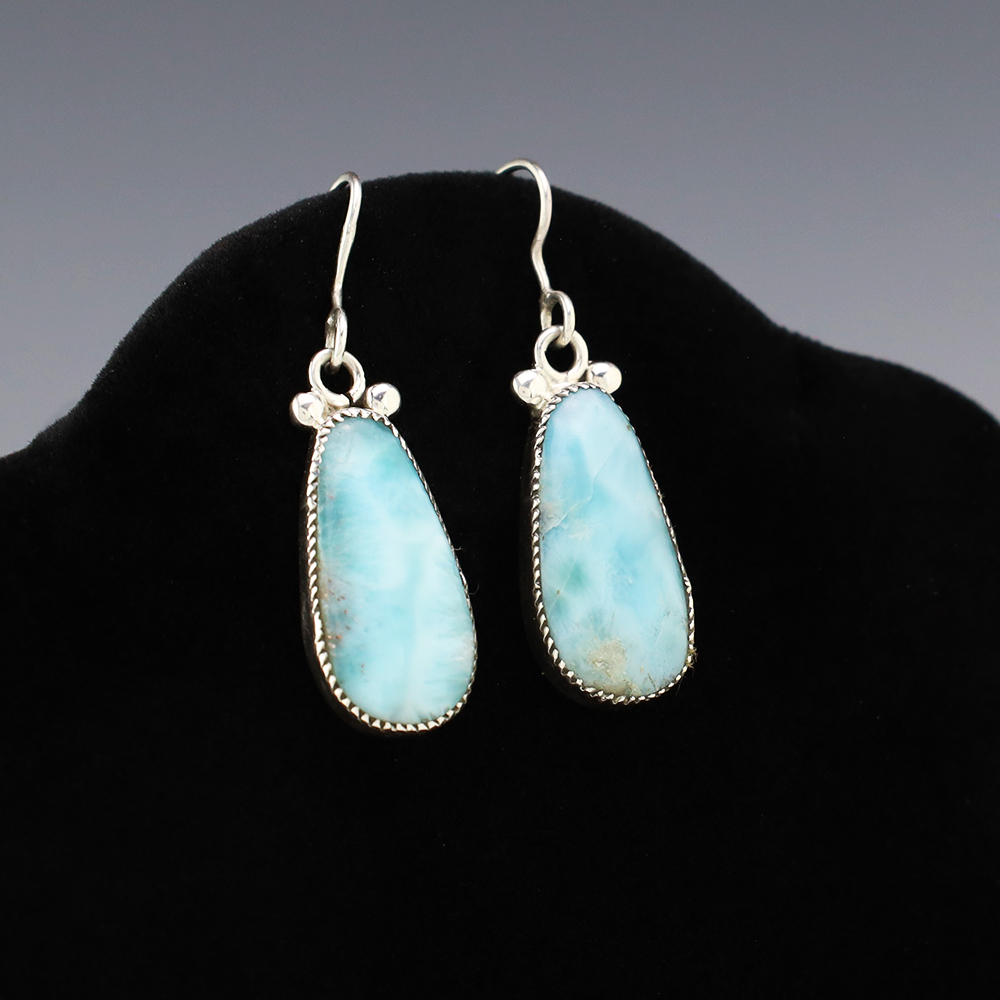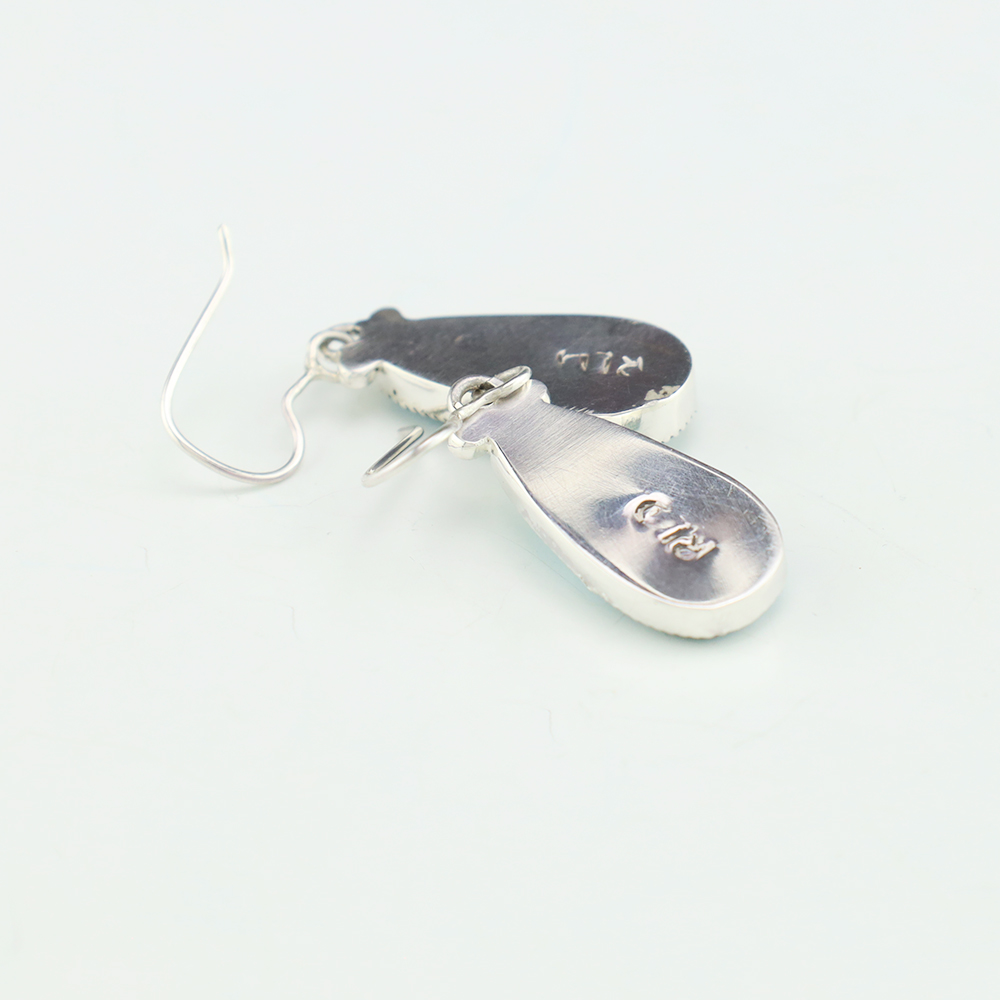 Zuni artist Diane Lonjose made these beautiful earrings. Made out of sterling silver and set with Larimar. The components are all hand fabricated and the stones are all natural. Diane comes from a family of Zuni jewelers. She is the daughter of Alice and Duane Quam, and grandchild of Doris and Wayne Ondelacy. Weighs 6 grams. Signed